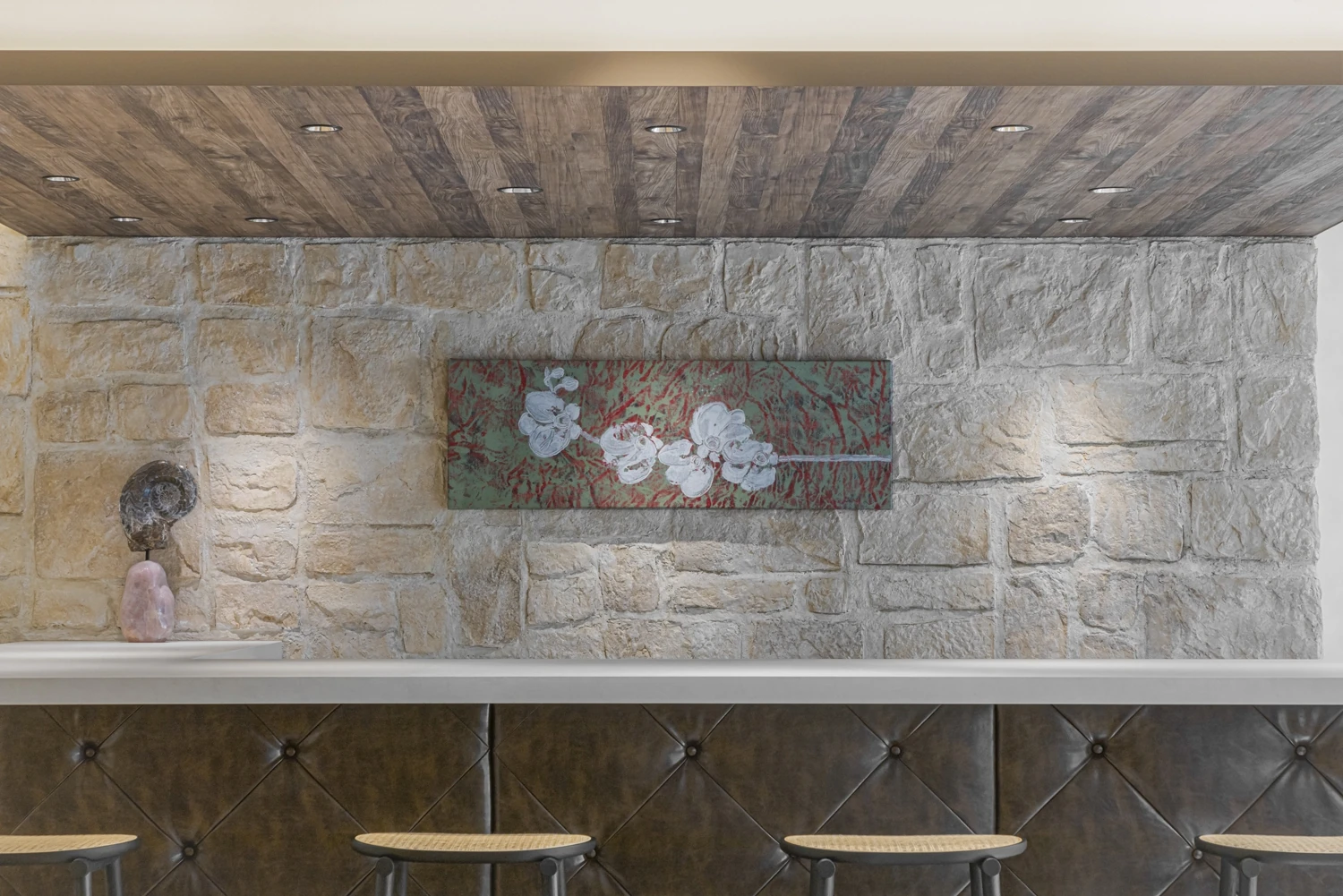 デザインイメージとしてデビス様からいただいたキーワードは、自然素材の温かみを感じる素朴なテイストにモダンさをプラスした「ラスティックモダン」というスタイル。そこにさらにデビス様らしさを加える要素として、企業のルーツであり地中海を想起する「ライムストーン」を取り入れました。人とのつながりと歴史を大事にするという意味で空間のコンセプトは『+HUMANITY&HISTORY』に。パーティーなどの実施も想定しメインエリアはなるべくひらけた空間となるよう、サンプルエリアや会議室を間仕切る壁にはガラスを用いました。バーカウンターのエリアは間接照明を配置した下がり天井、地中海の建築材として用いられる「ライムストーン」をイメージした特殊塗装を施し、ショールームを訪れた瞬間にデビス様の世界観に引き込まれるようデザインしています。照明の色味や配灯などさまざまなシーンを想定してディテールにもこだわりました。