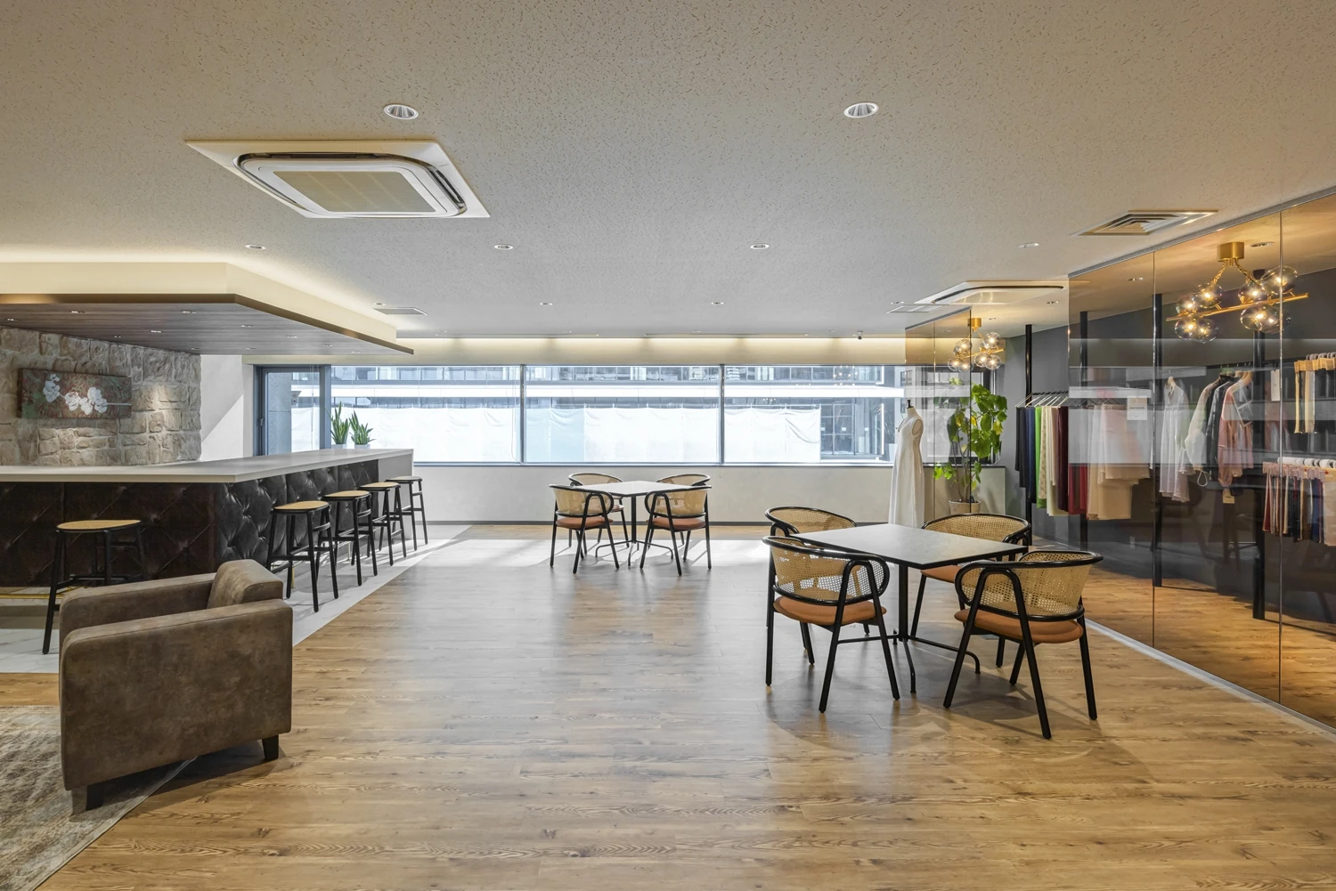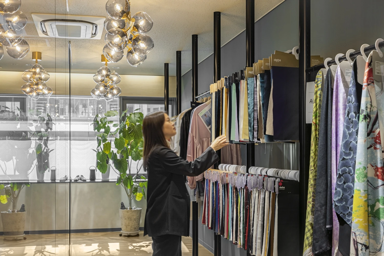 「アパレル業界内における自社の価値向上、他社との差別化できる空間」を目的としたショールームの開設プロジェクト。京都工場の閉鎖にともない、その場所に保管していたテキスタイルの集約も目的のひとつでした。社員一人ひとりが革新と伝統を重んじる姿勢と、家族のようなコミュニケーションやつながりを重視するデビス様の文化を尊重できるような空間を目指しました。 -