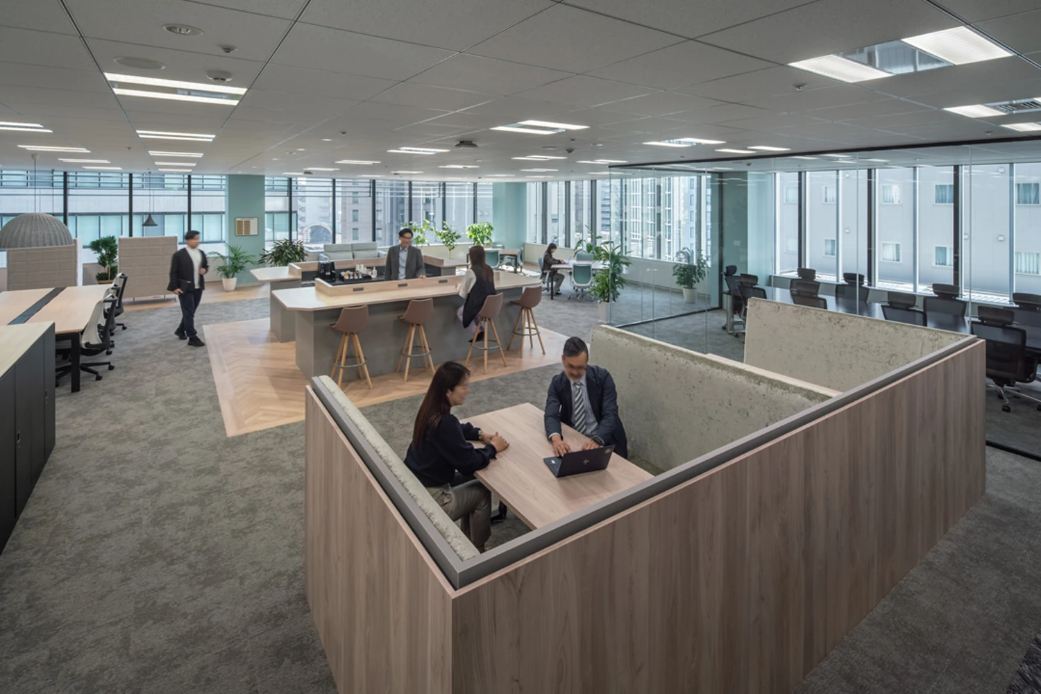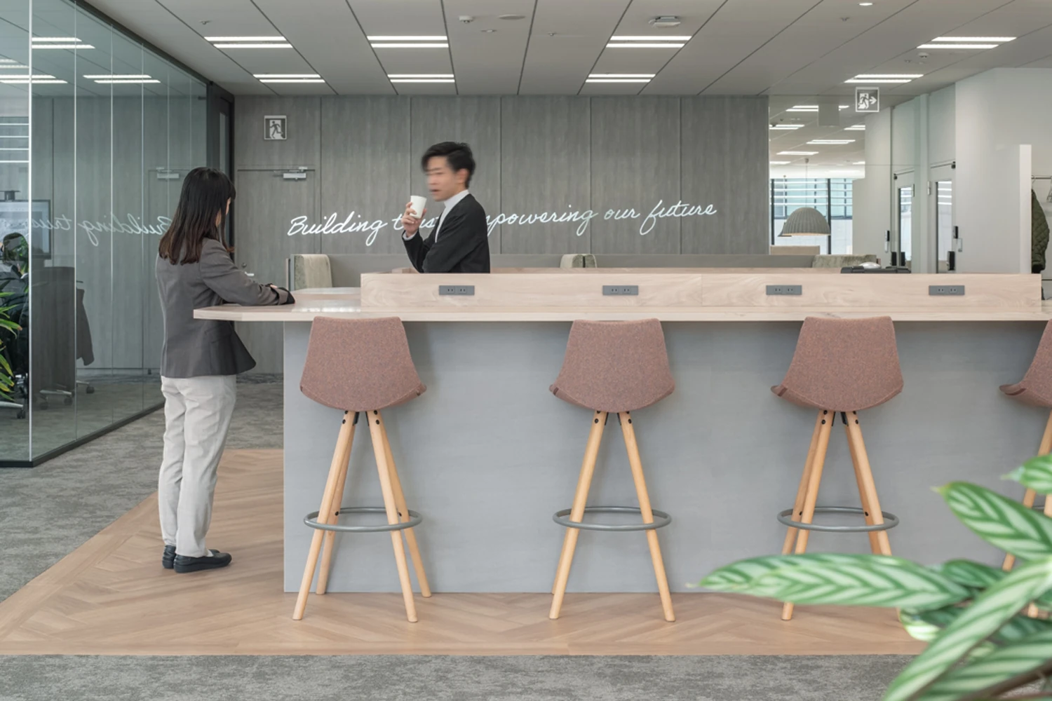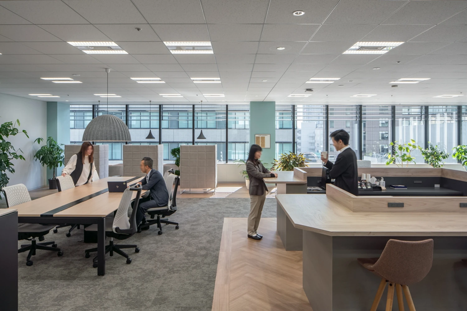 全てを否定し変えるのではなく考え方や捉え方の枠組み(フレーム)を変えることで、出来事に別の視点をもち、新たな価値に気付くという課題との向き合い方を表しています。エントランスは公認会計士としての格式を表現するため、トーンが暗めのウッド素材を使用して重厚な雰囲気を再現。一方で執務エリアは固すぎないペールトーンの什器でまとめ、落ち着いた雰囲気の中で集中して仕事ができるようバランスを取りました。センターに設置したバーカウンターのような造作什器は、利用者が集まるマグネットスペースの役割を果たしています。運用面でも、全席フリーアドレスになり、自由な働き方を実現したことで活気のある空間が生まれました。