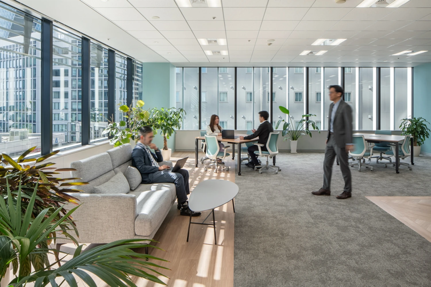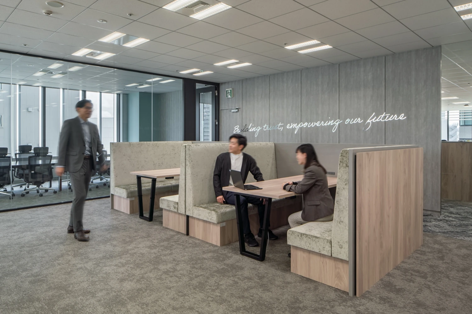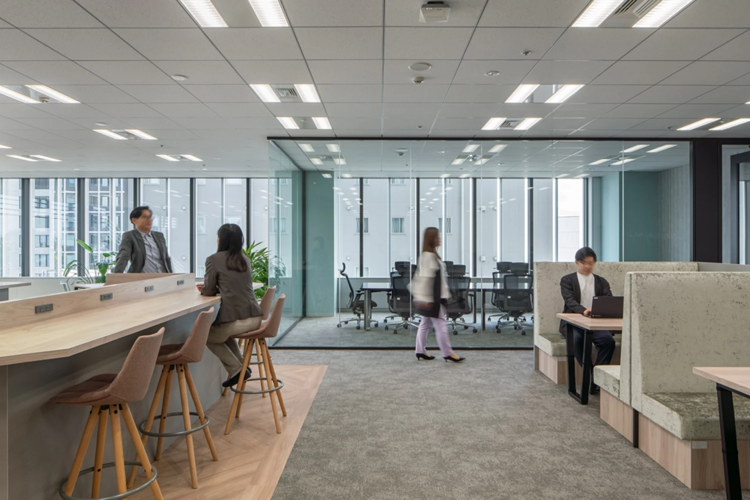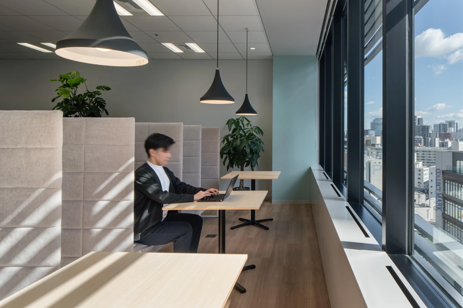 全てを否定し変えるのではなく考え方や捉え方の枠組み(フレーム)を変えることで、出来事に別の視点をもち、新たな価値に気付くという課題との向き合い方を表しています。エントランスは公認会計士としての格式を表現するため、トーンが暗めのウッド素材を使用して重厚な雰囲気を再現。一方で執務エリアは固すぎないペールトーンの什器でまとめ、落ち着いた雰囲気の中で集中して仕事ができるようバランスを取りました。センターに設置したバーカウンターのような造作什器は、利用者が集まるマグネットスペースの役割を果たしています。運用面でも、全席フリーアドレスになり、自由な働き方を実現したことで活気のある空間が生まれました。