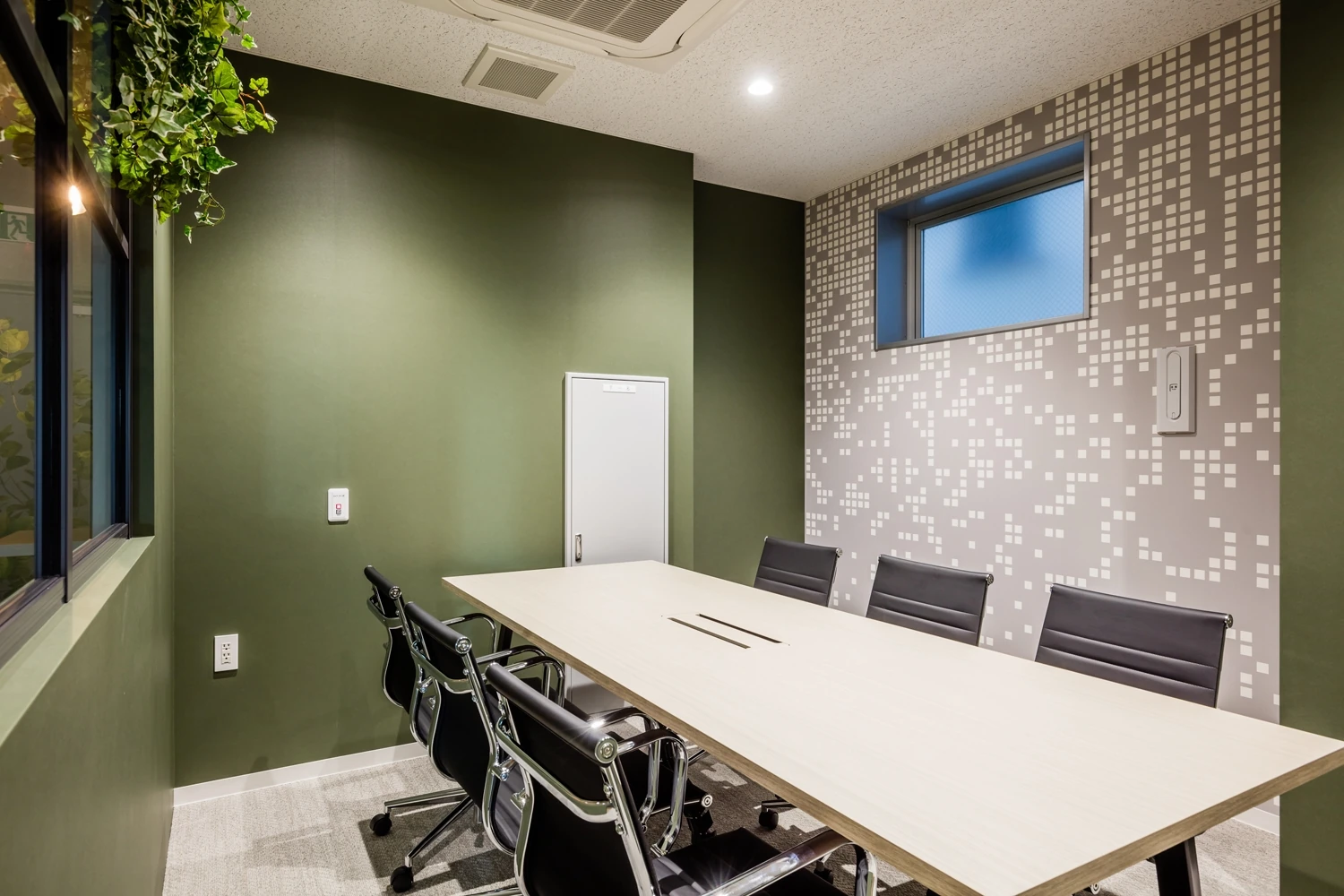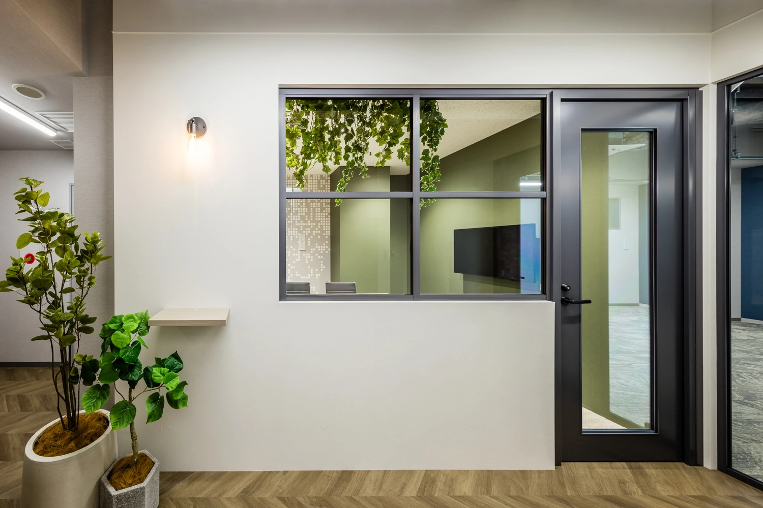 躯体の形を活かしながらエントランスはコンパクトにまとめ、ワークスペースを広く確保することで開放感のある印象を目指しました。コンセプトである『first period.』は、入居したお客様が25坪の空間をきっかけに新たな第一歩を踏みだせるよう「拠点」という意味が込められています。採光がとれる窓を大きく確保したエリアには、カフェのように使えるリフレッシュスペースを配置しました。6階、8階に関してはハーフセットアップオフィスになっているため、入居者の好みによって家具やレイアウト変更ができ、選択肢が広がる仕様となっています。デザインは既存の素材を活かしつつナチュラルで柔らかい色味のマテリアル、植栽を各所に取り入れることで親しみやすく心地よい空間に仕上げました。また、さまざまな事業の企業様に活用イメージを持ってもらえるよう各階のデザインパターンを変えることで、企業イメージによって空間を選択できるような工夫も行っています。