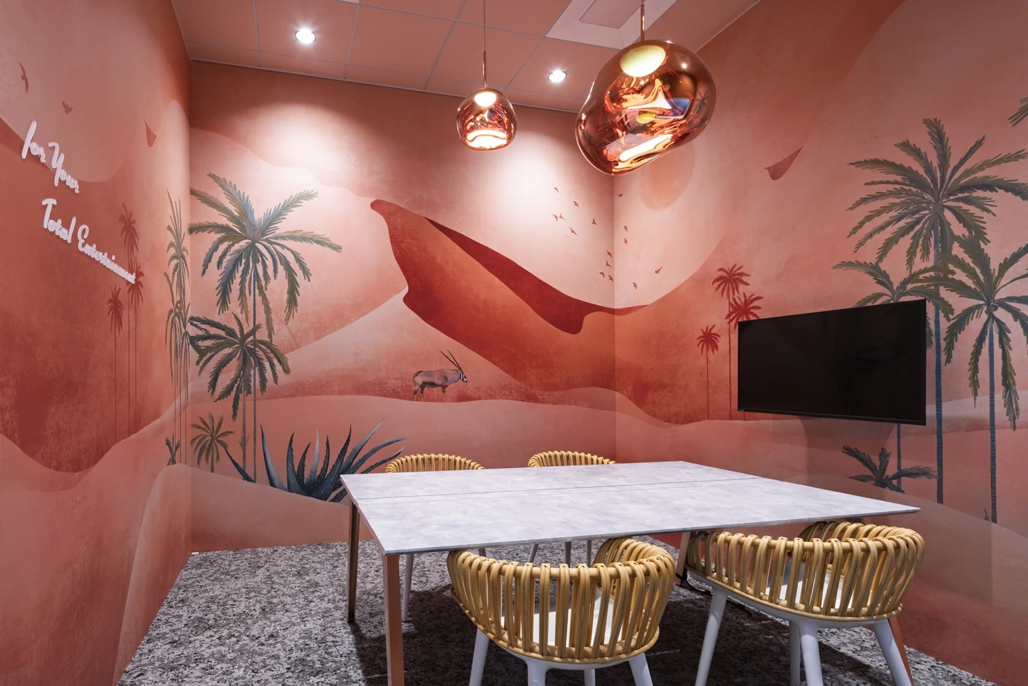 YTE様がエンタメ企業であることを踏まえ「エンタメとは何か?」という問いから紐解き、コンセプトを策定。人が人生を豊かにそして幸せに過ごすためにエンタメは大事なエッセンスであり、国籍・言語・文化・性別・年齢・地位すべての壁を越えてつながり、ひとつにするような心を豊かにするために欠かせないもの。」という想いのもと『BORDERLESS』というコンセプトのもと設計しました。オフィスの中央動線を「BORDERLESS LINE」とし、果てなく続く空と海を表現。そこから繋がる各会議室や執務室には、さまざまな世界へのつながりやエンタメ的な驚きがある世界観を表現しました。また、YTE様のコーポレートカラーであるブルーが果てなく続く空と海、また世界の取引先や消費者と空と海で繋がっていることをオフィス空間で表現しました。各エリアをコンセプトに沿って、「SPACE(宇宙)、STRATUM(地層)、BREEZE(風)、CORAL REEF(サンゴ礁)、OASIS(オアシス)、JUNGLE(ジャングル)、AURORA(オーロラ)」と命名し、それぞれのテーマに沿った空間をデザインしました。それぞれの会議室にある「For Your Total Entertainment」のメッセージはそれぞれのコンセプトに沿うよう素材を変えて、より世界観を体感できるように工夫。ワークエリアの壁面には同じメッセージをモールス信号で表現したものをモチーフに壁一面をデザインし、オフィス全体の表現を通してエンターテイメントを感じられる空間としました。