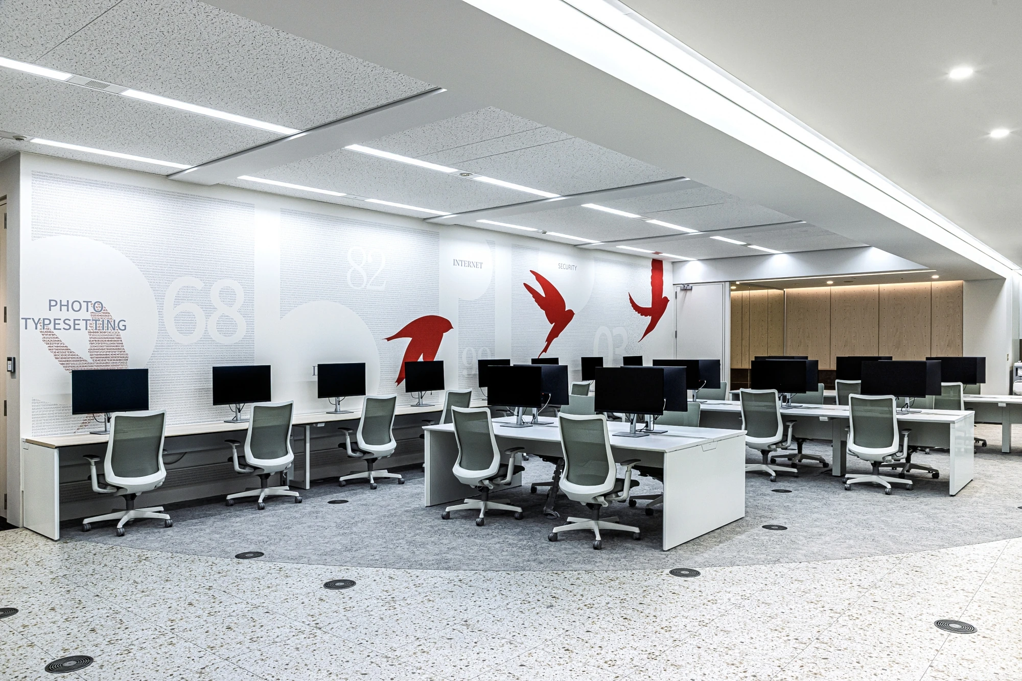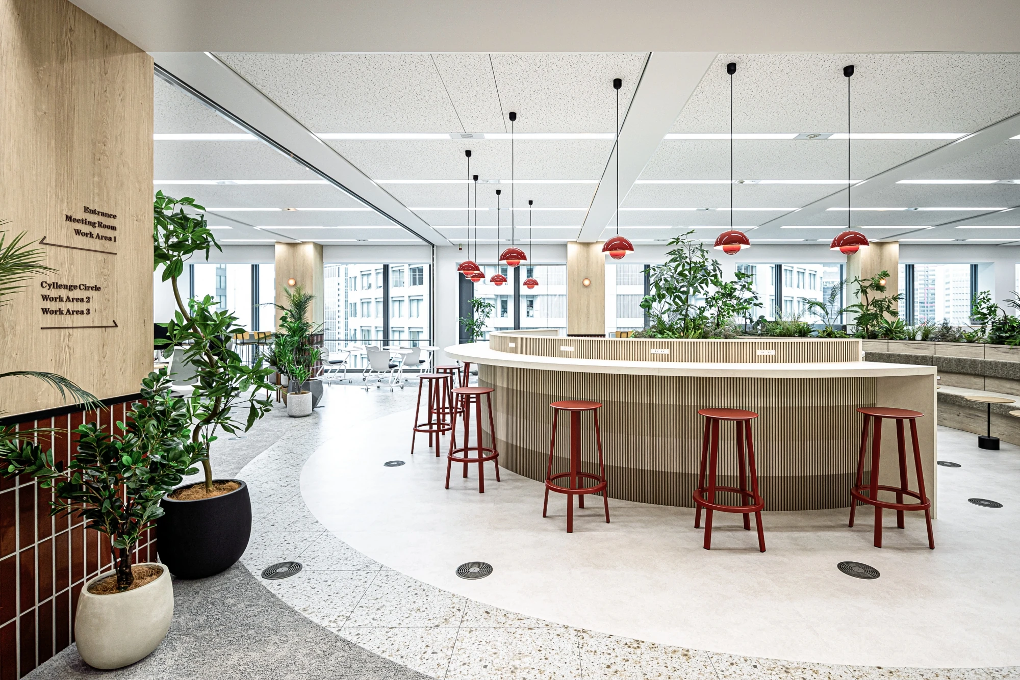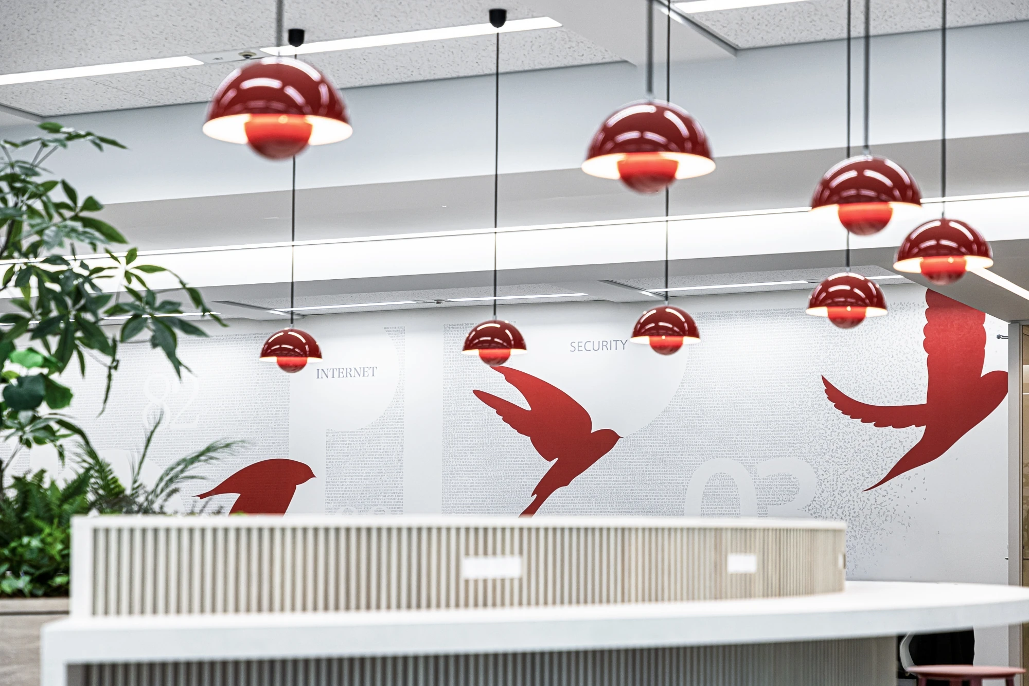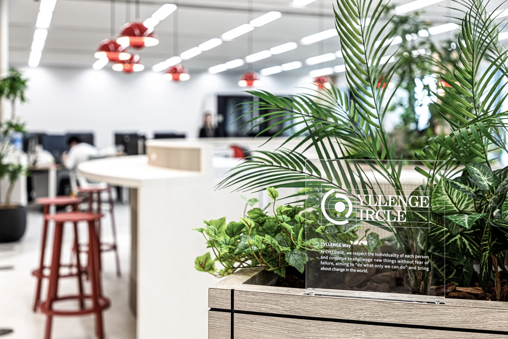 CYLLENGE様が設定したコンセプト『私たちにしかできない価値創造空間』をもとに、通称「CYLLENGE CIRCLE」というオフィスの中央にサークル型のカウンターを設置し、自然なコミュニケーションを誘発するようなオフィスを設計。コーポレートカラーの赤をアクセントに、マテリアルやプランニングでCYLLENGE様らしさを表現しつつ「今までの50年、これからの50年」を感じられるように、事業内容とブランドストーリーを表現できるようデザインしています。また、同じテーマで壁面グラフィックも制作。CYLLENGE様の始まりの事業である「写真植字」から着想を得て、それぞれの時代に近い時期に開発されたフォントを使用し、コンピューターで利用する16進数の羅列の中に沿革の文章を組み込むことで歴史を感じられる空間をつくりました。また、時代の変化に応じて求められるものを素早く見極め、進化し続ける姿を、鳥の羽ばたきをモチーフにして表現しているのも特徴となっています。