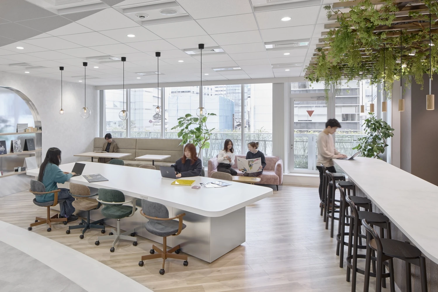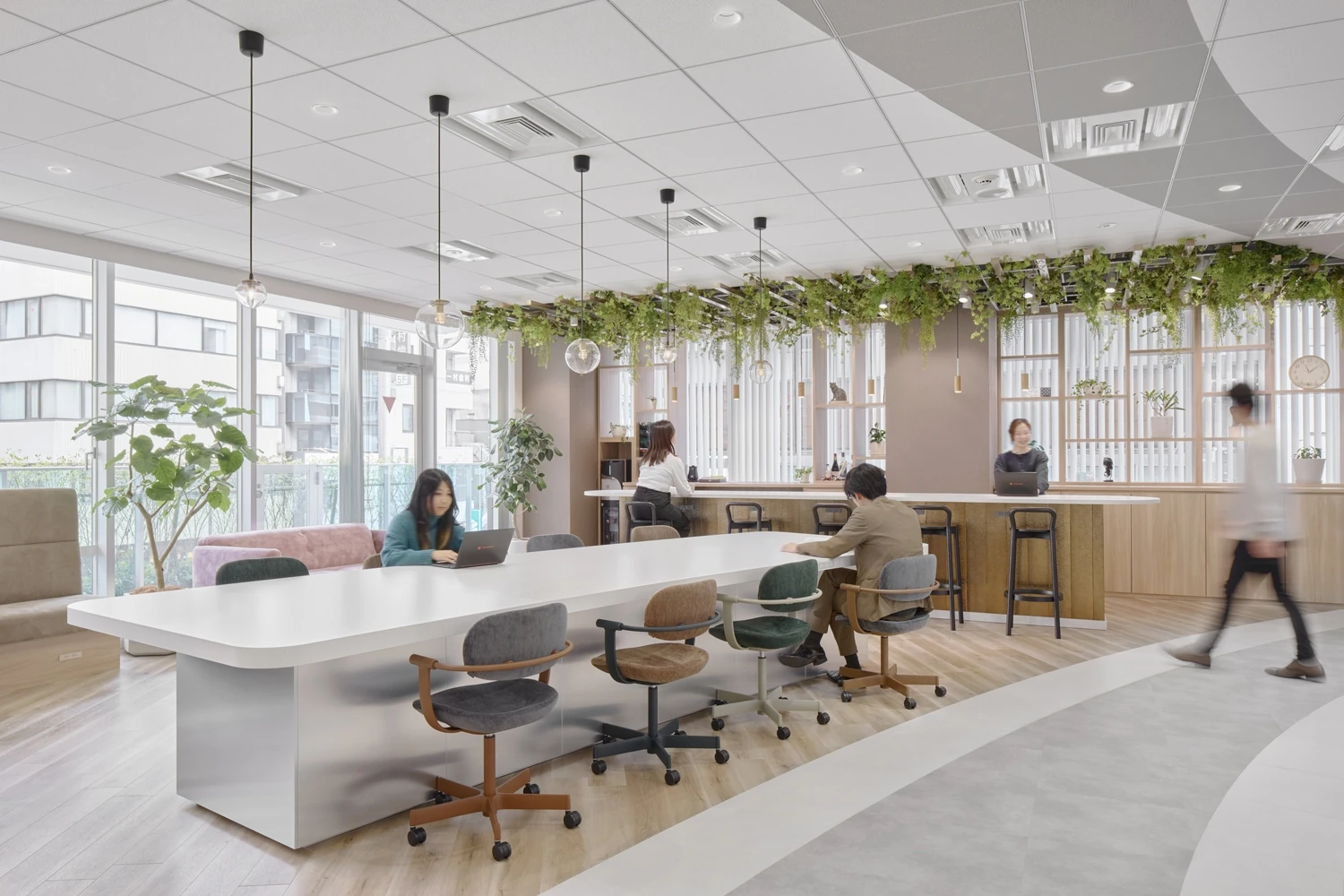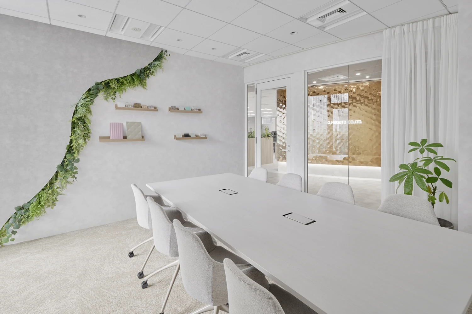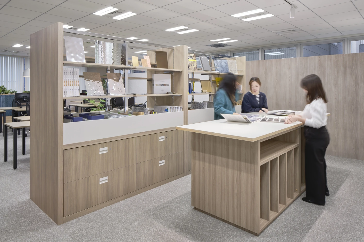 特にエントランスにはインパクトのある大きなアルミパネルを使用し、素材を選ぶエリアだけでなくオフィス全体がショールームとして機能するような工夫を施しています。デザインは優しい色味のマテリアルを中心にコーディネートし、明るいウッド素材を取り入れることで柔らかいイメージの空間に。ところどころにグリーンを取り入れることでリラックス効果も期待できます。リフレッシュスペースにはカウンターやビックテーブルを設置し、作業も休憩もできる空間として、コミュニケーションを誘発できる空間になっています。