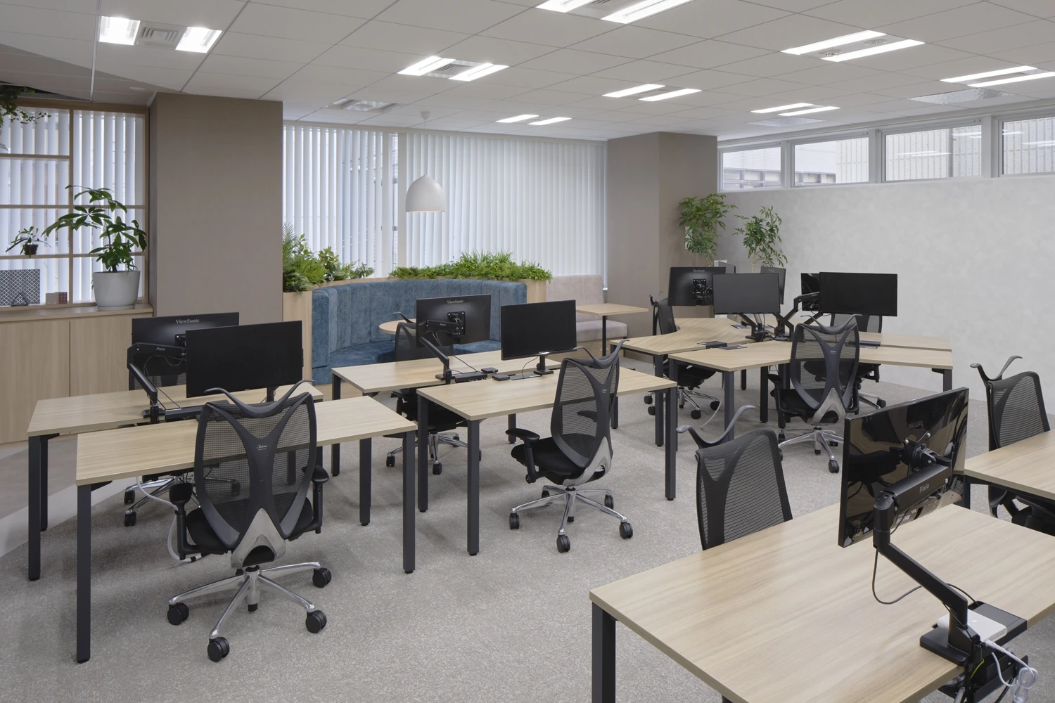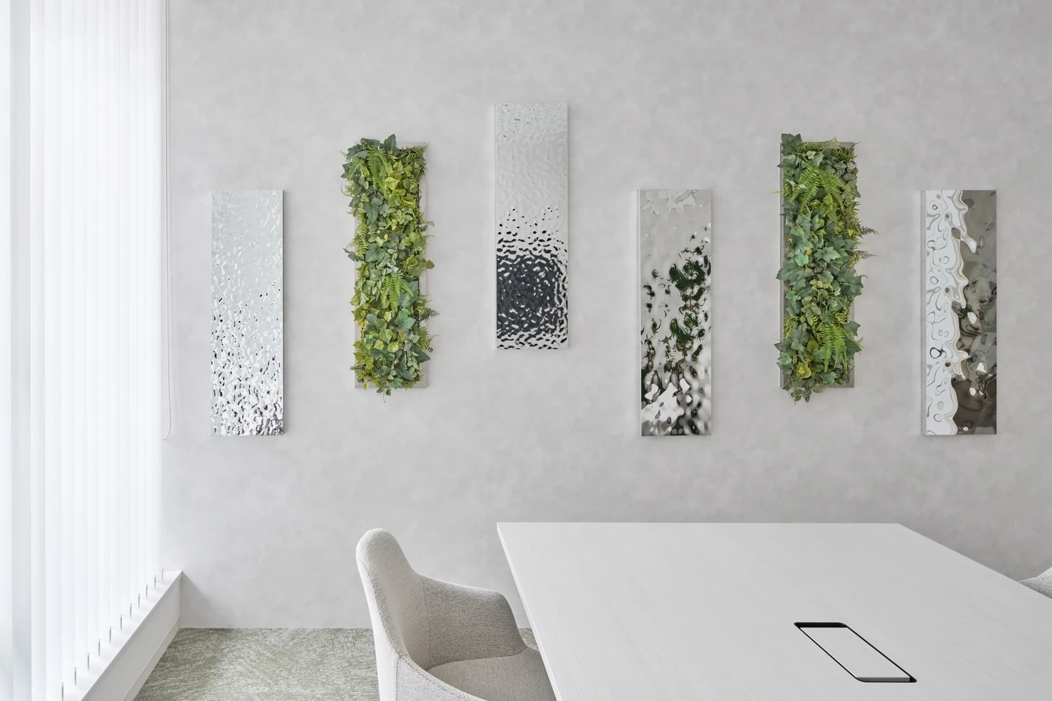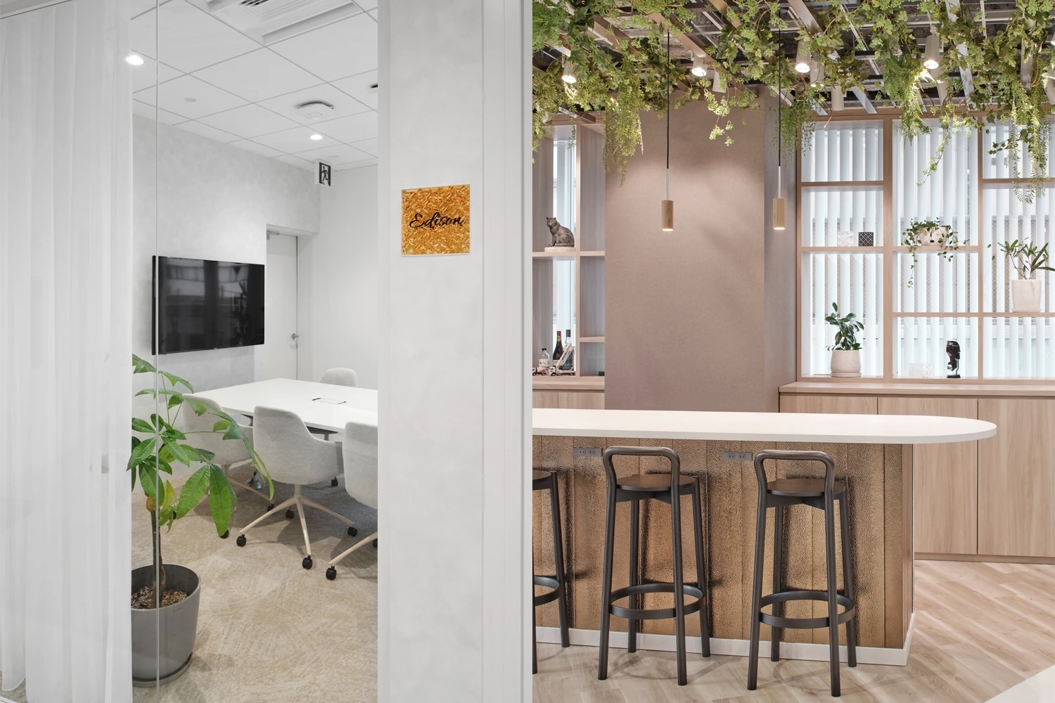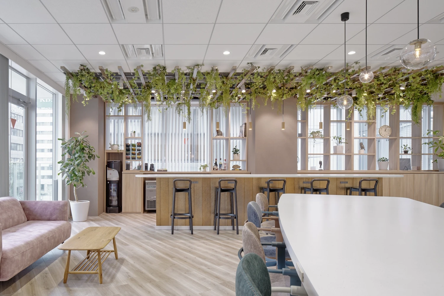 特にエントランスにはインパクトのある大きなアルミパネルを使用し、素材を選ぶエリアだけでなくオフィス全体がショールームとして機能するような工夫を施しています。デザインは優しい色味のマテリアルを中心にコーディネートし、明るいウッド素材を取り入れることで柔らかいイメージの空間に。ところどころにグリーンを取り入れることでリラックス効果も期待できます。リフレッシュスペースにはカウンターやビックテーブルを設置し、作業も休憩もできる空間として、コミュニケーションを誘発できる空間になっています。