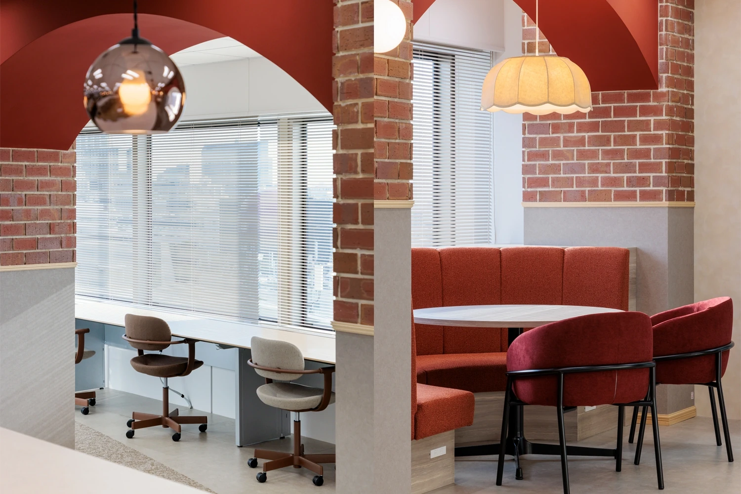コロナ禍の影響で在宅勤務をする社員の割合が増え、コミュニケーションの減少を課題に抱えていたイープラス様。社員同士の出会いのきっかけとなるような大きなフリースペースをつくることで、リアルなコミュニケーションが生まれ、チームの一体感につながり、人生を豊かにできる”何かプラスになる“ような場所になったらという思いでレイアウトしました。コンセプトは『ReUnited』。新しいオフィスを中心に再び団結を強め、新たな時代をリードするという意味が込められています。デザインはイープラス様らしいピンクや赤のカラーをベースに明るく華やかなビタミンカラーを取り入れることで、賑やかさを感じる空間を演出。また、入居する恵比寿ガーデンプレイスの外観からつながるようなイメージをデザインで表現しています。他にも、丸みのある家具を取り入れることで全体的に柔らかい空間に仕上がっていることも特徴です。