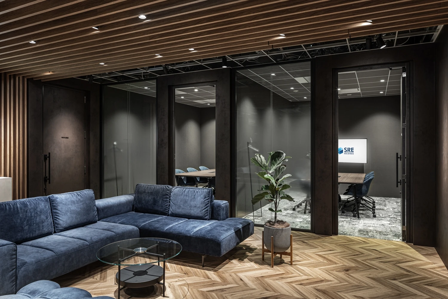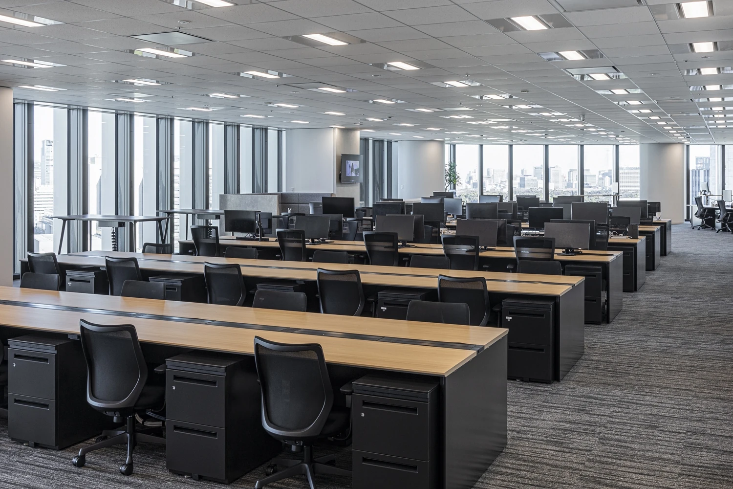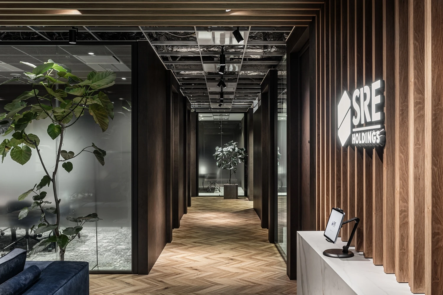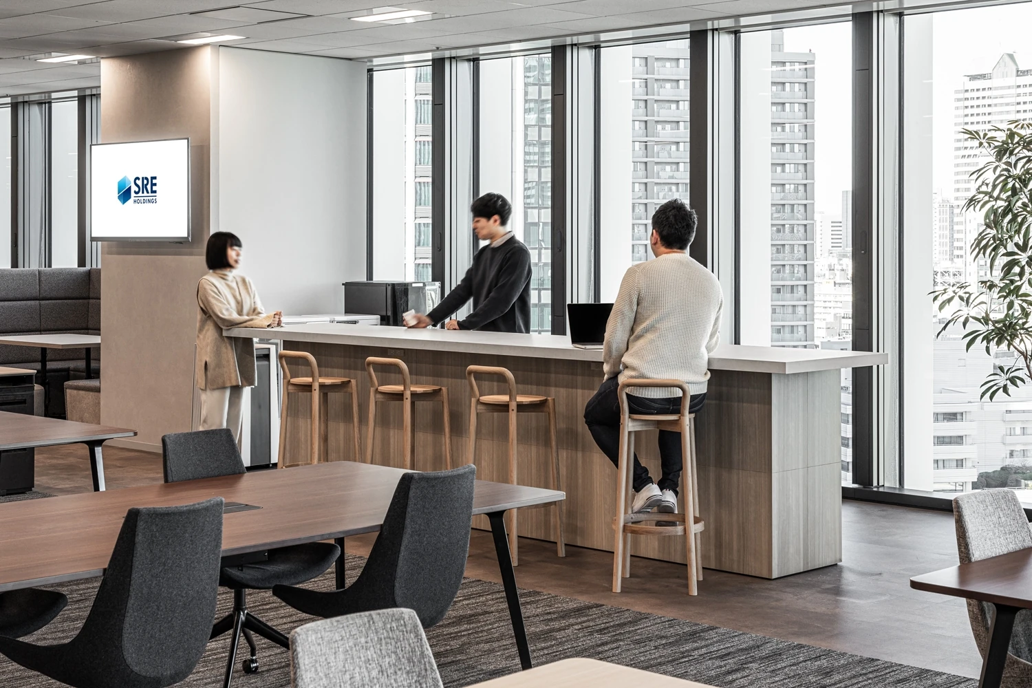 オフィスのコンセプトは『人のつながり、空間のつながり、未来へのつながりを体現できるオフィス』。空間が広くなることで人のつながりが途切れないよう、窓側にコミュニケーションスペースを連続して設け、開放感がありつつ社員の方同士のつながりを感じることができるオフィス空間を目指しました。増床によって環境が大きく変化しないよう、既存区画から新しいエリアへ流れる中で違和感を感じないように工夫。また今後、別の区画も増床していくことを見据えて今回の増床を「つなぐ場」とし、未来のオフィス空間へのつながりも意識したトレンドに流されないデザインを意識しました。デザインは本社としての格式があり重厚感あふれる雰囲気を表現しながら、マテリアルの要素を絞り落ち着いたトーンの素材を使用し、シンプルで洗練された空間を演出しています。「今の先鋭を追求し、10年後の当たり前を造る」というミッションのもと、SREホールディングス様の先鋭性を手前から奥へと進む連続したラインで表現しました。
