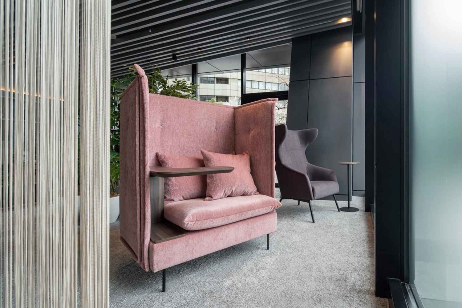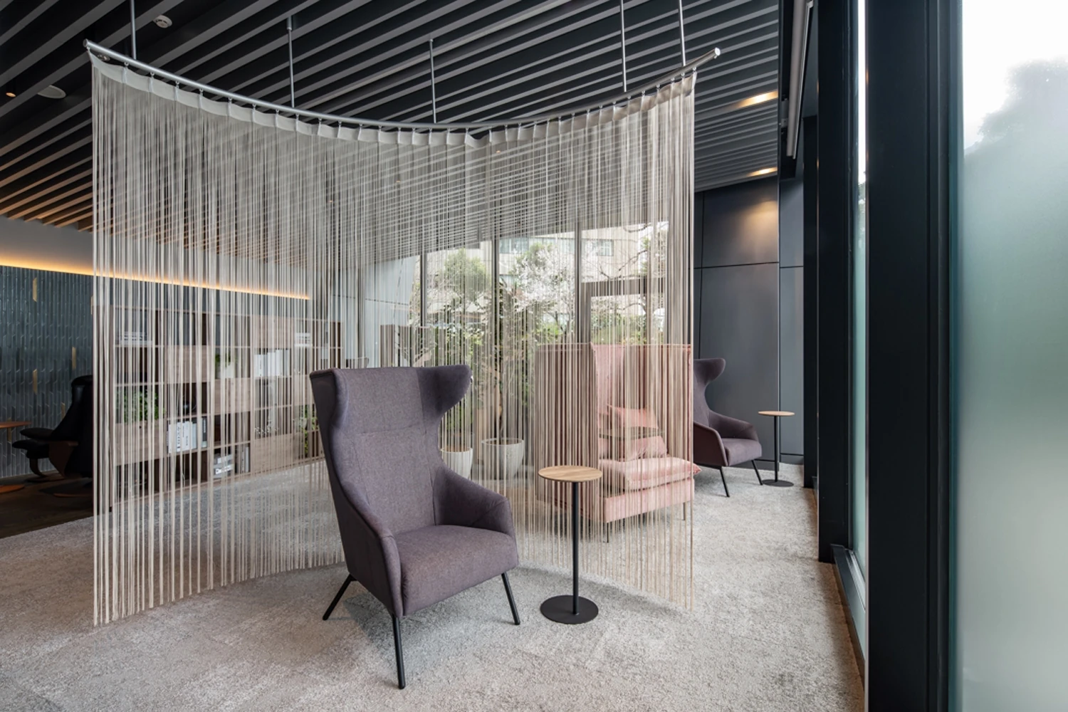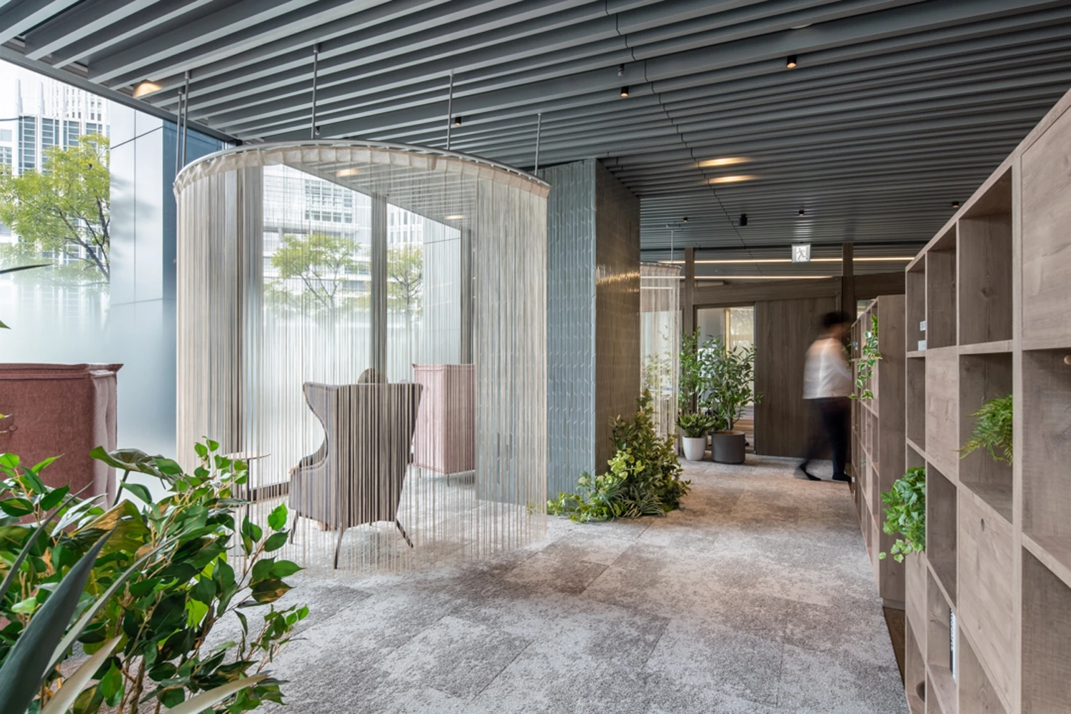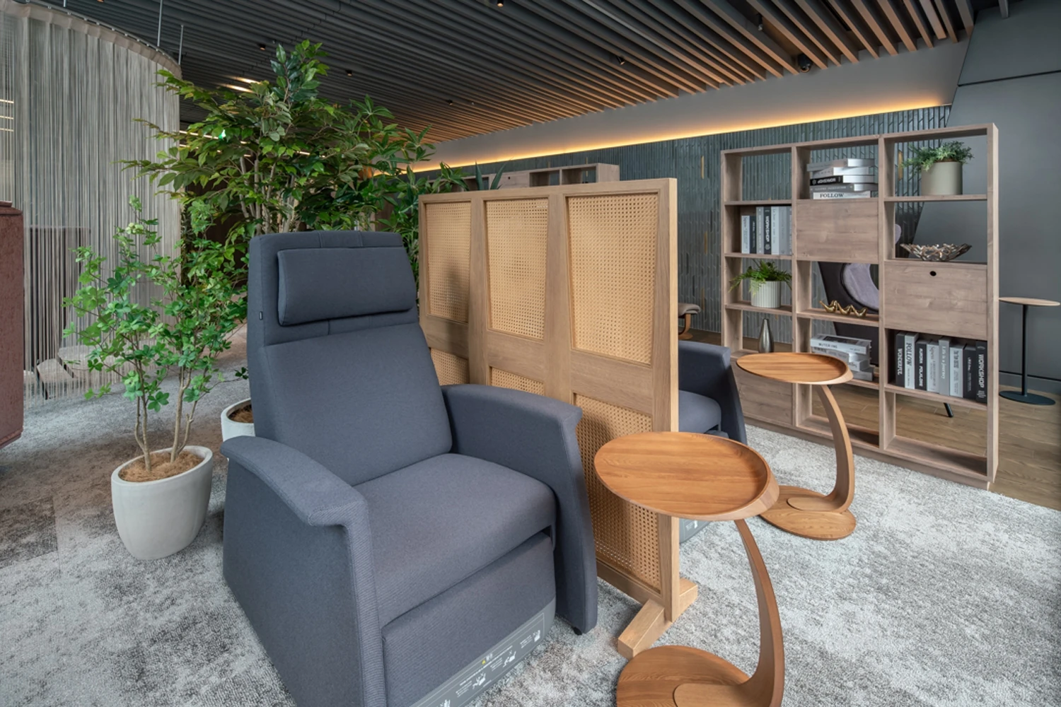 デザインコンセプトは”さなぎ”を意味する『Pupa』。さなぎとは幼虫から成虫になる間の期間のこと。さなぎになってからの数週間から数か月、直線的な成長を一旦止めるその期間は、一見何もしていないように見えますが、囲いの中で自分を分解し、きれいな蝶になるためにゆっくりと自分の体を作り替えていきます。そんなさなぎの役割を今回の改装プロジェクトのテーマにも落とし込み、戦略的に活動を止める『より大きな成果を出すための積極的休養を取る場所』と定義しました。仕事の合間の少しの時間にカラダとココロの活動を止めて、自分を整えることができるように上質な空間にこだわり、座った時に包み込まれるような心地良さを感じるチェアやその張地、温かみを感じる照明、リラックス効果のある音楽など、五感からも安らぎを感じられるよう設計しています。また全体の照明を極力抑えることで、まるで木陰で休むようにリラックスできる環境を目指しました。また、人目などの眠りの妨げにならないように、植栽やカーテンの設置や、チェアの向きにもこだわり、利用者にとって居心地のよい空間を重視してプランニング。名古屋を代表するシンボリックビルのこれまでのイメージに加え、信頼感と落ち着きを感じさせるデザインにしています。