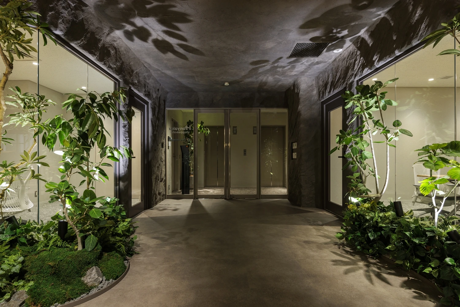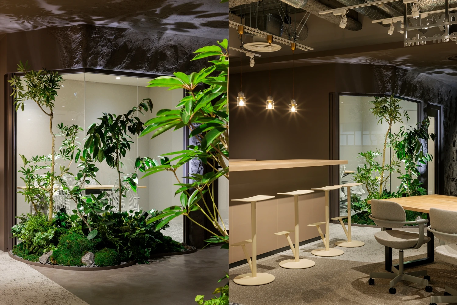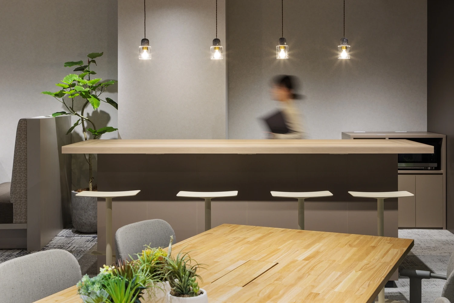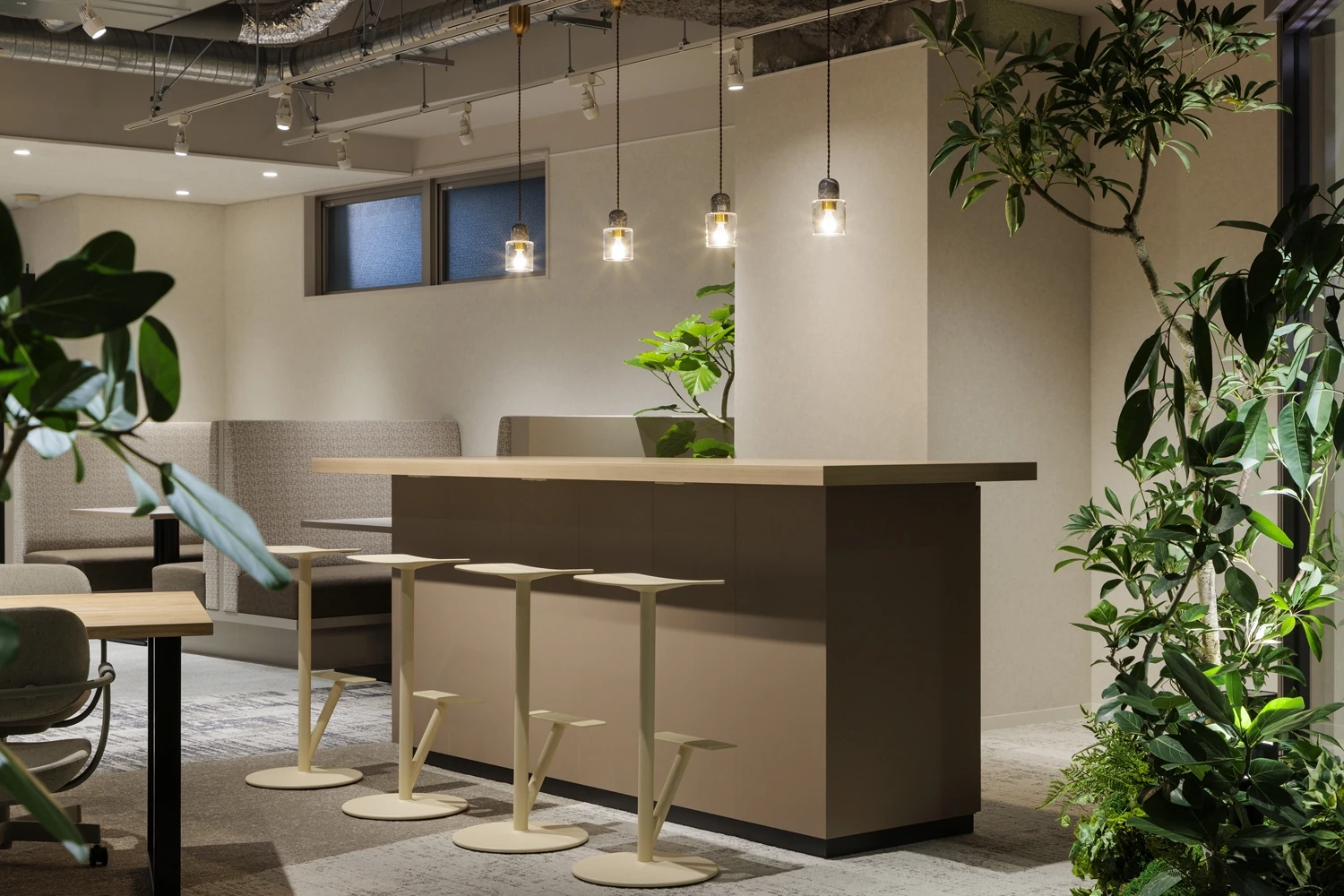 新オフィスのコンセプトは『ARC -つなぐ-』。「つくる人とつかう人をつなげる」という企業メッセージを再構築し、コンセプトにつなげています。コンセプトをもとに、コミュニケーションが生まれる仕組みをレイアウトに落とし込み、社員同士のつながりを促す空間を創出。さらにたくさんの人を迎え入れるエントランスに事業内容と明るい未来を体現する、会社と会社を結ぶ架け橋(ARC)となるような空間を構築しています。今回、複数フロアのオフィスから1フロアになる上で、コンセプトの「つなぐ」を意識したゾーニングに。EVを降りてすぐエントランスからオフィスへと続く道は印象的なアプローチをつくり、その先のフリーエリアをオフィスの中心に配置することで、多方面からアクセスできる形にしています。社内外問わず身近に感じられるこの空間を「人と人を繋げる架け橋となる場所」として定め、ホンヤク出版社様に関わるすべての人がつながり、まとまっていくようなオフィスを目指しました。明るく落ち着いたイメージのテクスチャーと強い個性をもつ意外性のある造形を掛け合わせることで、居心地をよくしつつも「よくあるオフィス」から一線を画すデザインにまとめ、いきいきとしたグリーンを多く配置することで活発な印象を与えています。ポイントで差し込む色味は落ち着いたブルーなど、知的なイメージのカラーに。使い方、デザインの双方でホンヤク出版社「らしさ」を表現しています。