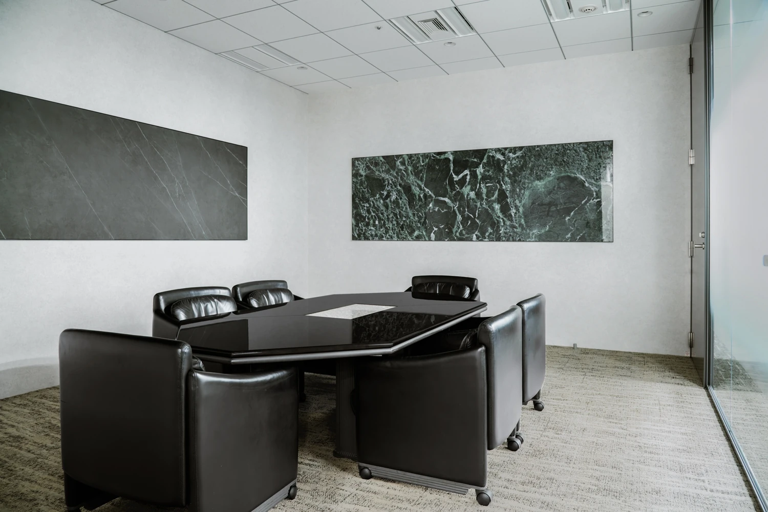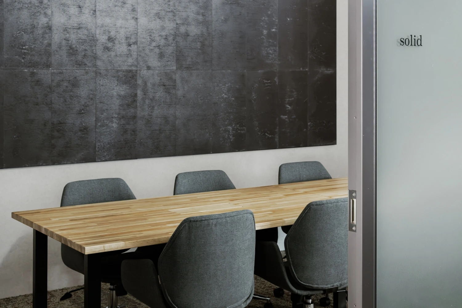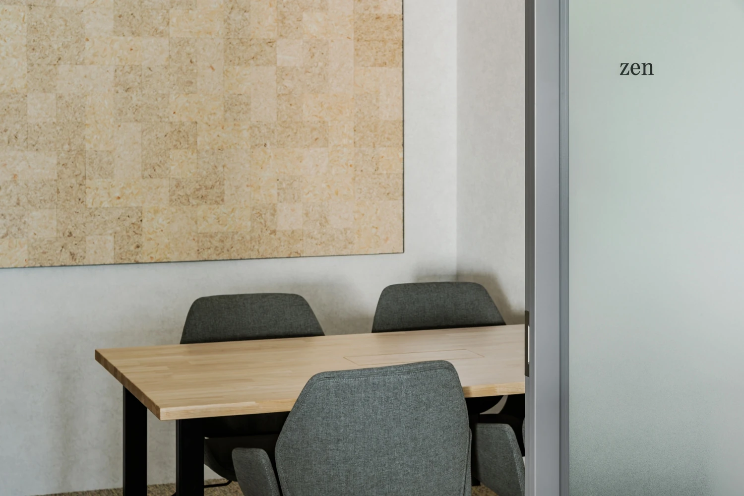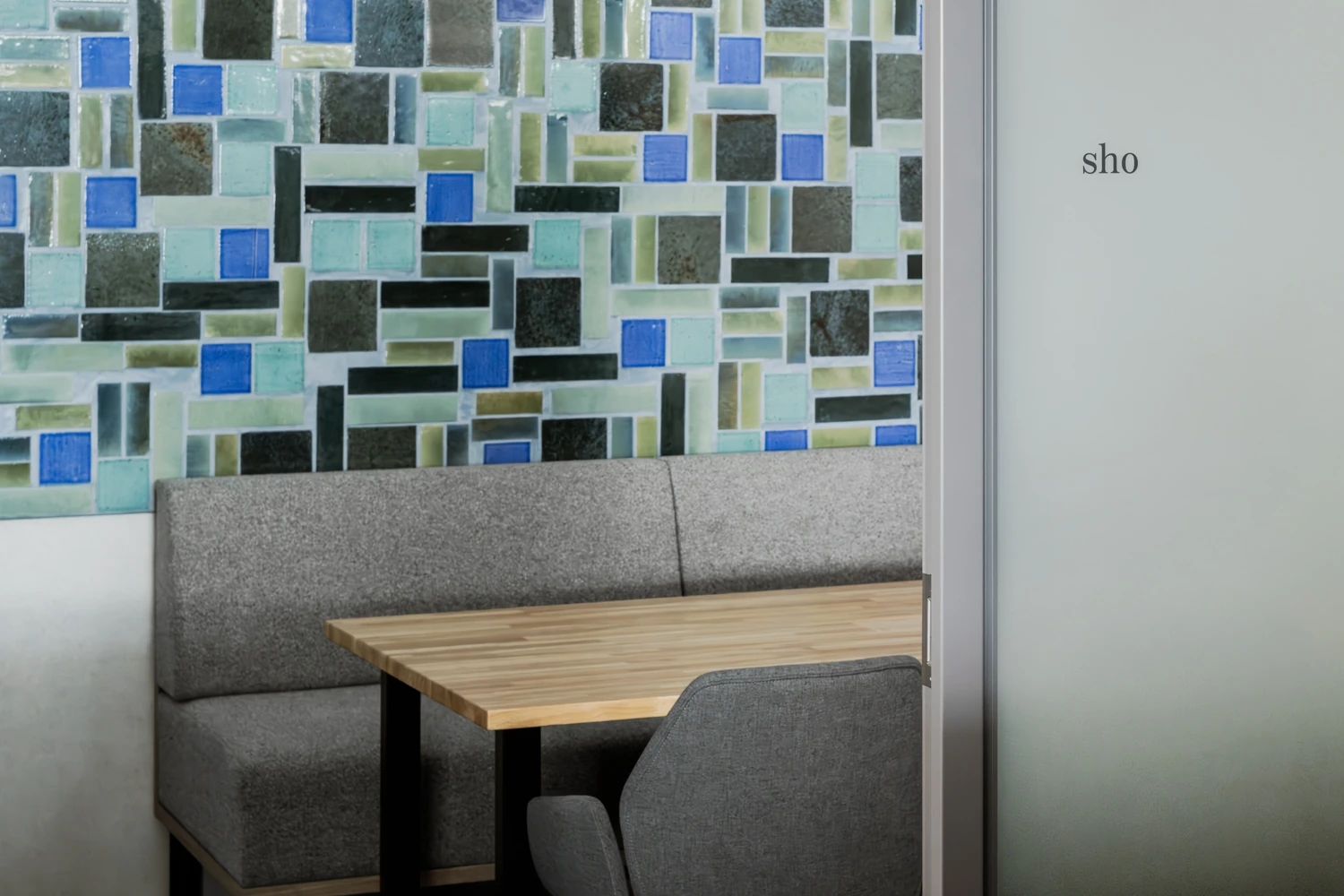 多様な人材が活躍できる環境づくりに注力し、社員エンゲージメントの向上や次世代人財の育成をしていけるような環境を求められていました。そのため、個々の成長、その先の会社の発展を目指していけるような、人々が交わる場づくりを目標に『紡ぐ』というコンセプトを策定しました。社内外の人が通る入口すぐの場所にオープンエリアを設け、思い思いの場所で働いている様子があえて外から見えるように設計。風通しの良い社風を、訪れた人にも感じてもらえるようにレイアウトしました。各会議室には、壁一面にマテリアルを貼るのではなく、額縁の中にマテリアルを配置することで、アート性を取り入れた印象的なデザインを施しています。また、ルームサインを来訪者や社員の方々にとって分かりやすく、かつ自然に馴染むことを意識し、それぞれの空間に合うような書体であしらっています。サインデザインにもこだわることで空間全体の統一感を実現しています。