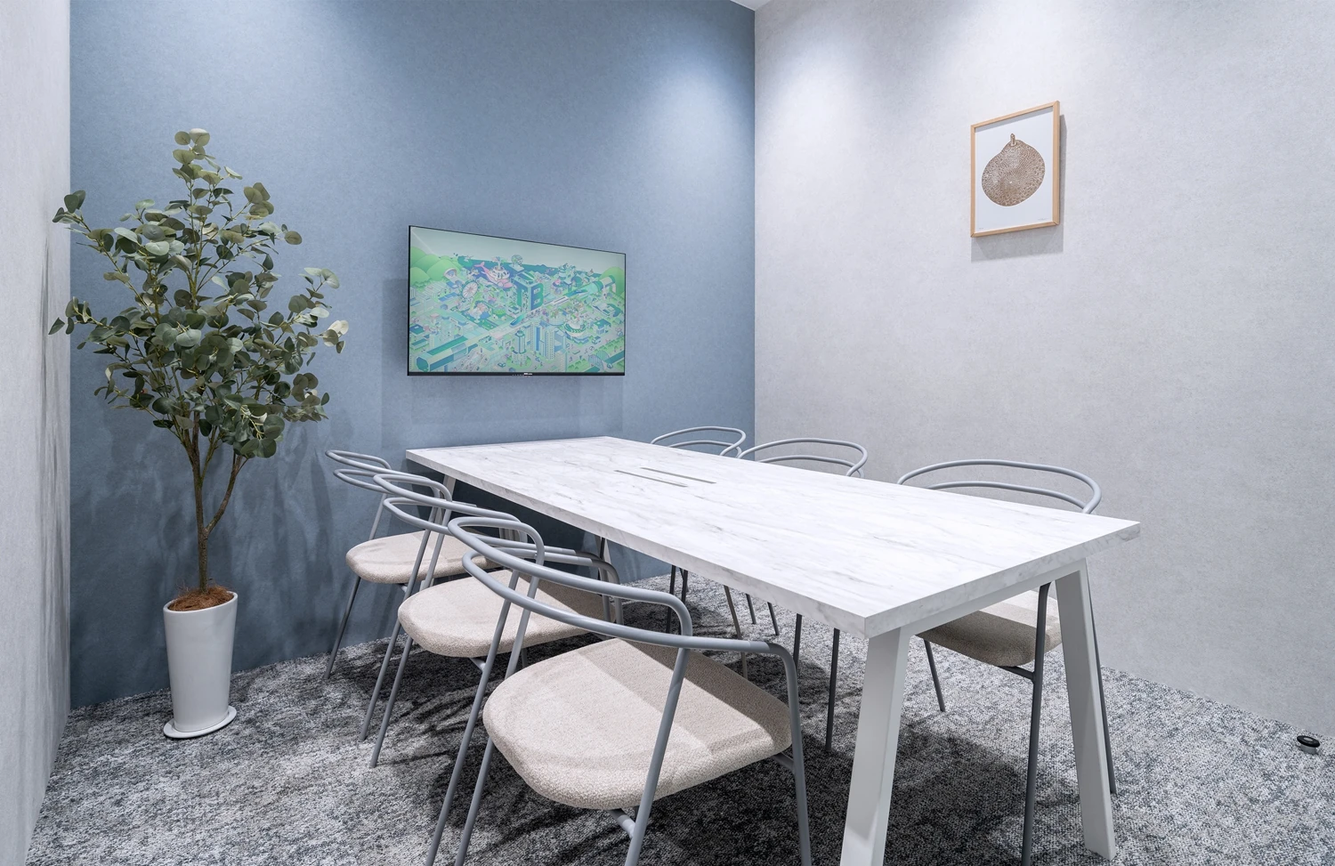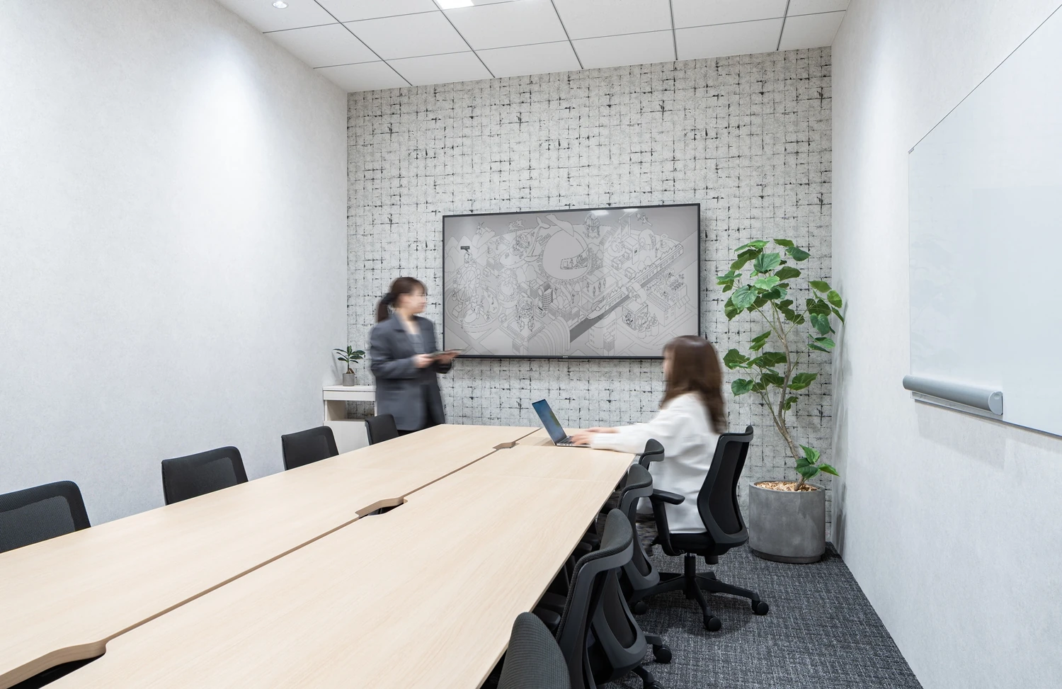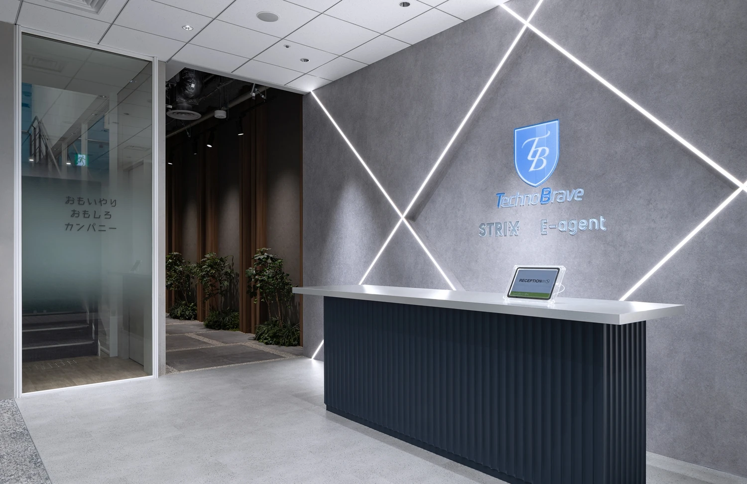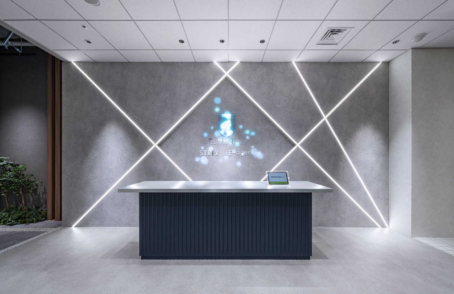 エントランスの床は既存のタイルを活かしつつ、壁面は表層変更を実施し、間接照明を埋め込むことで、コーポレートカラーと事業を連想させるデザインに。既存の空間に、テクノブレイブ様らしさを表現していきました。映像の打合せを繰り返し行うことで完成させたオリジナルの映像コンテンツをマッピングサインとして投影することで、来社されたお客様を楽しくおもてなしするような象徴的なコンテンツをつくりあげています。