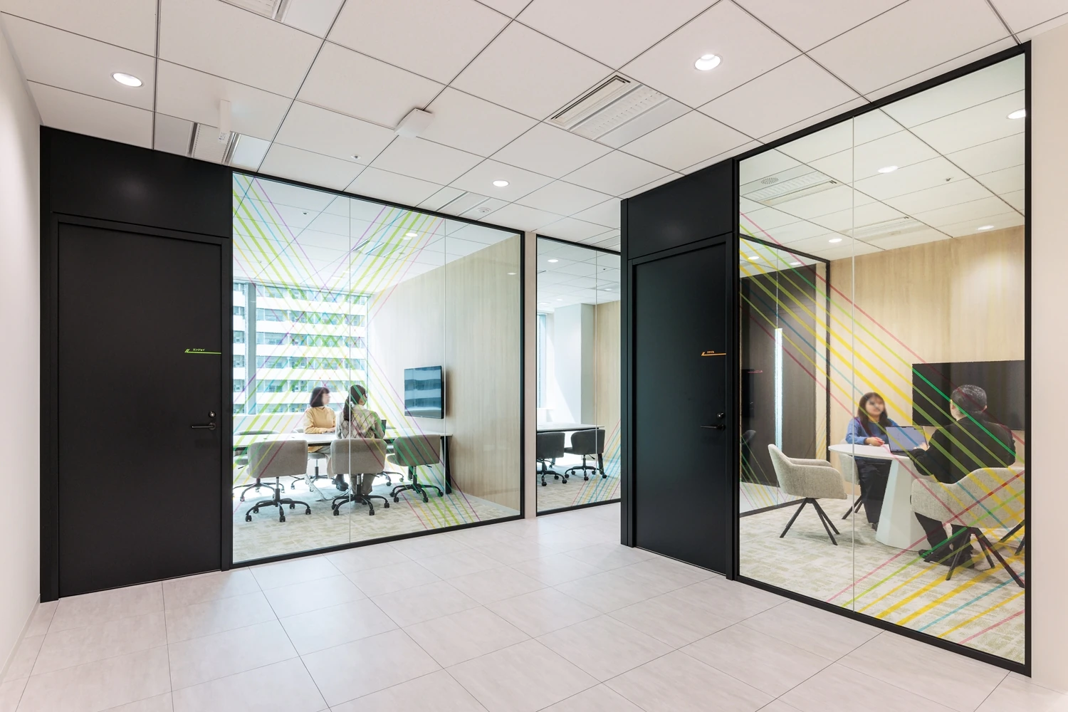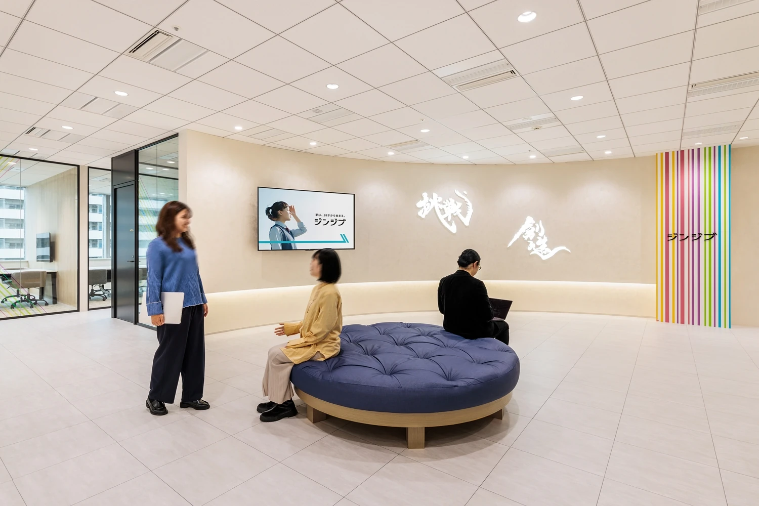 デザインコードも大阪オフィスのイメージを守りつつ、東京支社の特徴である若いメンバーが集うエネルギーや、団結力のある働き方に視点を置きました。そこに加えて”つながり”を+αのキーワードに掲げてデザインに落とし込みました。エントランスの象徴的な壁はジンジブ様と来客者の”つながり”を意識して計画しており、社名からブランドスローガンへと視線の誘導をし、エントランスを歩くことで一冊のブランドブックを読み終えるようなストーリーを紡いでいます。執務室においても社員様同士の”つながり”を第一に考えて計画をし、家具や床の貼り分けに曲線を取り入れ、どこで働いていてもジンジブブランドを体感できるよう、各所にグラフィックデザインを配置。オフィスに訪れることでブランドコンセプトが定着し、それが途切れずエネルギーが循環していき、想いがひとつにつながるような空間を目指しています。