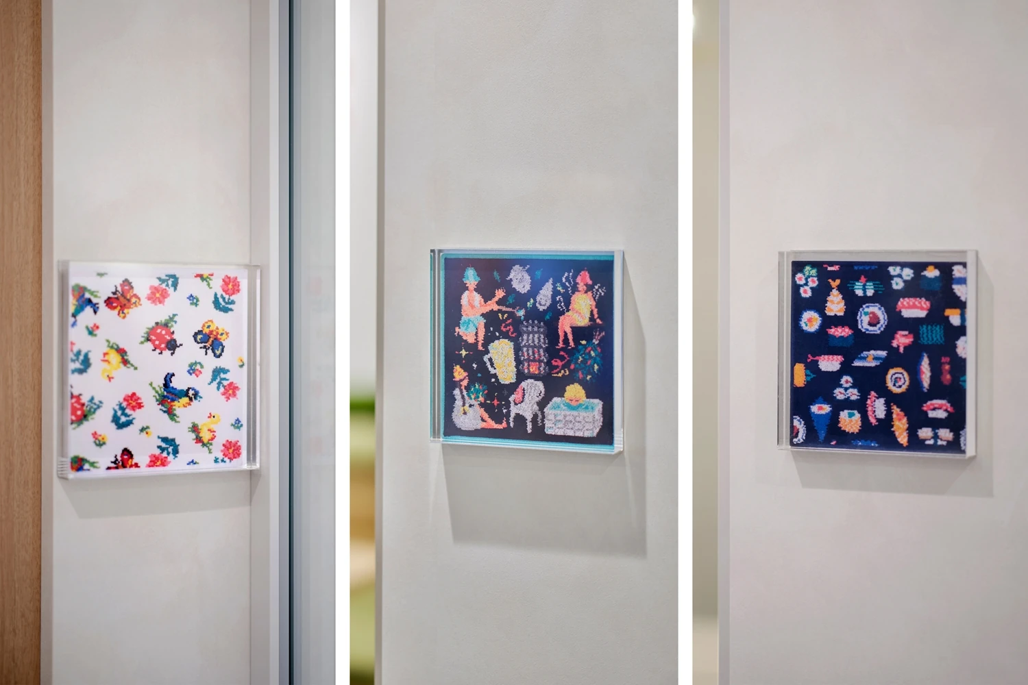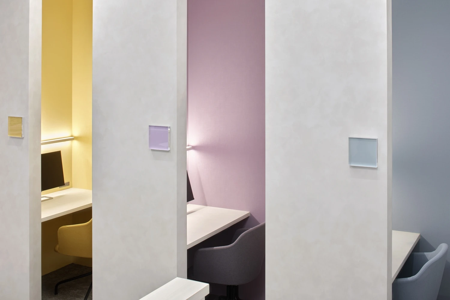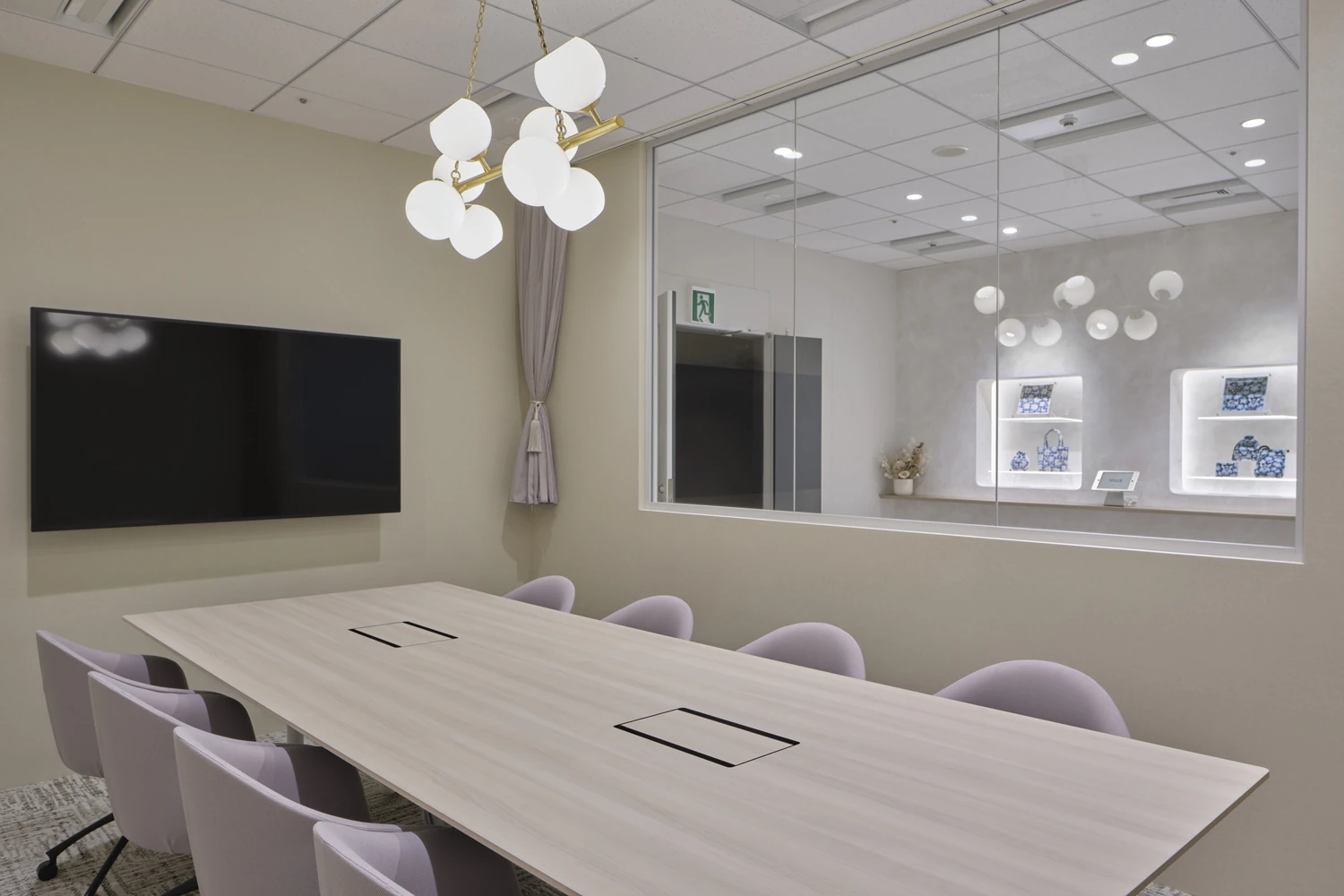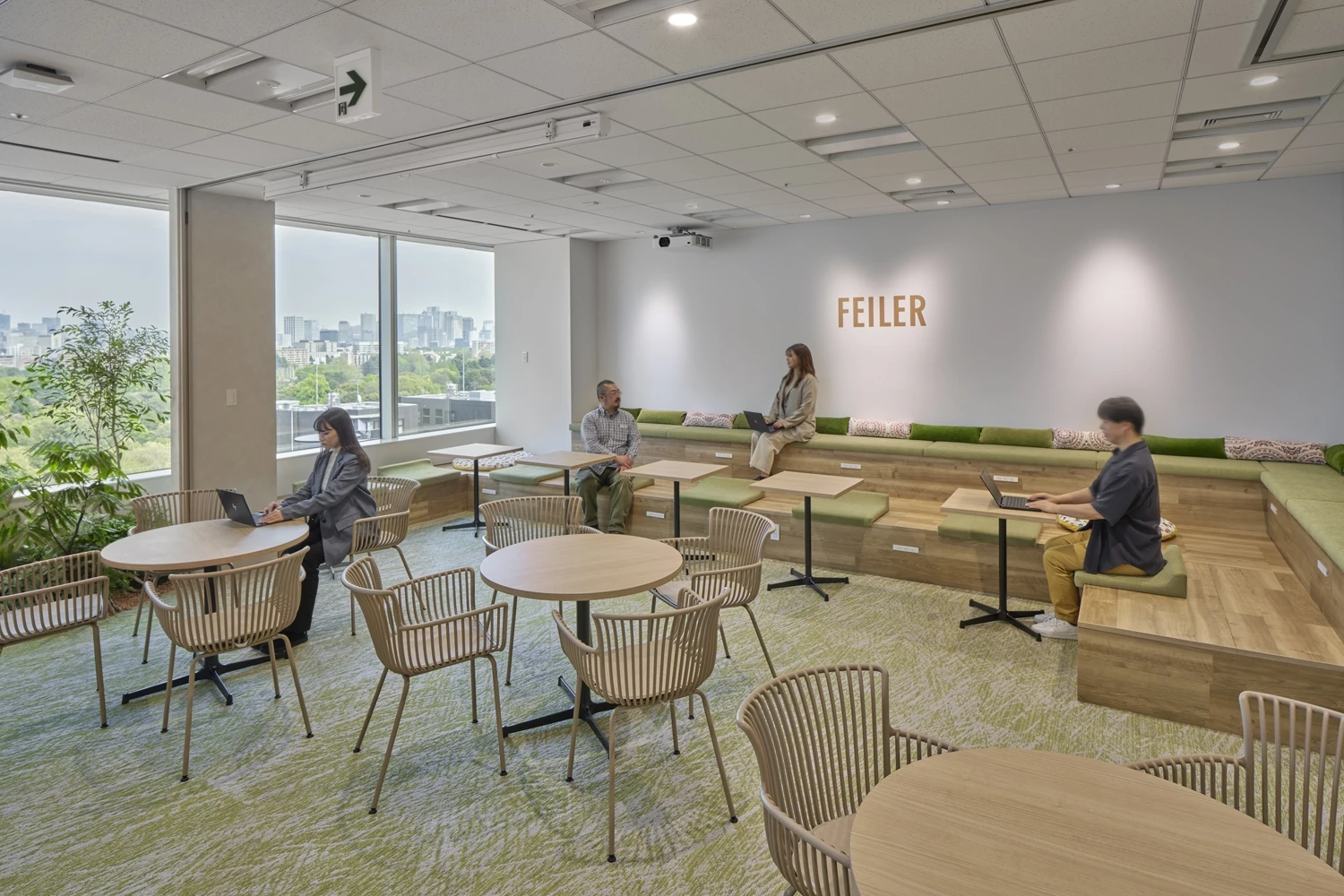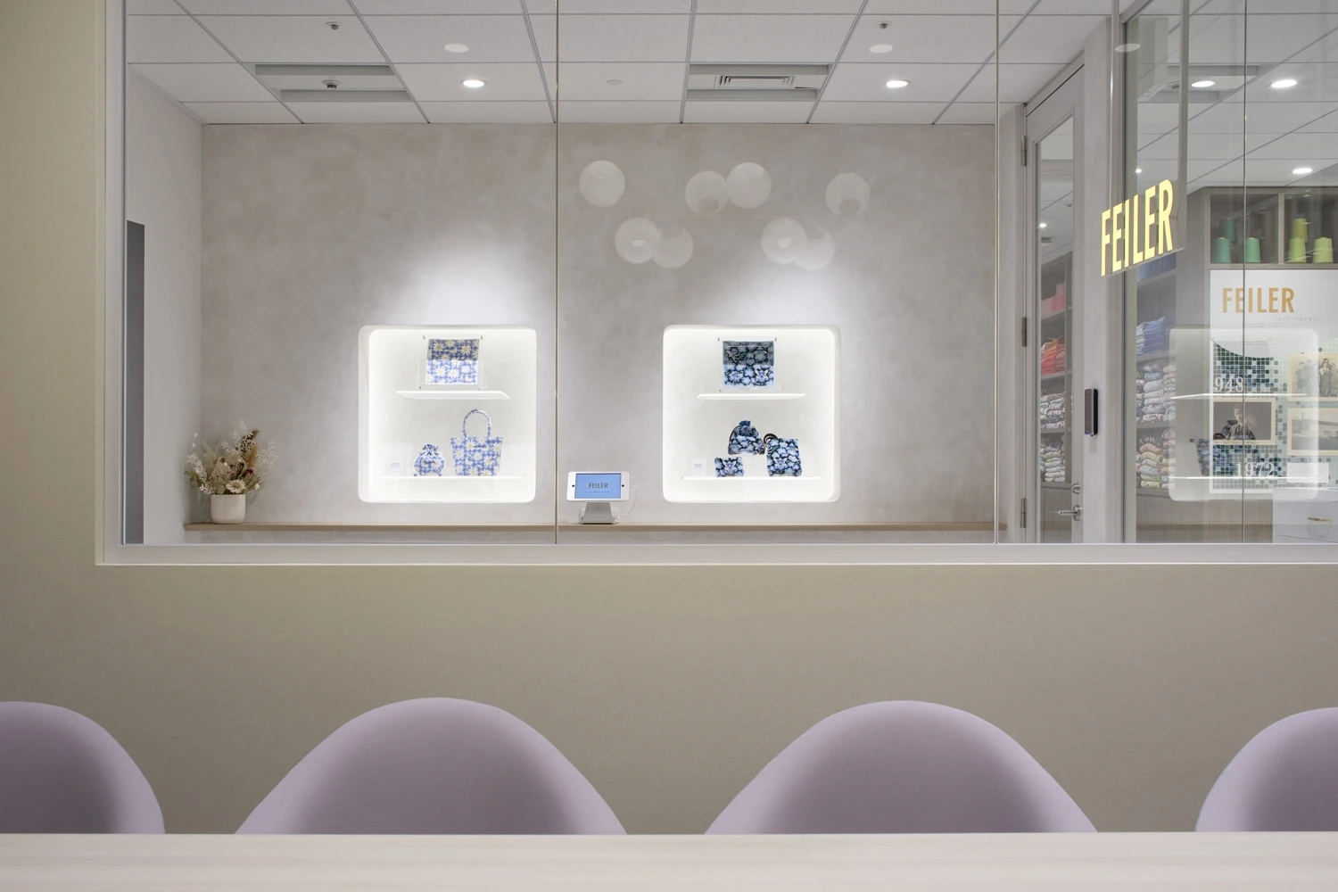 事前にフェイラージャパン様にいただいていた「感性が駆動するオフィス」というテーマのもとオフィスコンセプトを策定。さまざまな感情が生まれ、それがアイデアとなり、最終的に「FEILER」に触れる人にとって幸せなストーリーを生み出す空間になるよう、ドイツ語で「新しい幸せ」を意味する『Nue glück 』というコンセプトを掲げました。ワークスペースは社員のメイン動線付近に商品企画が利用する作業台を設置し、今まで閉鎖的に行われていた企画会議も異なる部署のメンバーと共有できるよう工夫しました。他にも、部署間のコミュニケーション促進のためにゾーンアドレスを取り入れ、あえてデスクを斜めに配置することでコミュニケーションが生まれやすい動線を意識しています。エントランスのディスプレイにはシーズナル商品が展示できるような発光アクリル板を設け、その先の扉を開けてすぐの位置には、フェイラージャパン様の歴史やプロダクトに触れることのできるスペースを設置。来客者にとってフェイラージャパン様の世界観を十分に感じられるショールーム的なデザインにこだわりました。全体的に内装や家具には上品な可愛らしいカラーリングを採用。人気商品であるハンカチをモチーフに床の貼り分けをしたりと、どのエリアからでもフェイラージャパン様の魅力を感じていただける空間を目指しました。