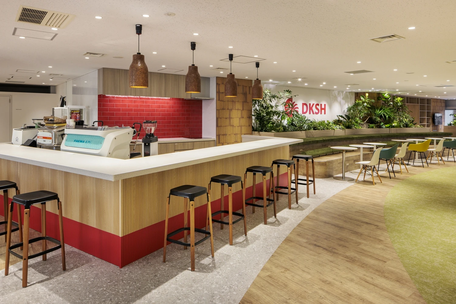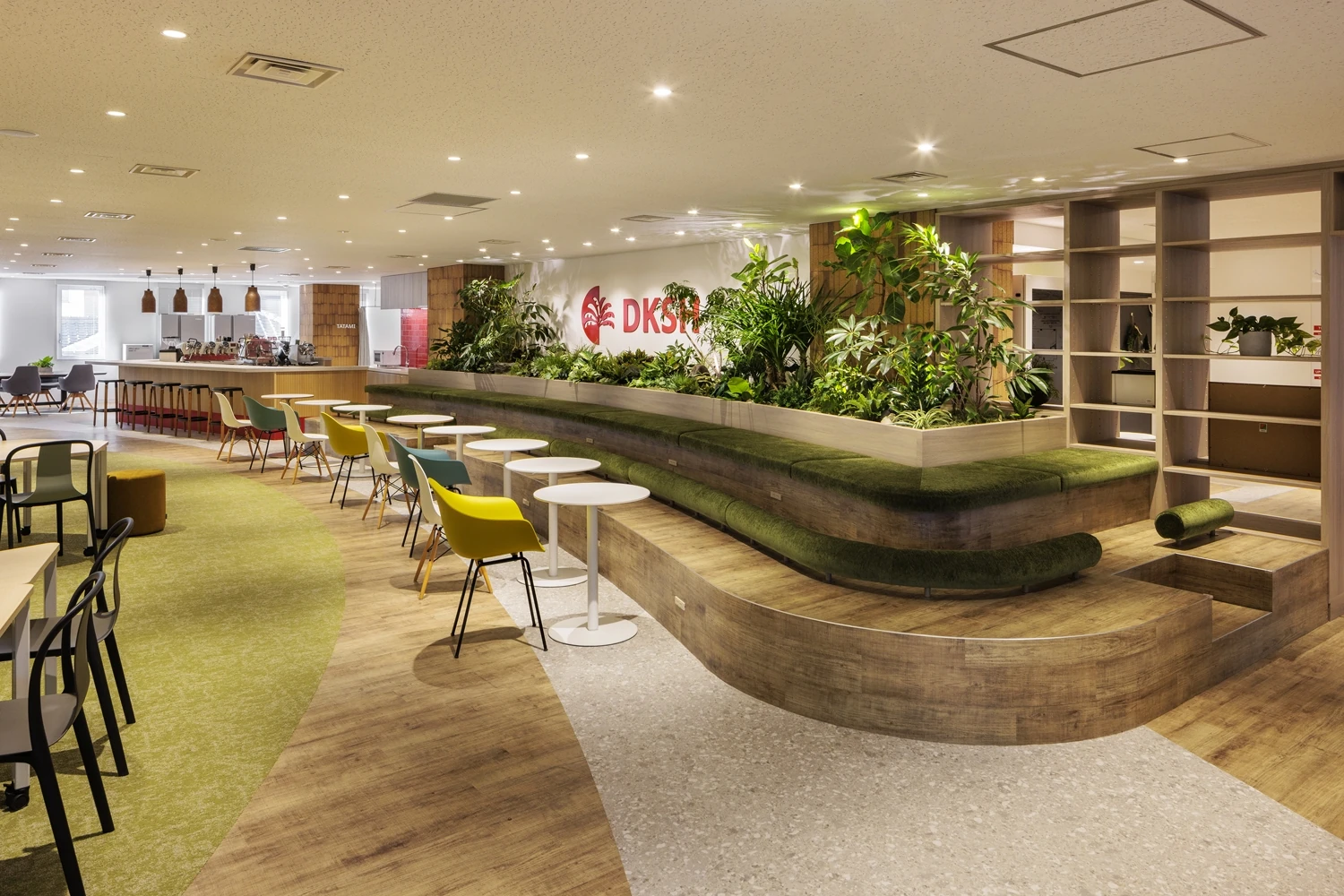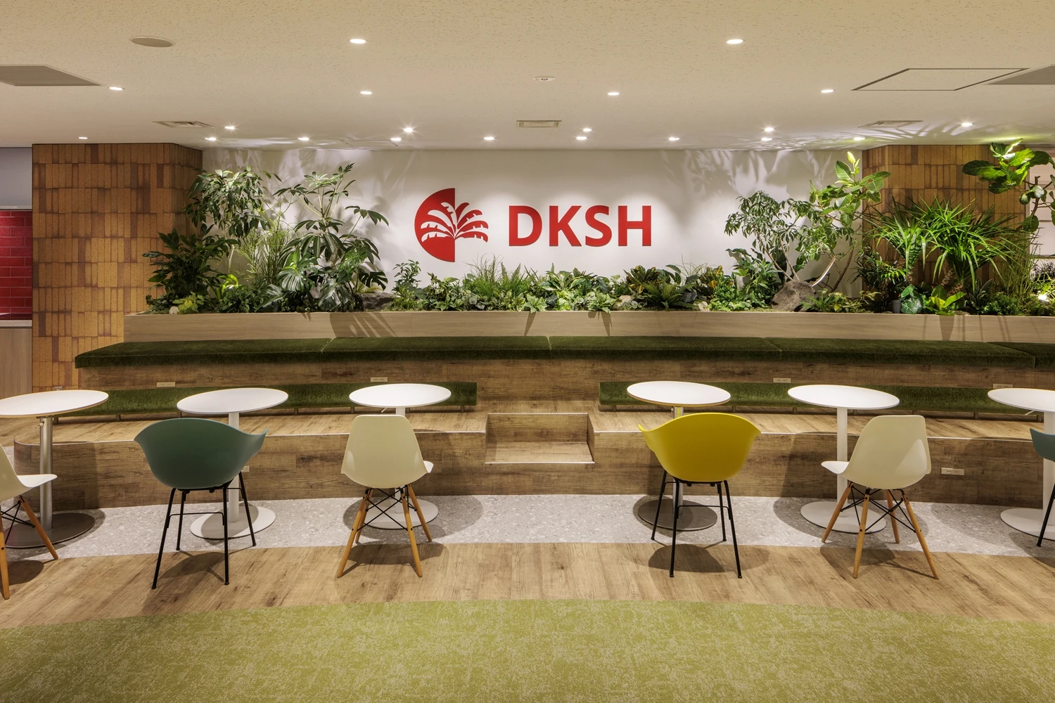 コンセプトは『Neo Vision』。単に商品の取引とプロモーションを行うだけではなく、お客様の商品およびブランドに深い責任をもつことをサービス哲学としているDKSHジャパン様。より洗練されたサービスを提供できる集団になるため、効率化を図っていける空間を目指しました。1階から8階の改装プロジェクトのうち1フロアにリフレッシュ機能を集約し、打ち合わせや社内イベントが行えるように設計。社員が自主的に使える居心地のいい場所を目指し、公園のような外を感じさせる素材やグリーンの配色でまとめ、一方で来客エリアはDKSHジャパン様のブランドを感じさせる赤の配色で統一しています。また各フロアには、窓際の空間を開放的に明るく利用できるよう、打ち合わせや気分を変えて働くことができる場所も設置し、自然で偶発的な交流が生まれるように工夫しました。