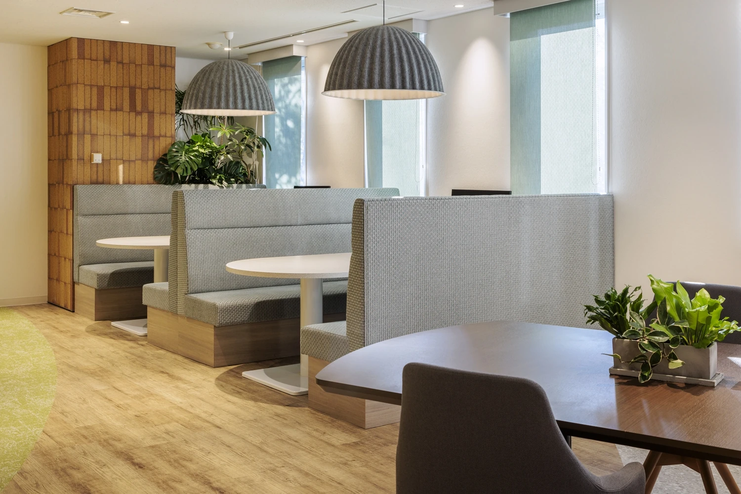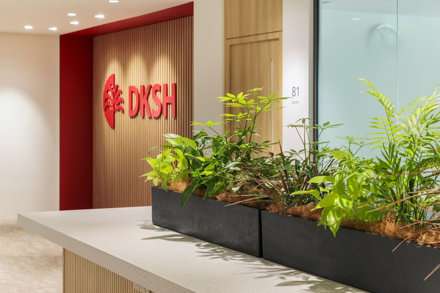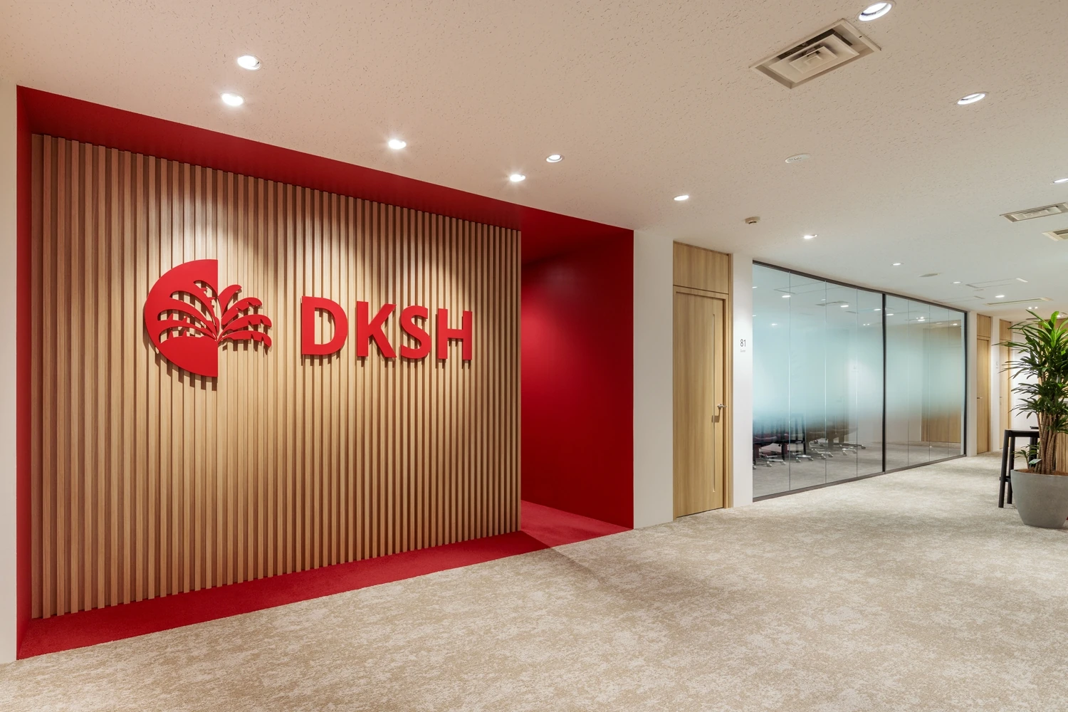 コンセプトは『Neo Vision』。単に商品の取引とプロモーションを行うだけではなく、お客様の商品およびブランドに深い責任をもつことをサービス哲学としているDKSHジャパン様。より洗練されたサービスを提供できる集団になるため、効率化を図っていける空間を目指しました。1階から8階の改装プロジェクトのうち1フロアにリフレッシュ機能を集約し、打ち合わせや社内イベントが行えるように設計。社員が自主的に使える居心地のいい場所を目指し、公園のような外を感じさせる素材やグリーンの配色でまとめ、一方で来客エリアはDKSHジャパン様のブランドを感じさせる赤の配色で統一しています。また各フロアには、窓際の空間を開放的に明るく利用できるよう、打ち合わせや気分を変えて働くことができる場所も設置し、自然で偶発的な交流が生まれるように工夫しました。