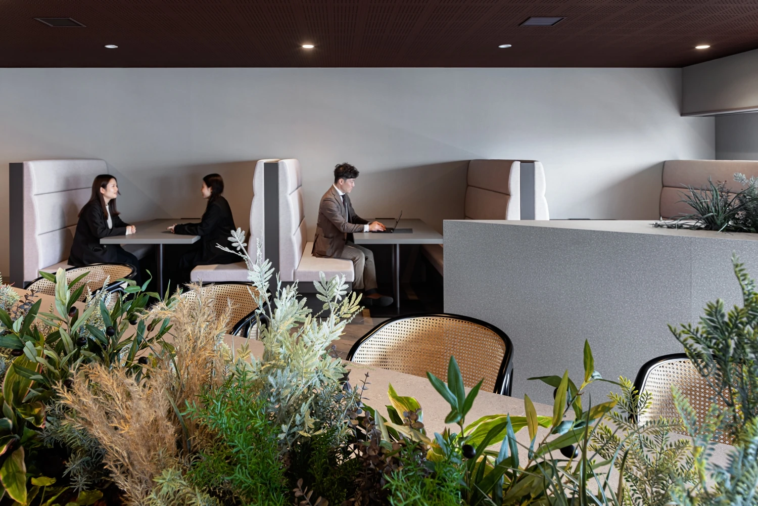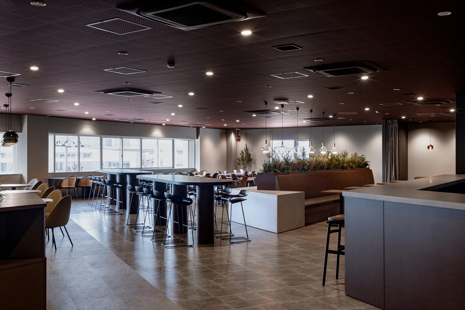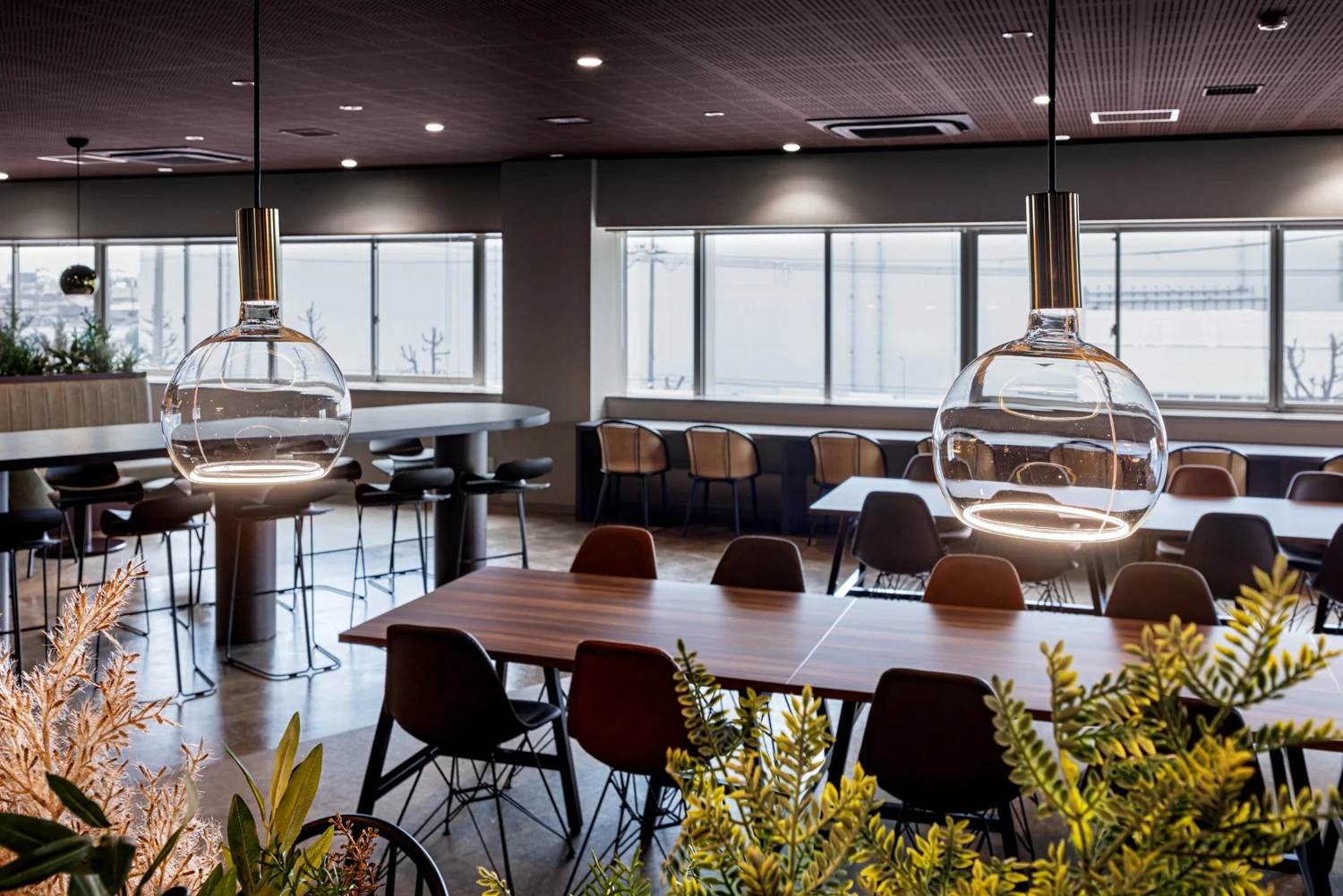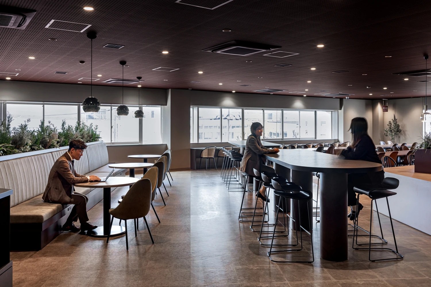 コンセプトは『「3C」のオフィス』。3CはCircle(輪・和)、Choice(選択)、Choccoto(ちょこっと)を意味し、「食事をする場所」の定義を超えた多目的スペースとして、各個人が幸せに働けることを最終目的として、ふらっと立ち止まりたくなるような居心地のいい空間を目指しました。自然と奥へ誘導されるような導線計画を施したスペースは、明るい執務室とは雰囲気を変えたようなカフェのような空間落ち着いた空間となっており、多目的エリアを整理して多様な用途で使うことのできるエリアを配置することで、さまざまなシーンで多くの人に活用してもらえることを目指しました。