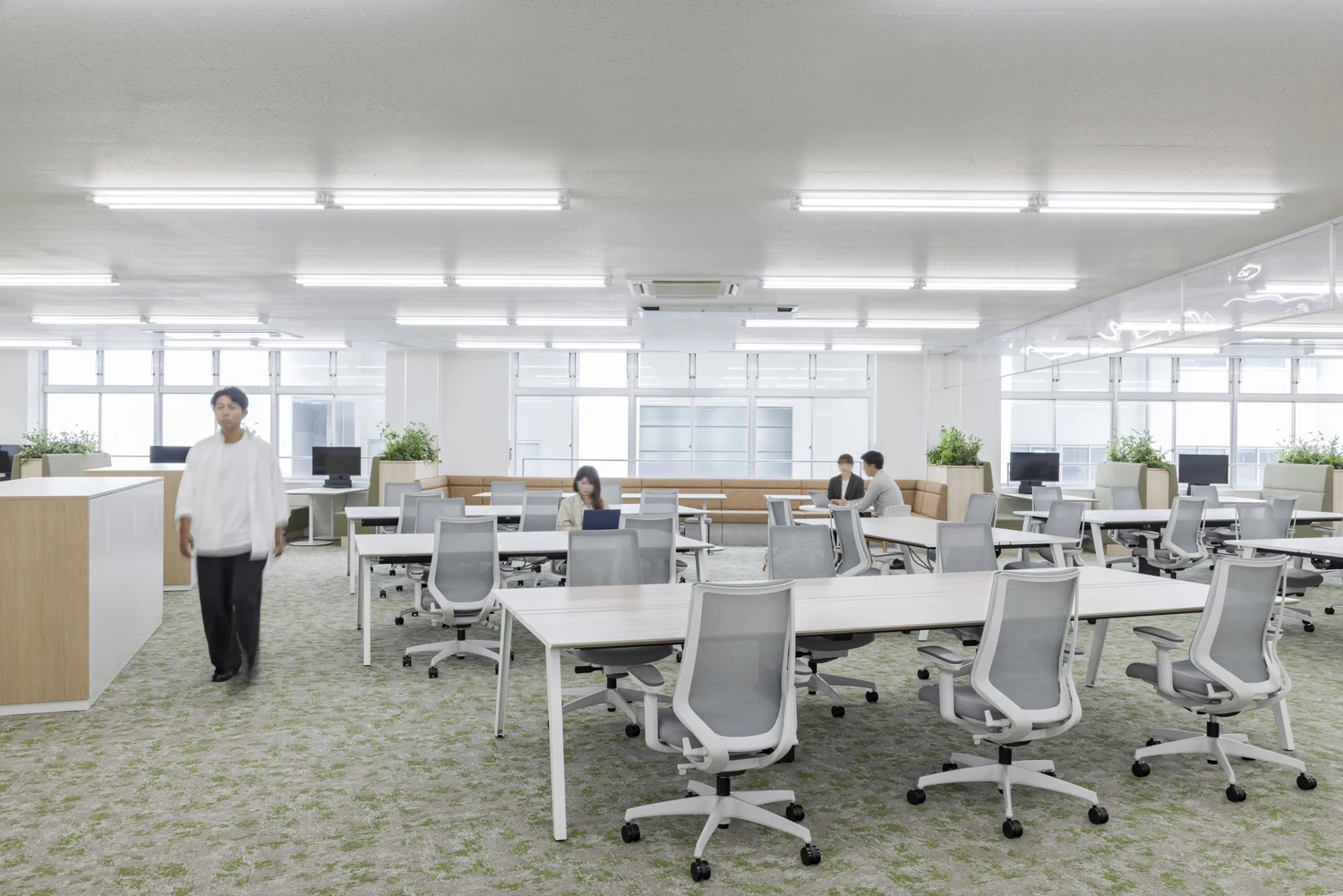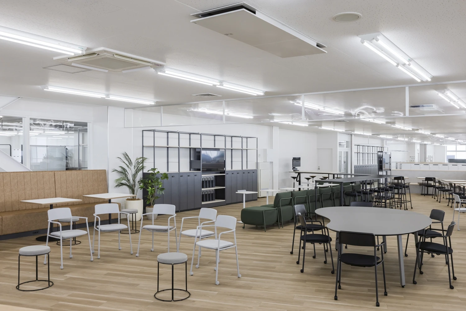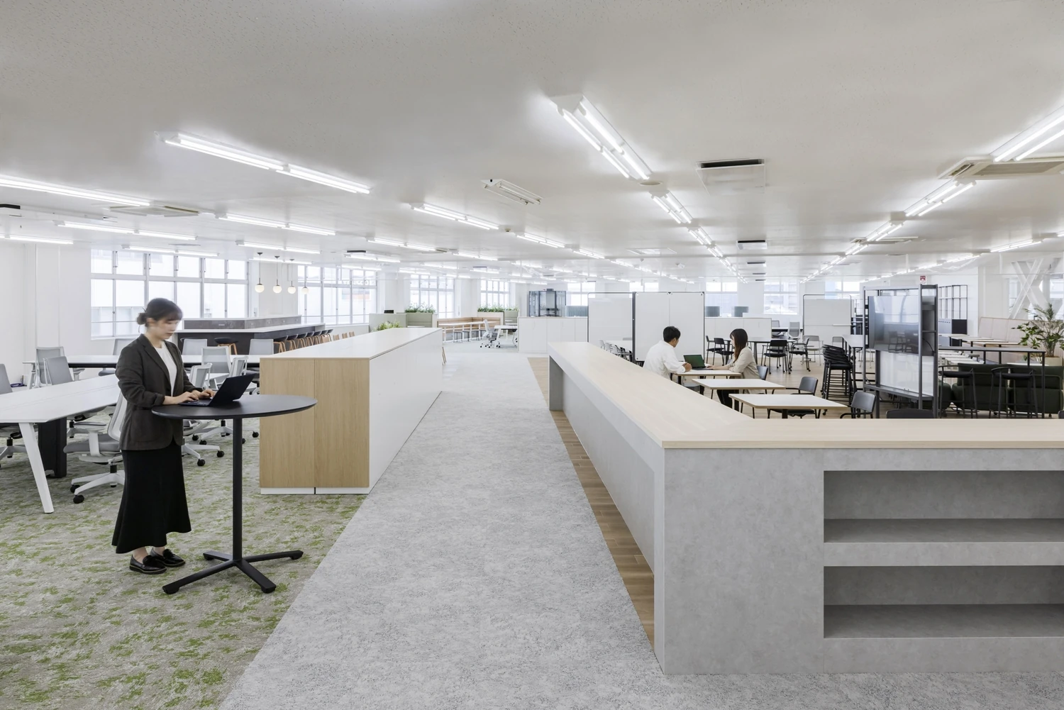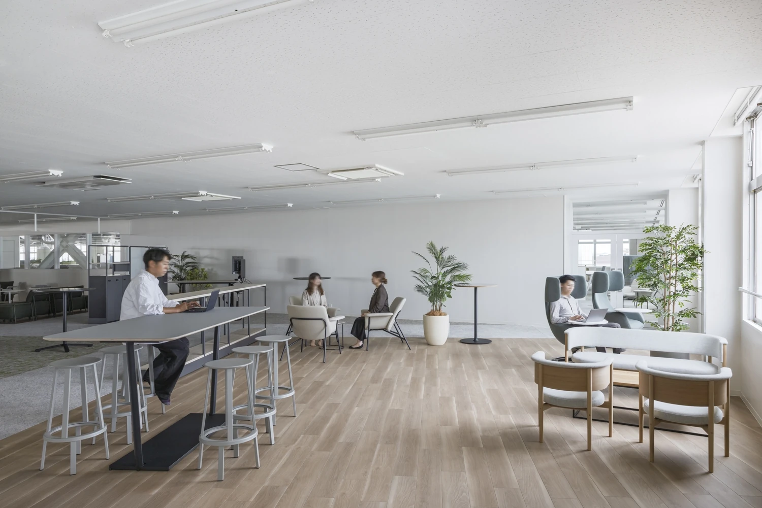 事業移転にともない、オフィス環境を見直すことを決意。働く目的や業務内容に応じて多様で柔軟な働き方ができるオフィスレイアウトを構築することを目指しました。そして、効率的に業務を遂行できるオフィス環境を創造し、生産性やパフォーマンスの質の向上を図ること、あわせて、社員のウェルビーイング向上の実現に尽力しました。 -