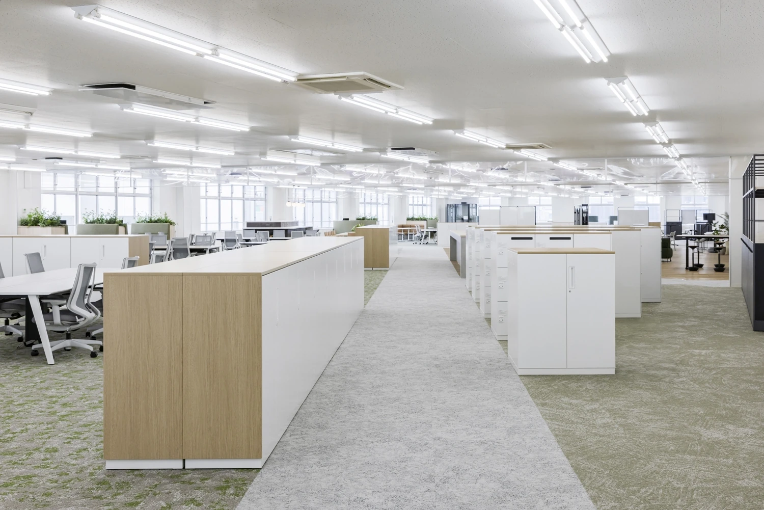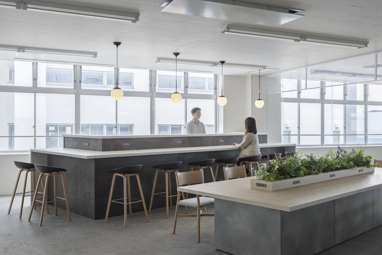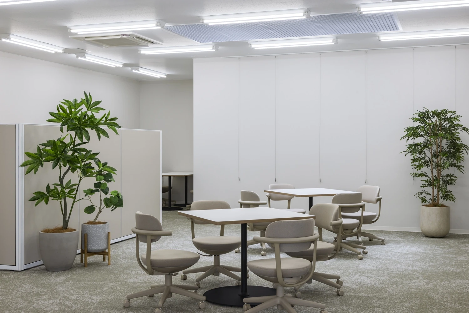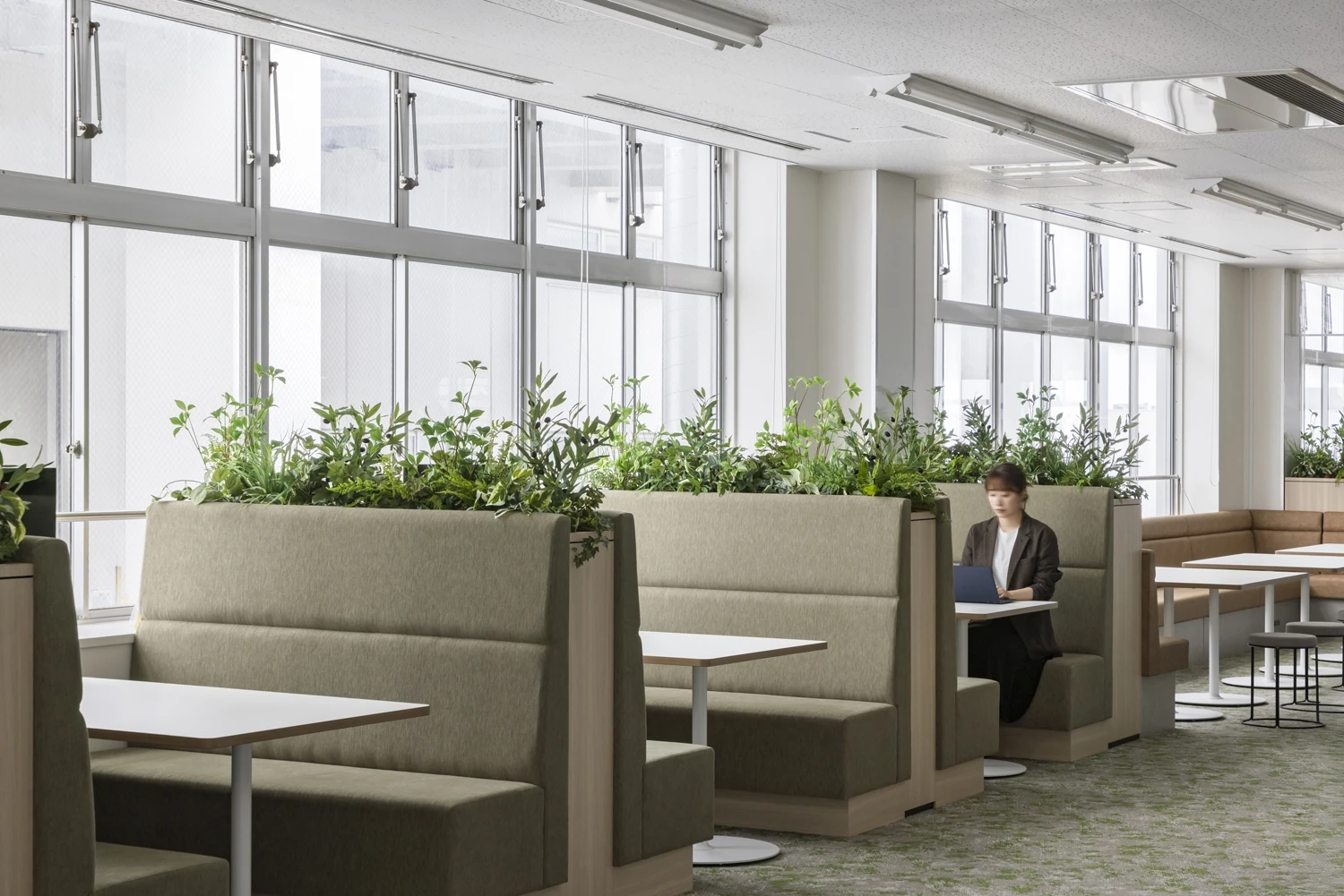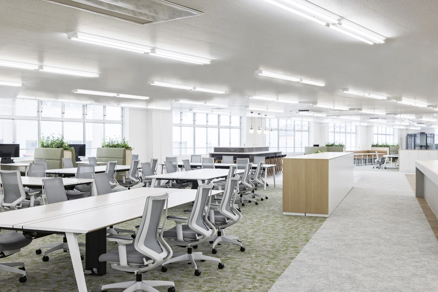 事業移転にともない、オフィス環境を見直すことを決意。働く目的や業務内容に応じて多様で柔軟な働き方ができるオフィスレイアウトを構築することを目指しました。そして、効率的に業務を遂行できるオフィス環境を創造し、生産性やパフォーマンスの質の向上を図ること、あわせて、社員のウェルビーイング向上の実現に尽力しました。 -