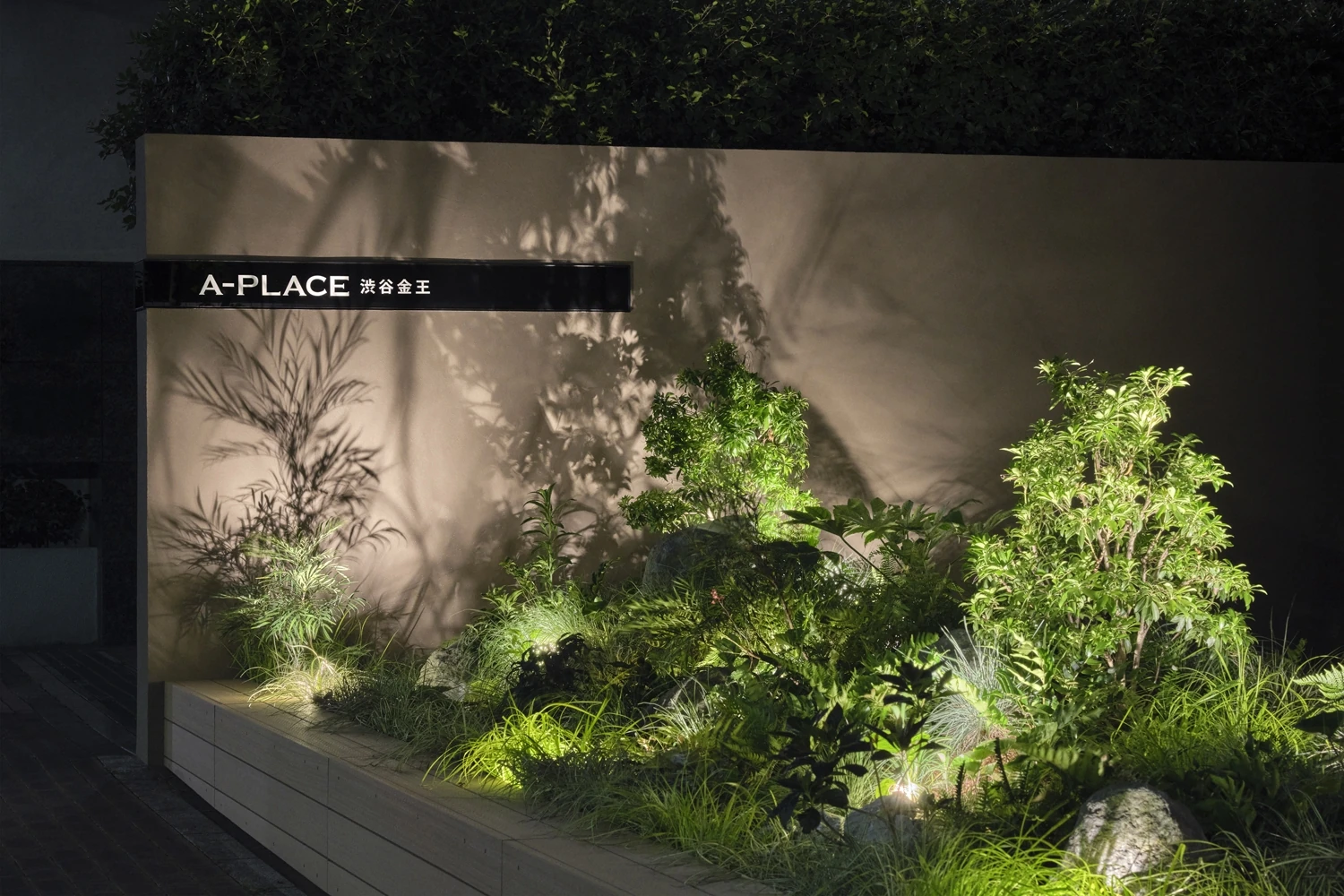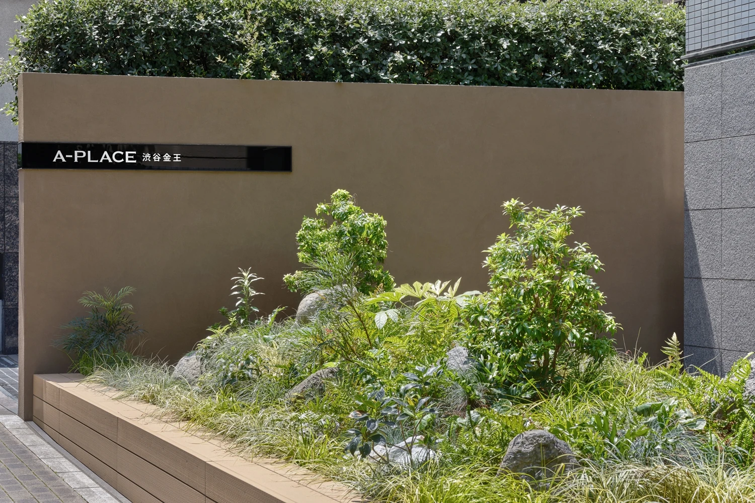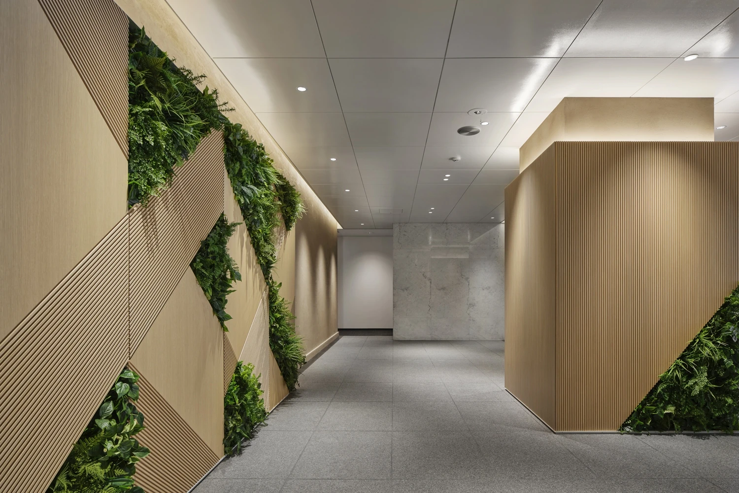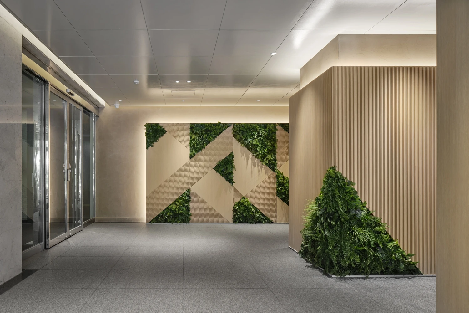 「本物の素材」で魅せるニュートラルなデザインをテーマに、普遍的なデザインで安心感を生み、多様な企業が入居しやすい空間を目指しました。人の流れを意識したアプローチには、本物の素材を用い、閑静な立地の中で静かに存在感を放つデザインを採用。また、東急コミュニティー様のサスティナビリティの方針に基づき、一部オーガニック素材の塗料を用いました。自動ドアを抜けた先にはフィーチャーウォールを配置し、エッジの効いた造形で渋谷らしい先進性を表現するとともに、グリーンと木目調を取り入れることで安心感を実現しました。