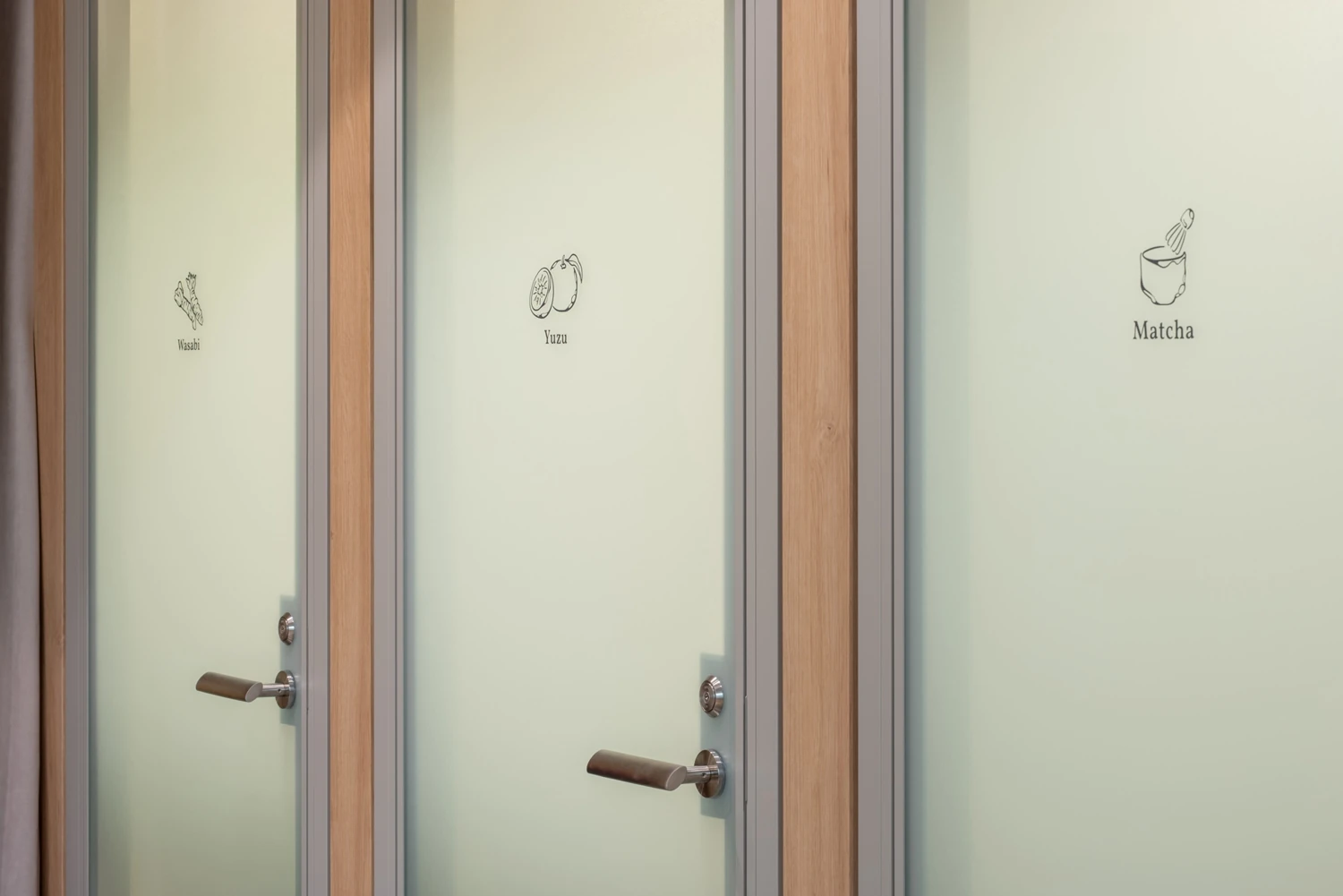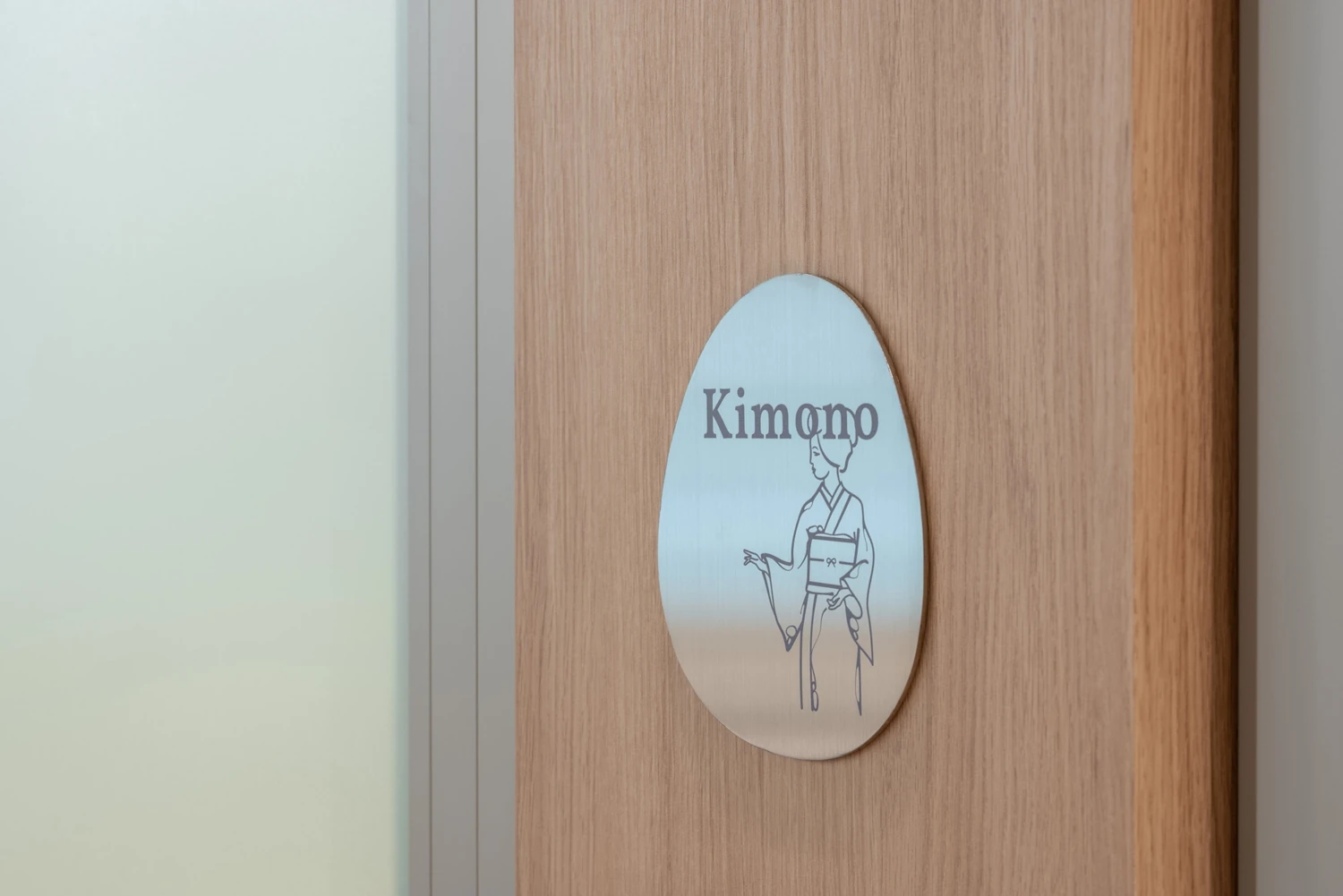 ルームサインは、雫が流れるようなタッチとスキンケアを連想させるみずみずしさを掛け合わせ、ブランドの世界観を抽象的に表現。視線を引きつけるアイキャッチとしての役割も果たしています。また、会議室サインで資料している金属プレートには柔らかな丸みをもたせることで、冷たさを和らげ、洗練さと温かみを両立させています。