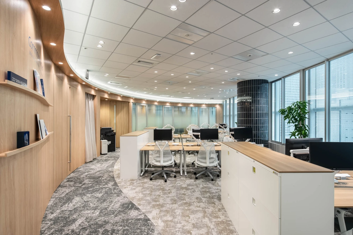 女性社員が多いことから、落ち着いた大人っぽい雰囲気のオフィスづくりを目指し『曲線美で繋ぐ調和』というコンセプトを策定。Medical Luxuryを体現すべく、クリーンでメディカルな要素を落とし込みブランドイメージカラーの適用することで、社員の方々がリラックスして楽しく働ける環境を目指しました。ブランドを体現する柔らかい曲線をつくりだし、その曲線を空間全体でつなげることで、「らしさ」を感じられる空間を設計しています。