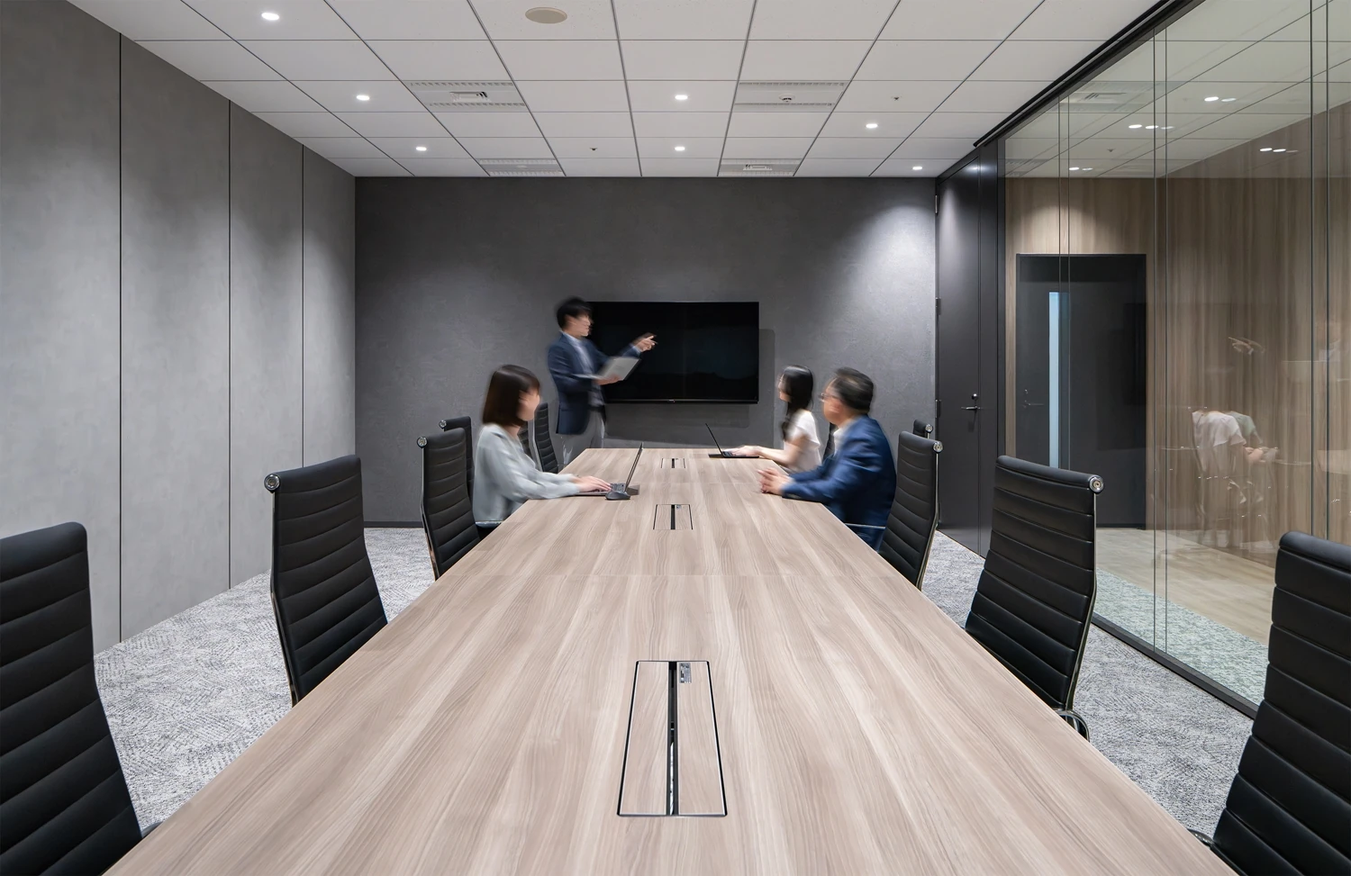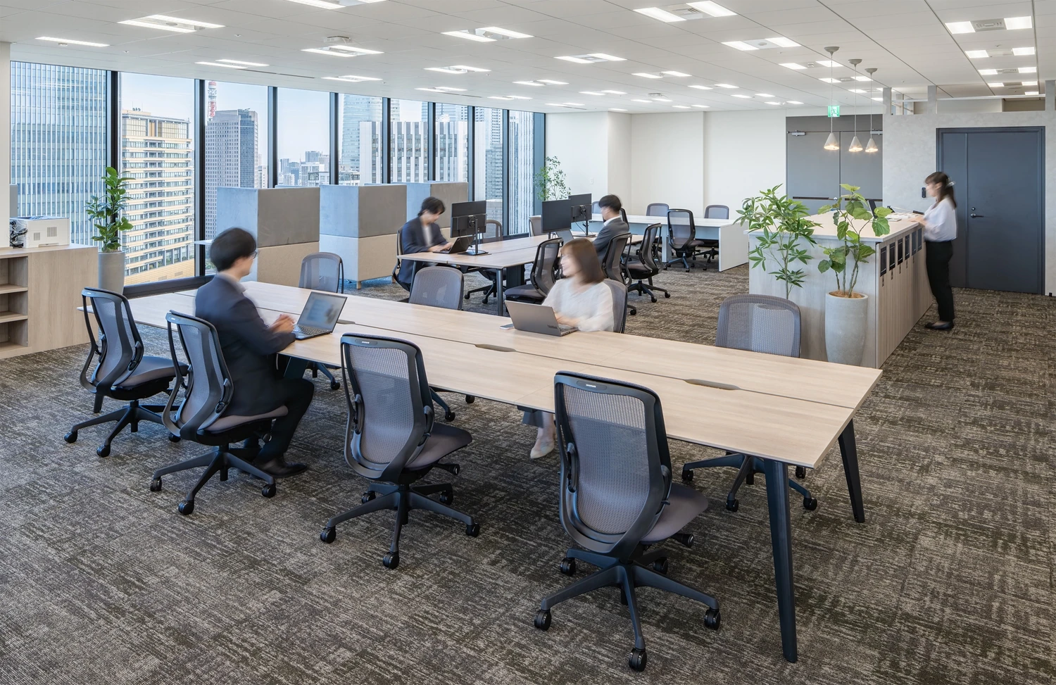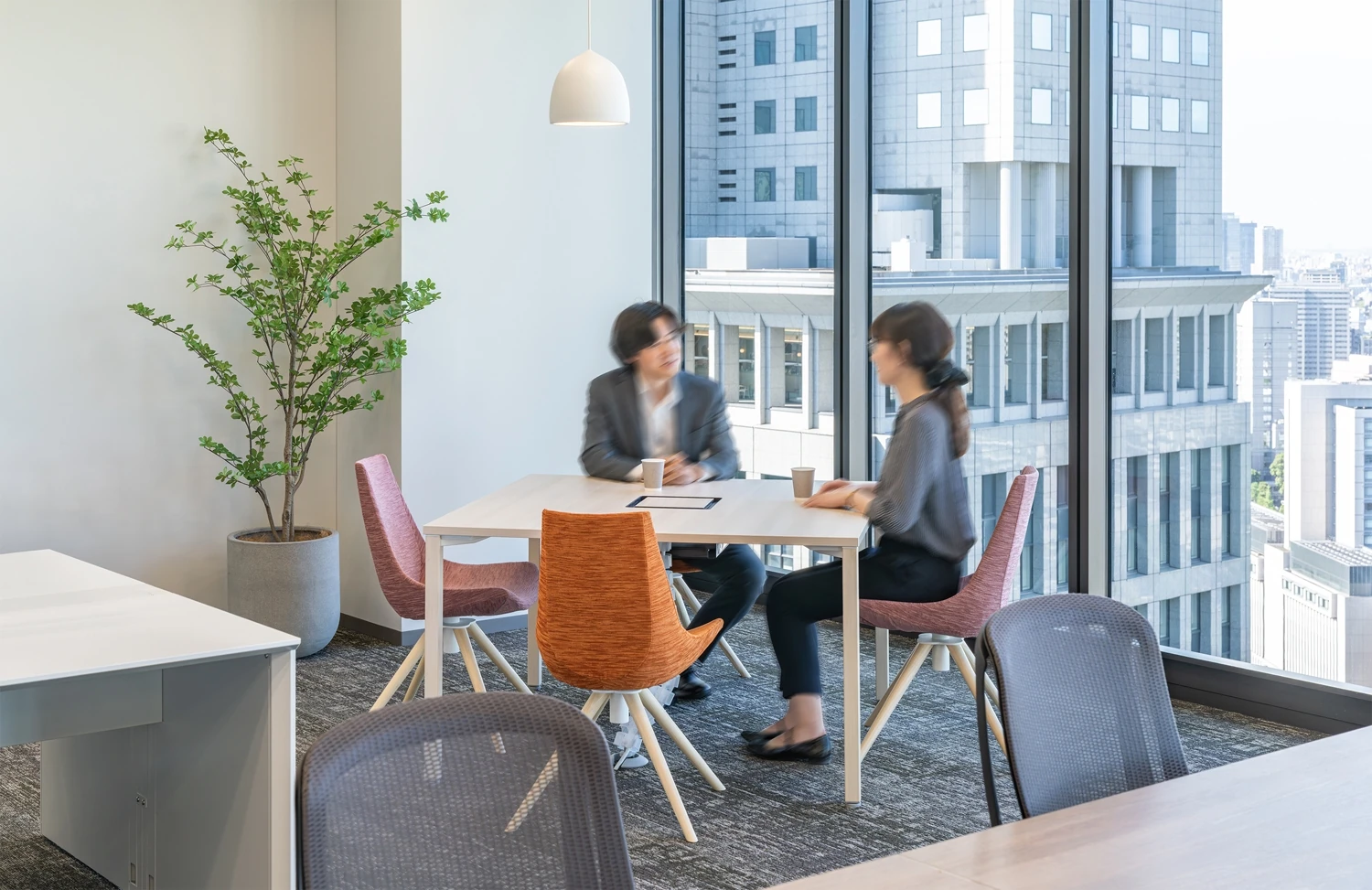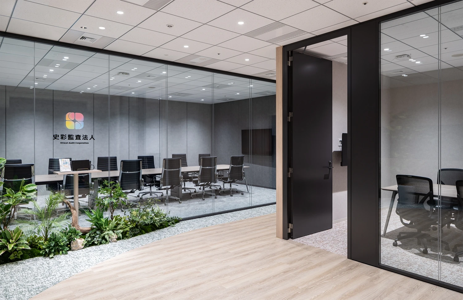 コンセプトは『彩ってしるす』。これまで育んできた「らしさ」を残しながら、これから目指していきたい理想の姿を掛け合わせることで、新たな課題を解決し続けるプロフェッショナル集団としての在り方を空間に投影しました。社員一人ひとりがメリハリのある働き方を選択し、ワークライフバランスを尊重できるオフィスを目指しています。これまで整然と並んでいたデスクは、あえて角度を振って配置。視線が自然に交わり、多方向の動線が生まれることで、偶発的な出会いや会話が生まれる構成としました。各デスクの周辺にはミーティングや雑談に使えるコミュニケーションスペースを、また動線上にはパントリーを設け、日常のなかで人が集うマグネットスペースとして機能するよう設計しています。一方で、集中を要する業務に向けた半個室ブースや、気分転換に適した窓側カウンター席など、多様な働き方を支える環境も整備。時間帯や業務内容に応じて、自らのリズムで働くことができる柔軟性を重視しました。エントランスでは、人と人とのつながりを象徴する「縁(円)」をモチーフにデザインを構成。訪れるお客様とのご縁を大切にする史彩監査法人様らしさを表現しています。会議室はガラス壁にすることで、開放的で透明性のある空間にし、気持ちの良い印象を与えています。既存家具との調和を意識したシンプルなベースデザインのなかに「彩り」を彷彿とさせるようなカラーの家具で表現しています。