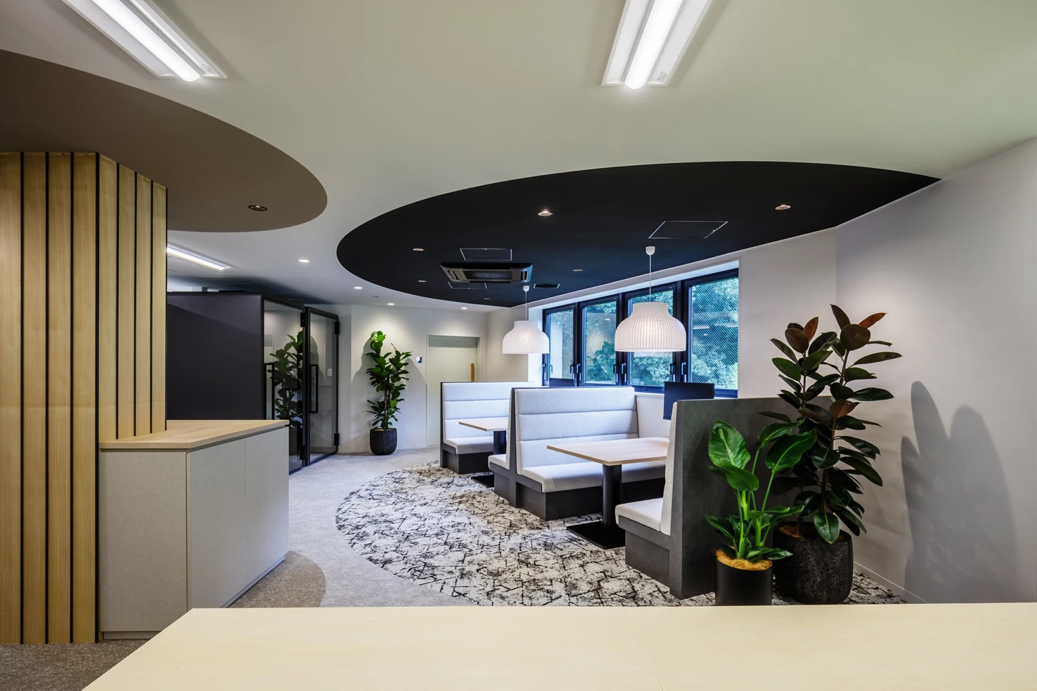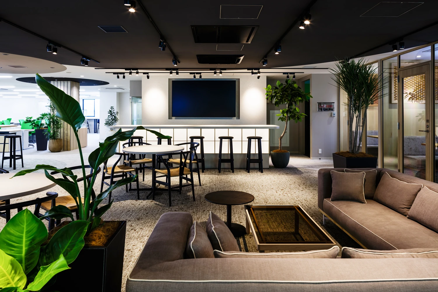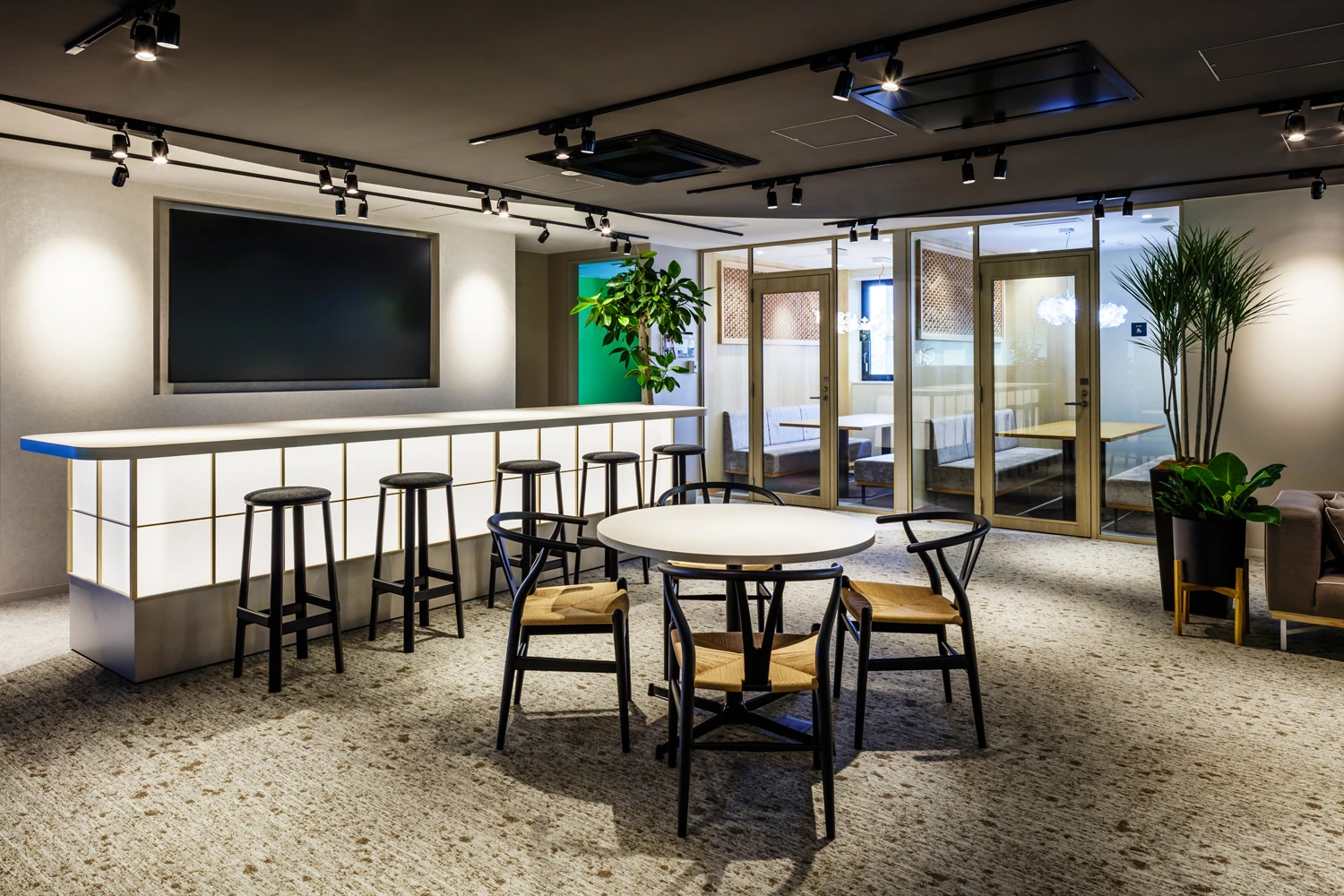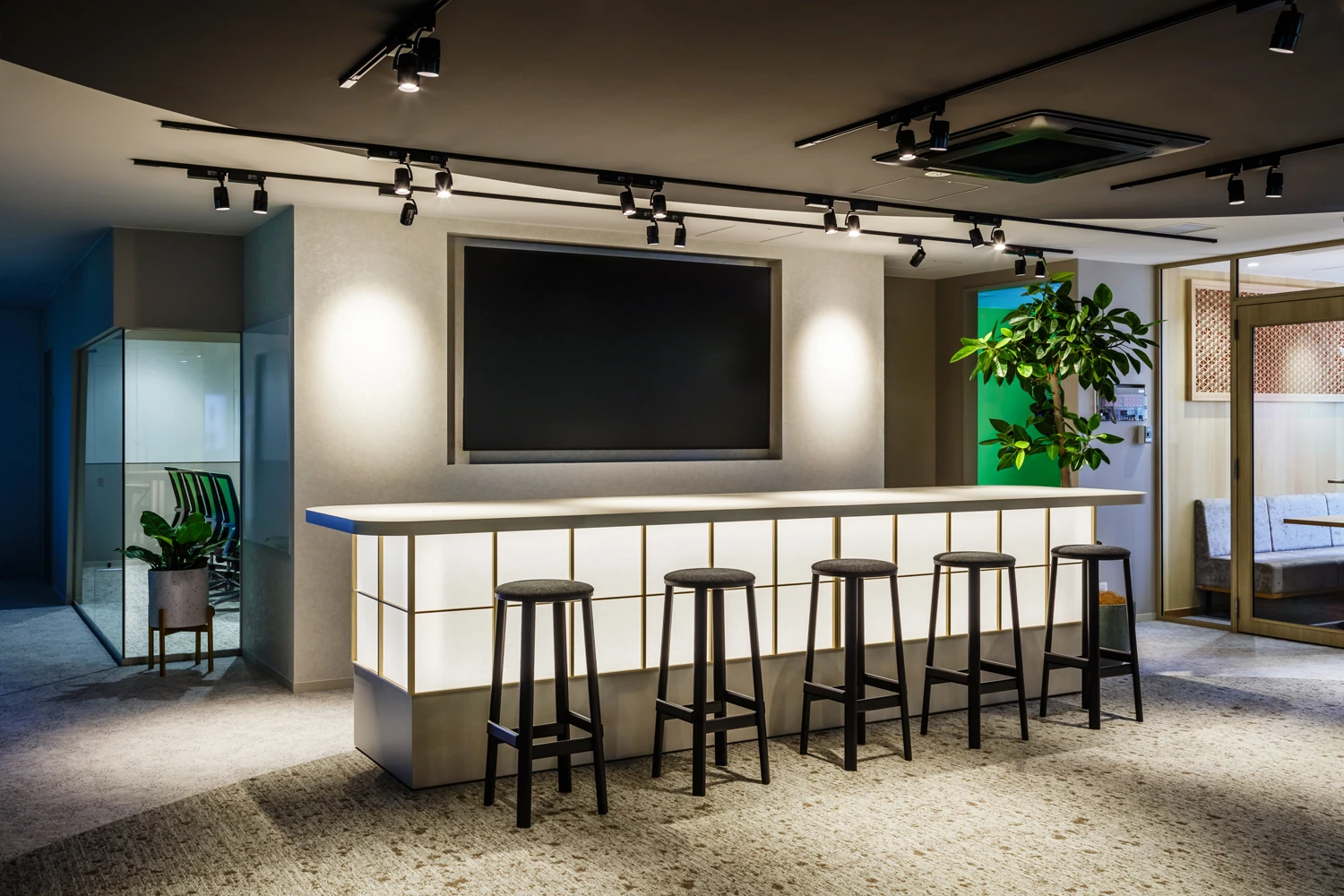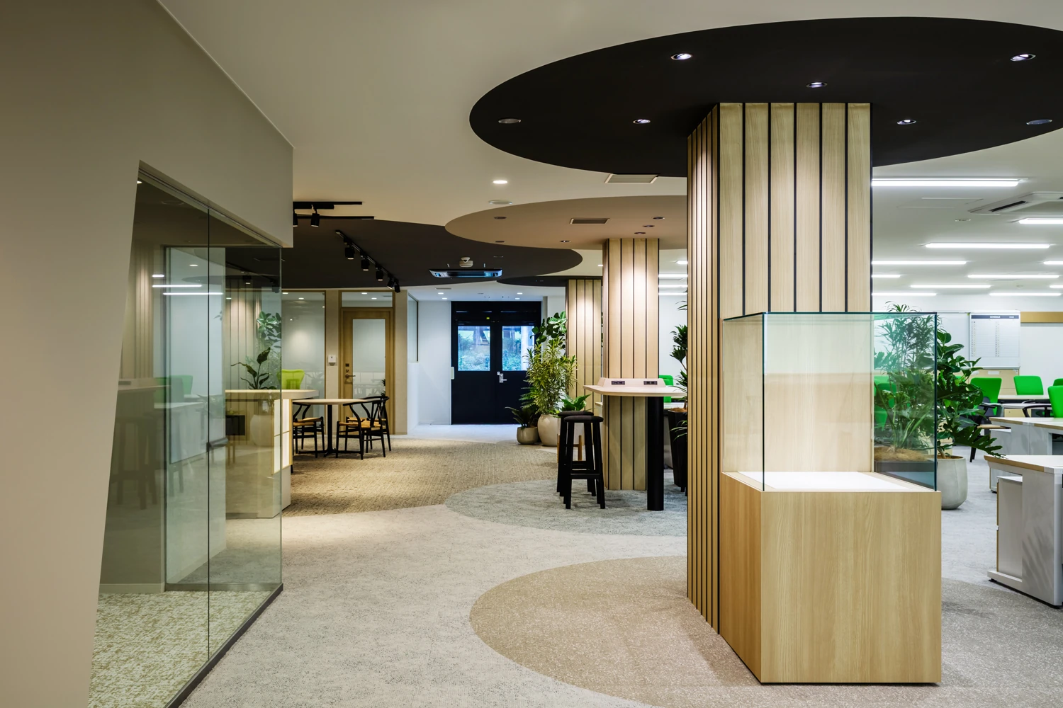 コンセプトは、小さな出来事でも時間の経過とともに大きな影響を及ぼす可能性があるという意味の言葉である『butterfly effect』。既存壁や什器を活かしたレイアウトやちょっとした工夫が大きな効果をもたらし、全体へ広がることを目指しました。デザインは、太陽ホールディングス様の当事業所に共通する「和モダン」のなかに要望にあった「遊び心、心地よさ、明るい雰囲気」という要素を落とし込みました。効率や規則性はもたせたまま、オフィスにちょっとした遊び心を取り入れるために固定席である働きやすさはそのままに、打ち合わせなどでコミュニケーションが取れる場所を各所に配置。使われていなかったリフレッシュグッズを整理整頓し、スペース全体を有効活用できるよう工夫しています。また、既存の柱にはあえて存在感を与えるデザインを施し、その柱の周りに人が集まる仕掛けをつくることでマグネットポイントが目立つようにデザインしました。また、リフレッシュスペースやコミュニケーションスポットには大きさや色の異なる円を多様にあしらうことで、ワークスペースとは違った動きのある空間となっています。
