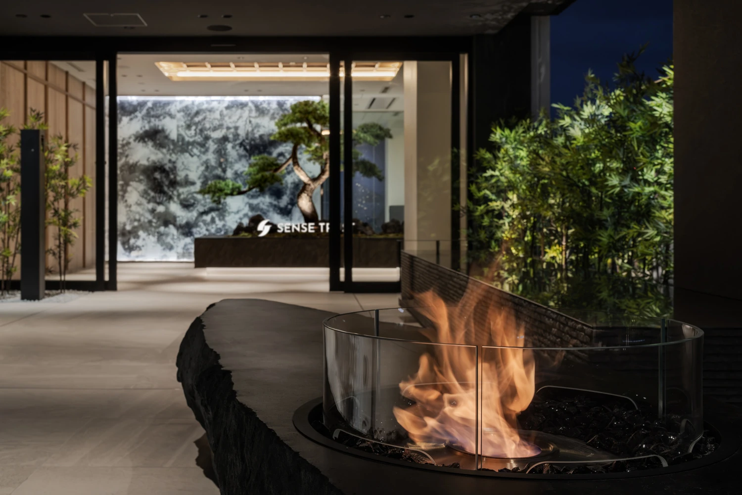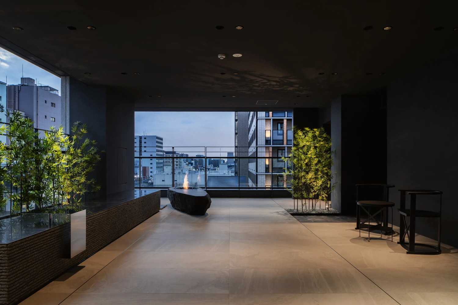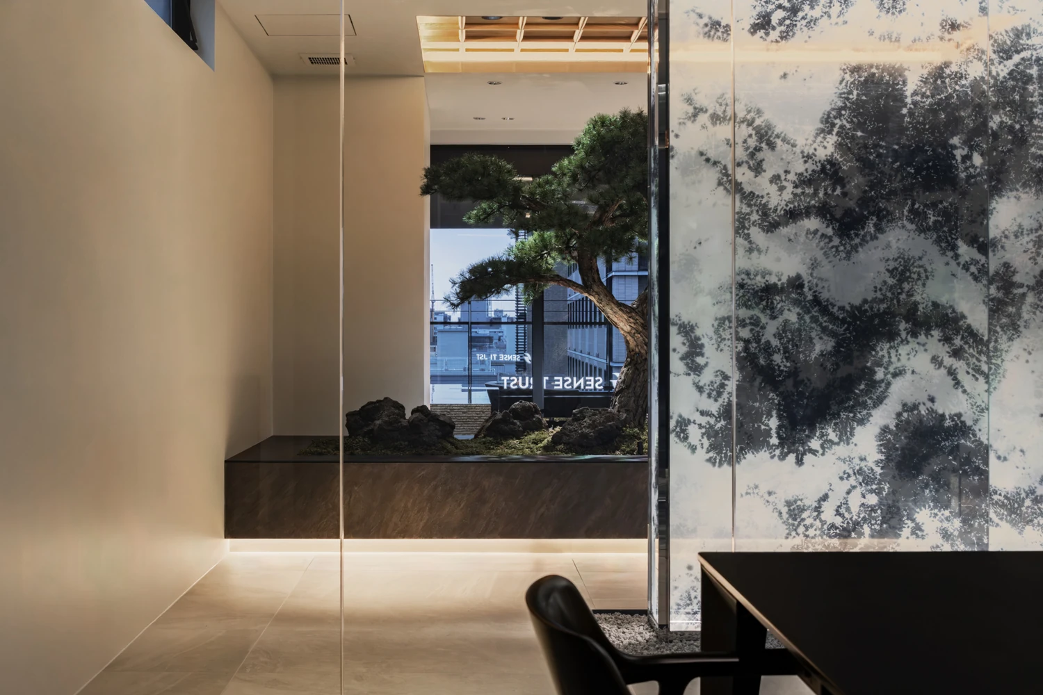 通路を挟んで左右に振り分けた居室の配置は、抜け感や光の対比バランスを強調させるレイアウトに。 ワークスペースや各トイレの扉は視線から外し、 来客スペースの雰囲気を壊さず、穏やかで上質な時間が流れるよう配慮しています。エントランスには、大きな松の盆栽が象徴的に鎮座し、随所に使われた京都の建材がもたらす上質な質感で“おもてなし”の心を表現しました。四条通りをのぞむテラスでは、暖炉と竹林が織りなす癒しの時間が流れるような空間を演出しています。