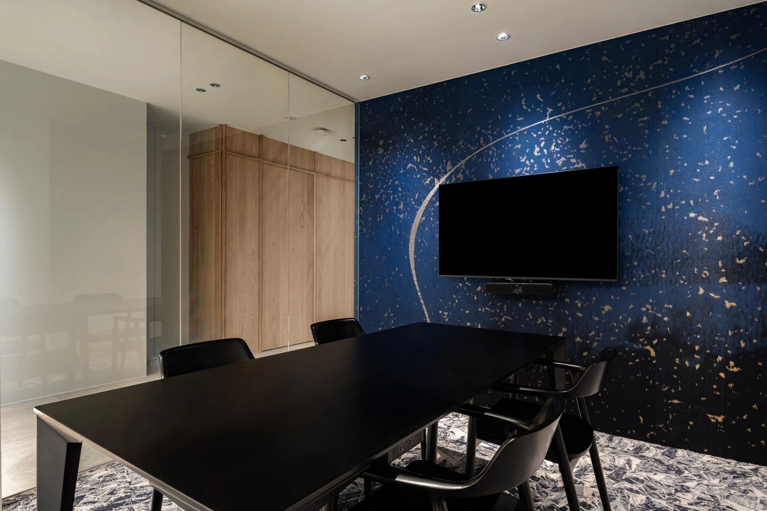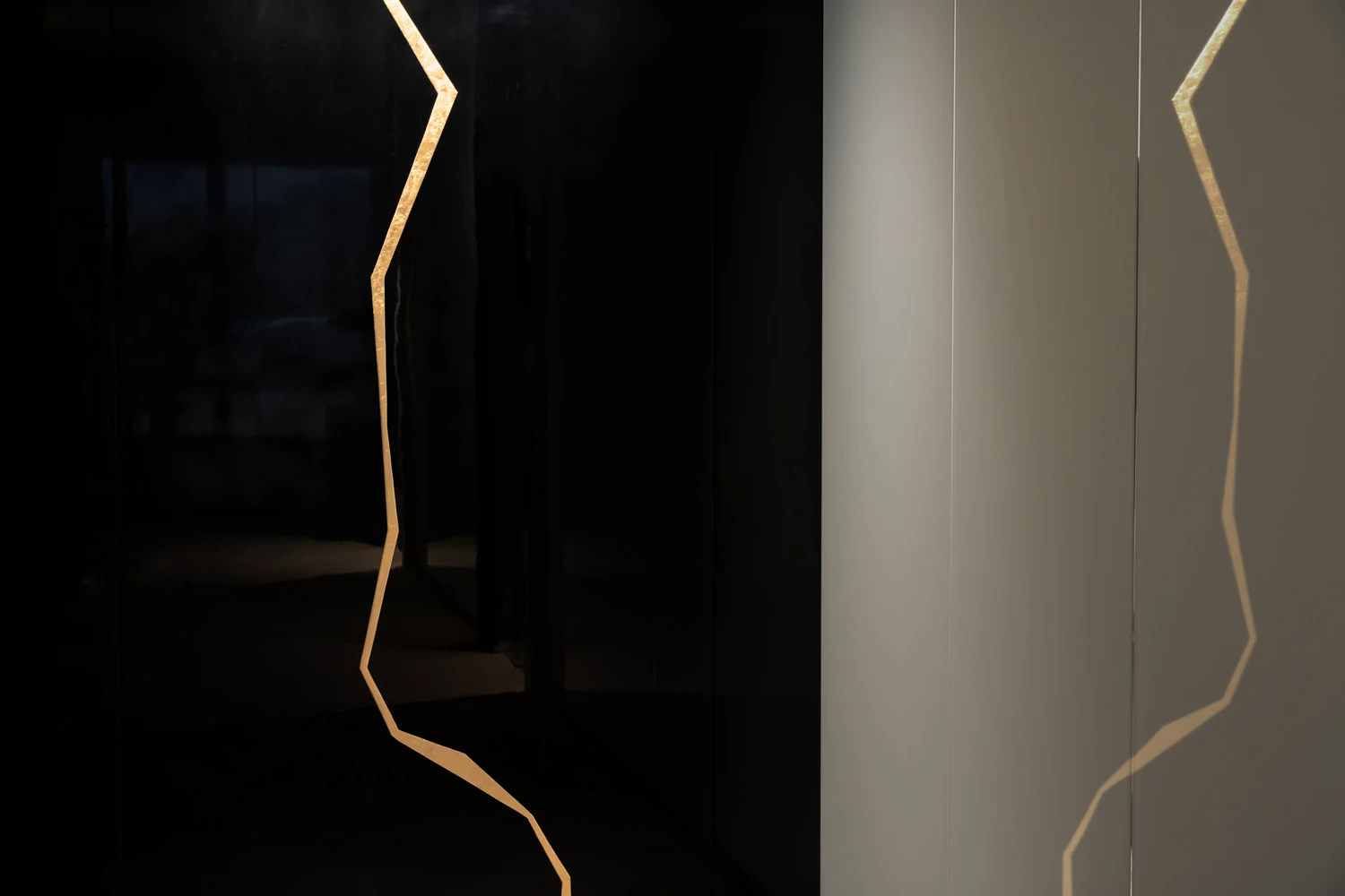 各ミーティングルームは「風神」「雷神」をテーマとし、ポップすぎず古風すぎない、オリジナリティのある表現にこだわりました。サインは立体感を演出するため、パーツを二層構造で設計。西陣織の壁面には稲妻と風を直線と曲線で描くことで情緒的な印象と力強さを添えています。また、人と人のつながりを重んじるというメッセージを込め、通路の奥面には京都の伝統技法、金継ぎを壁面に採用しています。