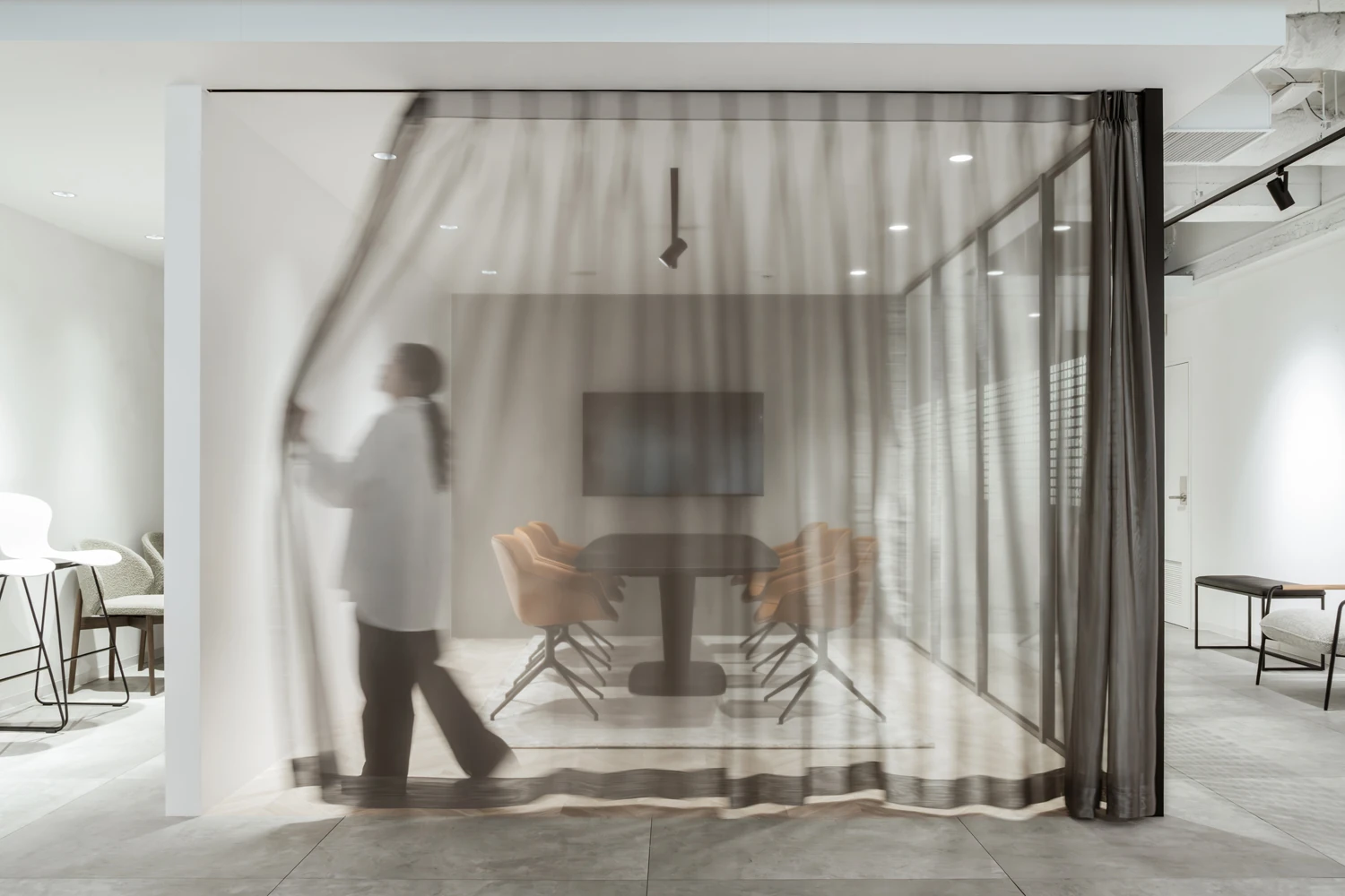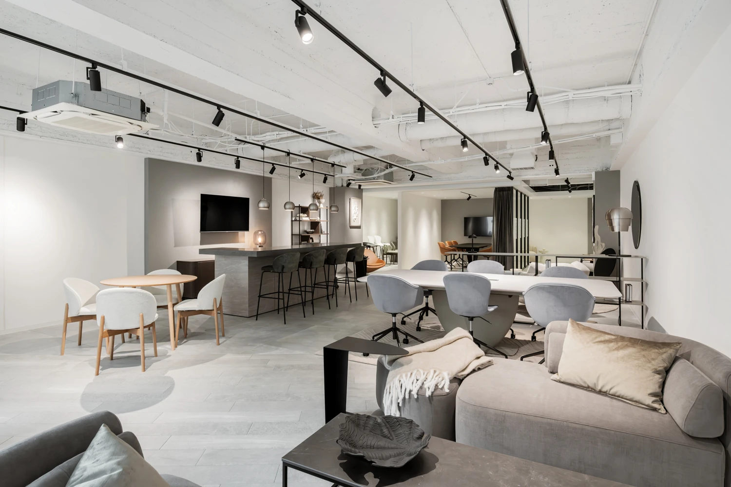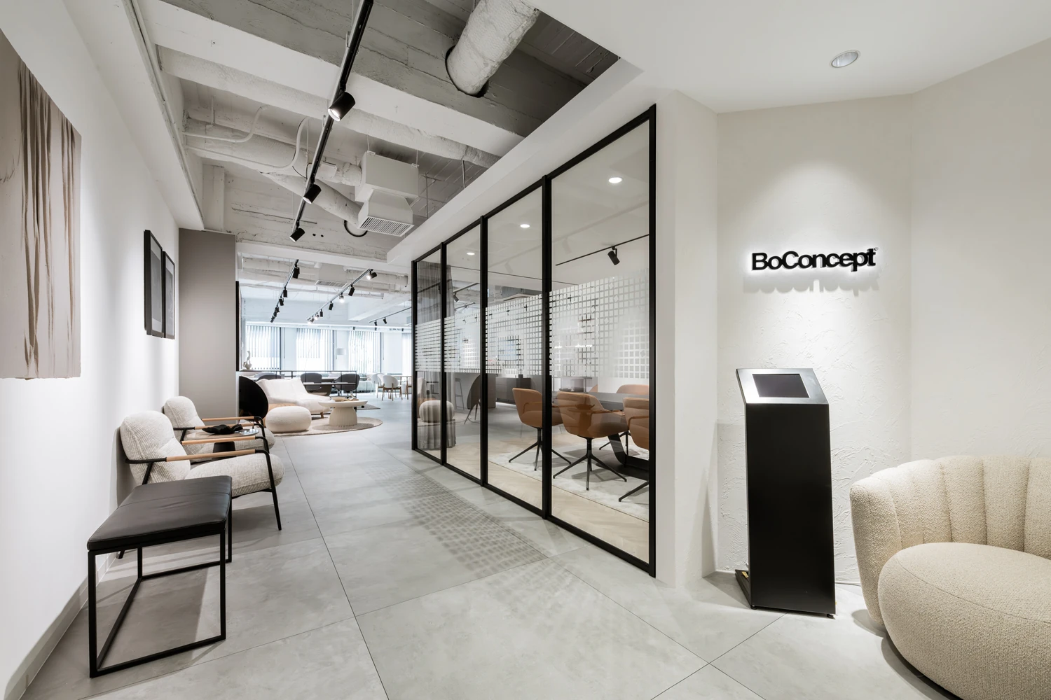 コンセプトは『Hygge を体現するオフィス』。ボーコンセプト様が大切にしている「Hygge」の考え方をオフィスで体現することを目指しました。「Hygge」とはデンマーク語では”居心地の良さ”や”幸福感”を感じる状態、またそのための空間や時間を意味する言葉。具体的には、ロウソクを灯した温かい空間で、家族や友人とリラックスして過ごしたり、お気に入りのマグカップでコーヒーを楽しんだりするような、精神的な豊かさや満たされた暮らし方そのものを意味しています。ショールームとしての活用を想定し、今後製品が変更してもフレキシブルにレイアウト変更ができるように設計しました。間仕切りに施すフォグラスシートのデザインも細部までこだわり、ボーコンセプト様の代表商品である「Nawabari」のシルエットをパターンとして取り入れ、柔らかな印象を演出するために、手描き風の鉛筆タッチによる背景柄を採用しました。設計の工程としては、一般的なオフィスのレイアウトをつくり、それをベースにボーコンセプト様の家具に置き換えることで空間を形成。ボーコンセプトのファニチャーを随所に配置し、ブランドを“リアルに感じられる”オフィスとして具現化しました。
