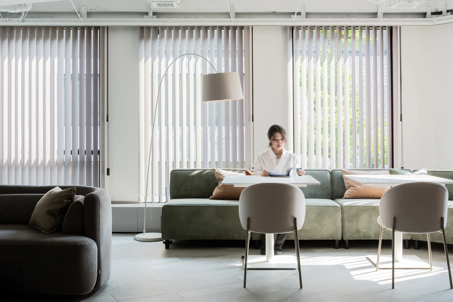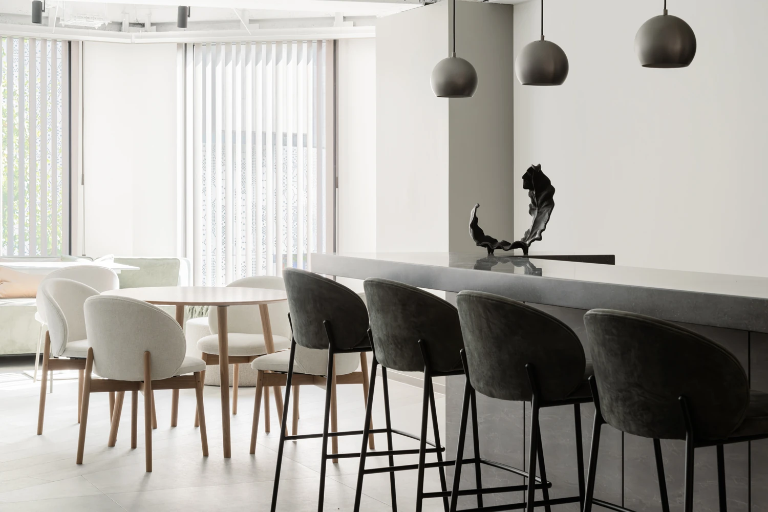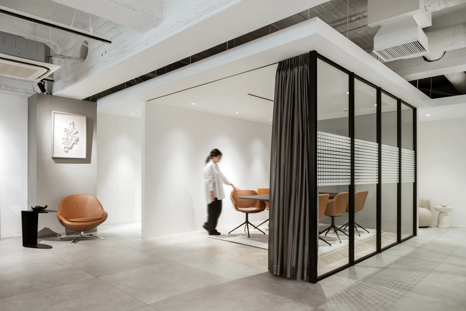 コンセプトは『Hygge を体現するオフィス』。ボーコンセプト様が大切にしている「Hygge」の考え方をオフィスで体現することを目指しました。「Hygge」とはデンマーク語では”居心地の良さ”や”幸福感”を感じる状態、またそのための空間や時間を意味する言葉。具体的には、ロウソクを灯した温かい空間で、家族や友人とリラックスして過ごしたり、お気に入りのマグカップでコーヒーを楽しんだりするような、精神的な豊かさや満たされた暮らし方そのものを意味しています。ショールームとしての活用を想定し、今後製品が変更してもフレキシブルにレイアウト変更ができるように設計しました。間仕切りに施すフォグラスシートのデザインも細部までこだわり、ボーコンセプト様の代表商品である「Nawabari」のシルエットをパターンとして取り入れ、柔らかな印象を演出するために、手描き風の鉛筆タッチによる背景柄を採用しました。設計の工程としては、一般的なオフィスのレイアウトをつくり、それをベースにボーコンセプト様の家具に置き換えることで空間を形成。ボーコンセプトのファニチャーを随所に配置し、ブランドを“リアルに感じられる”オフィスとして具現化しました。