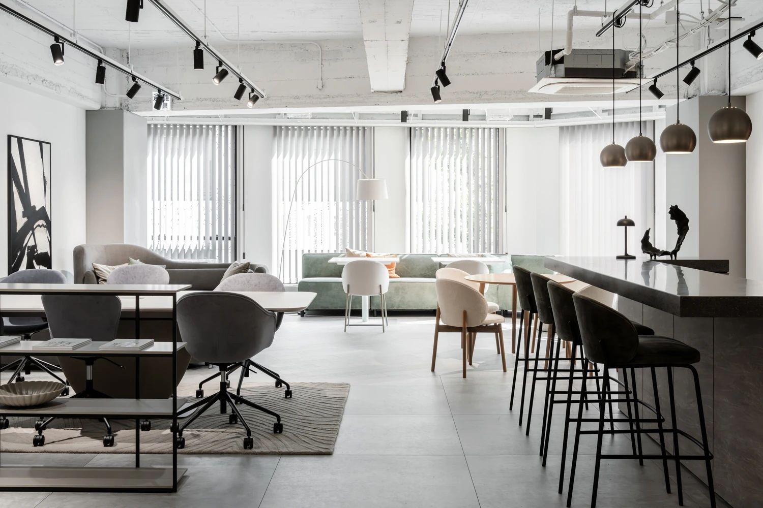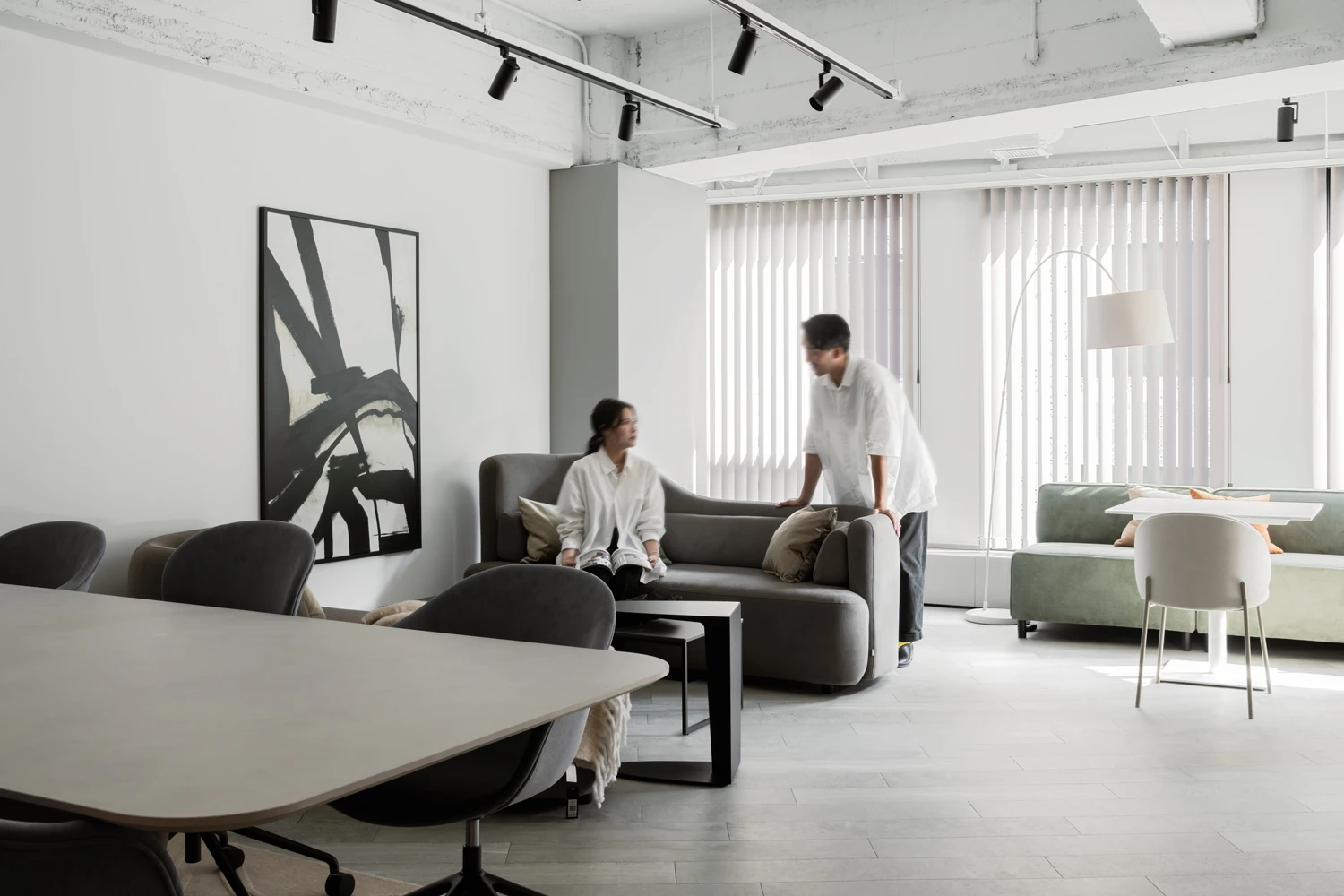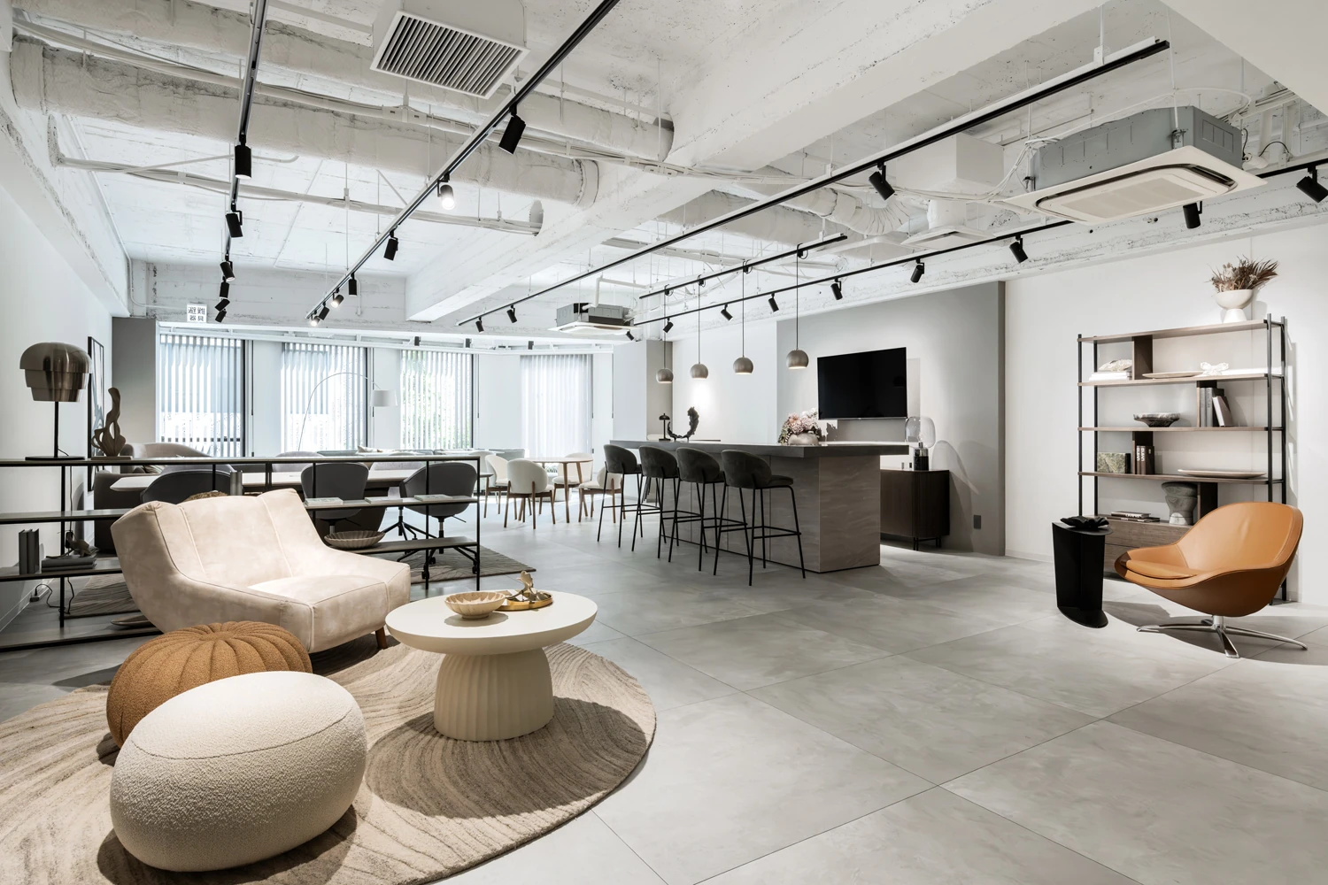 今後の事業拡大を見据えてスタートした開設プロジェクト。3名という少数精鋭のメンバーで働いている現在のアットホームな雰囲気を大切にしながらも、ショールームとしての機能を兼ね備え、家具の魅力を存分に引き立たせるような、洗練された雰囲気をオフィスの中に落とし込みました。 -