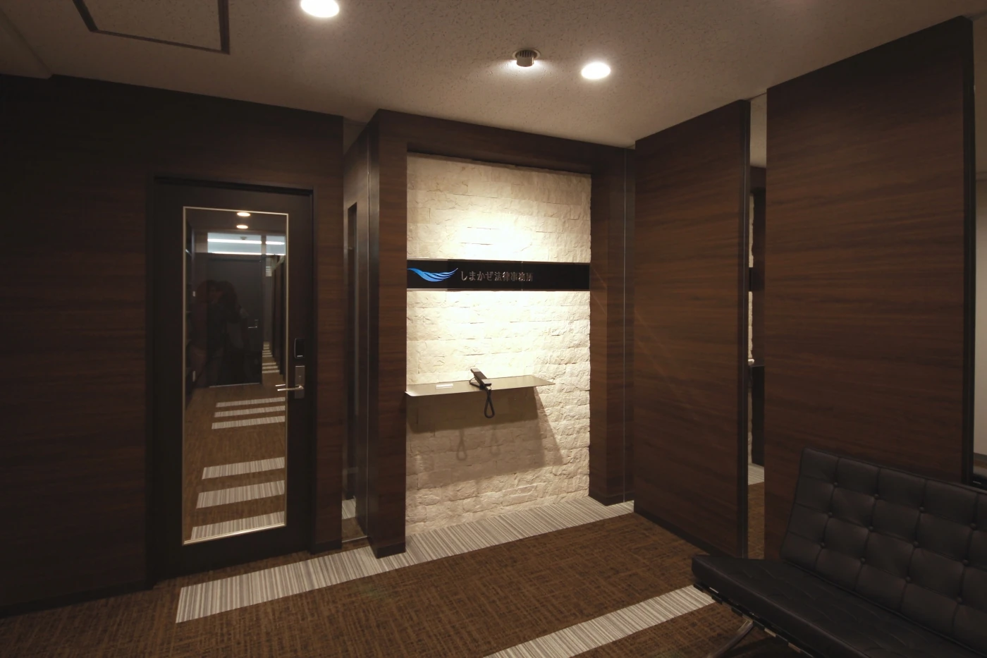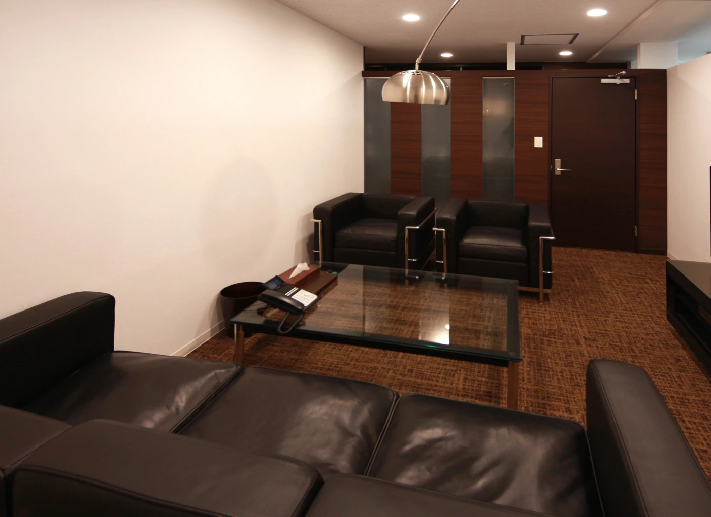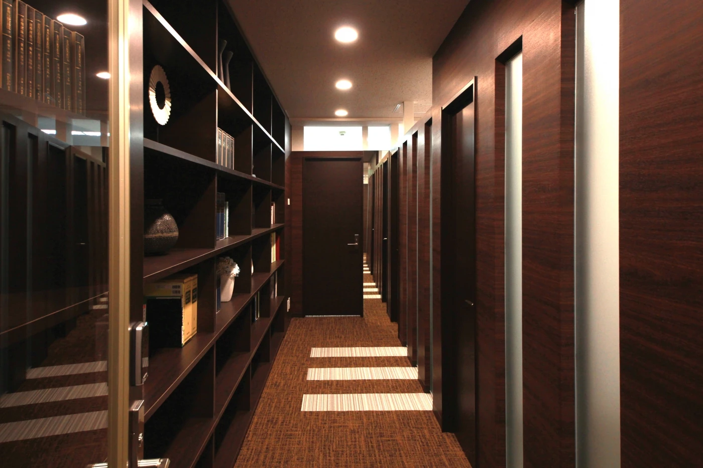 『信頼』『温かみ』『機能性』をキーワードに、事務所に訪れた方々に安心感を与えるよう、重厚感の中にも優しさを感じるデザインにしました。 エントランスにはガラス框ドア+スリットガラスを使用し、透明感や奥行き感を与え、来訪されるお客様が親しみやすい空間を創りました。ドアから見える奥の廊下スペースやエントランスサイドに設けたスリットミラーは、企業の風通りの良さを視覚から感じさせます。照明を温かみのあるダウンライトにすることで、空間を柔らかく演出し、緊張感をほぐします。また、今回は事務所開設に伴いデザインをした会社ロゴデザインは、CIを美しく表現しています。