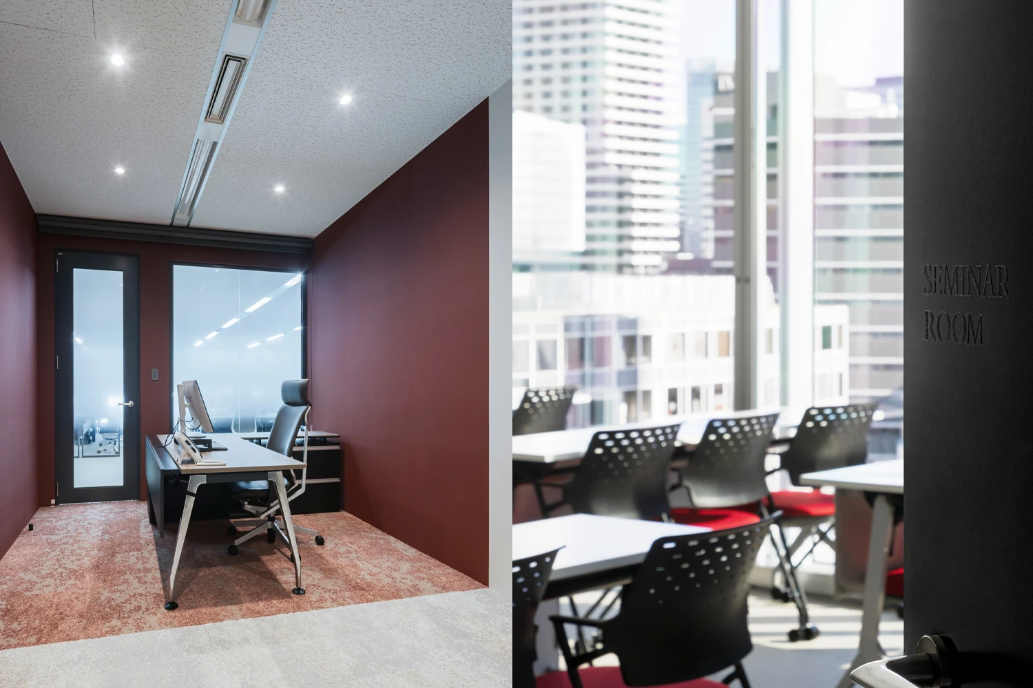 エントランスは、限られた空間の中でも多様なシーンに対応できるよう、機能性を重視。細長い空間の中心に大型のソファを設置しましたが、会議室の壁にガラスパーテーションを用いることで、多くの人が滞在しても圧迫感のないような工夫を施しています。また、プロジェクトの途中でコーポレートロゴが刷新されたこともあり、よりブランディングにマッチした空間を意識しました。エントランスや社長室にはロゴをイメージした深い赤を用いて、Reve Career Agency様らしい洗練されたエレガントな空間を構築しました。さらに、高級感とシックな印象を兼ね備えたサイングラフィックも制作。空間にさりげなく溶け込みながらも、控えめな上質さを演出しています。