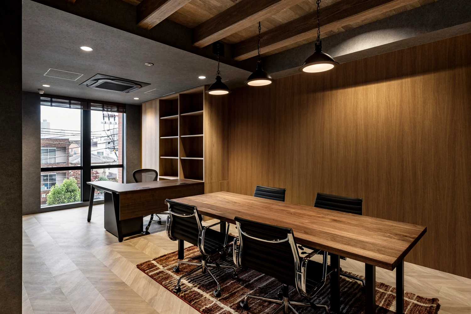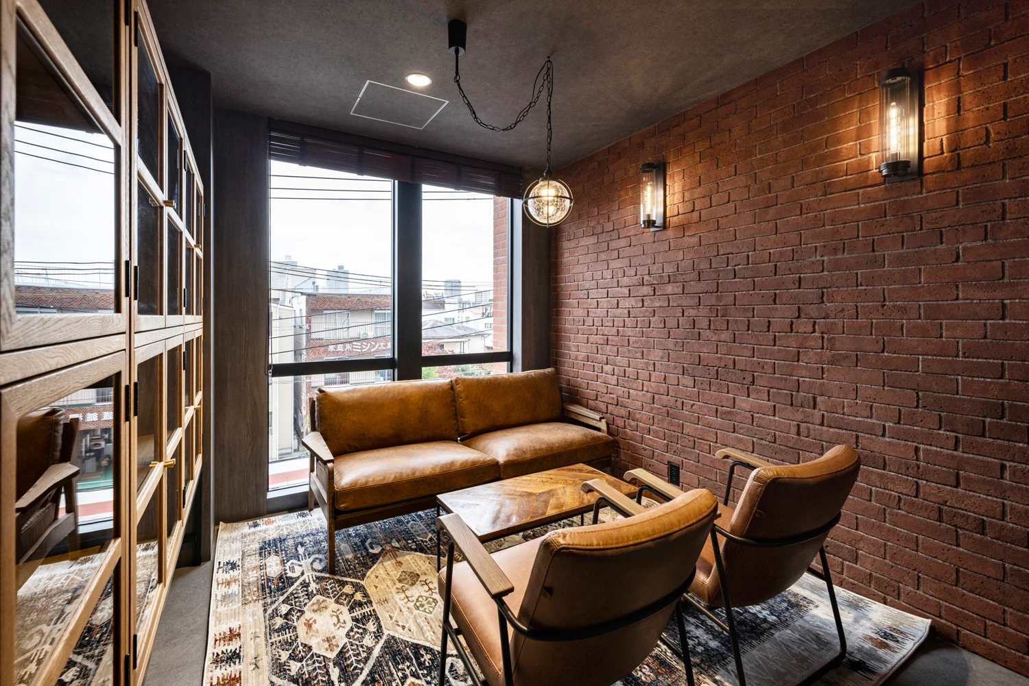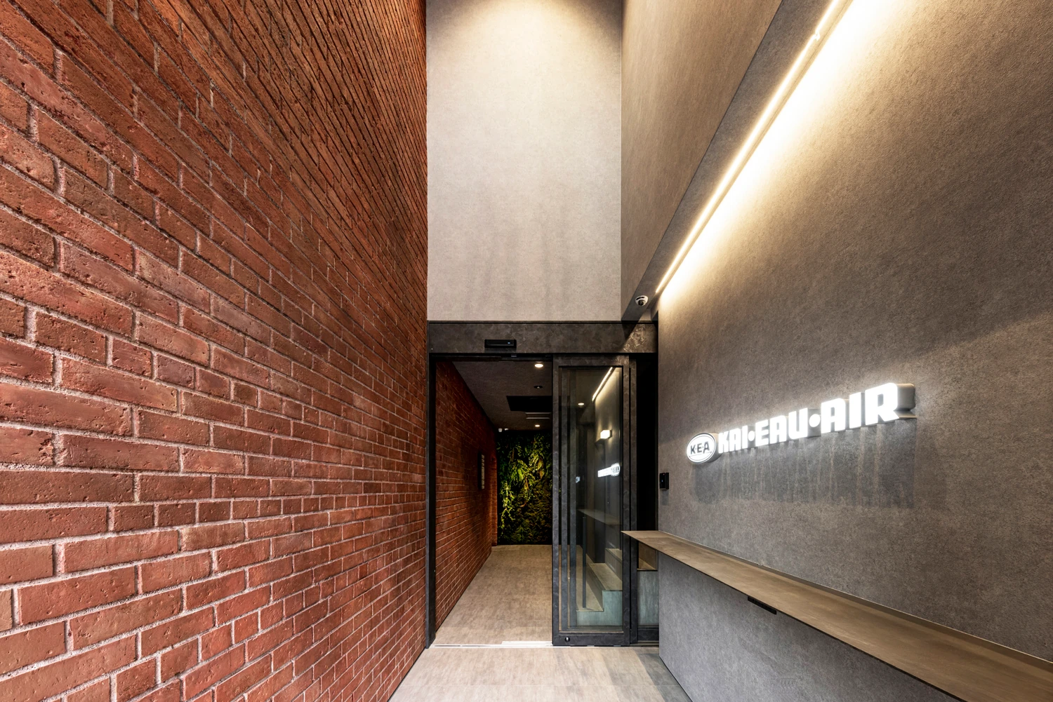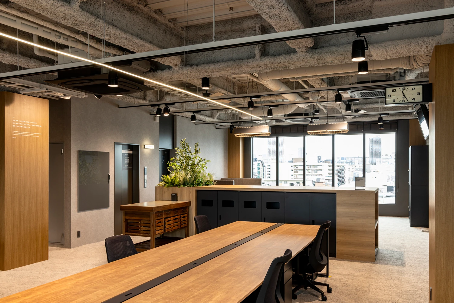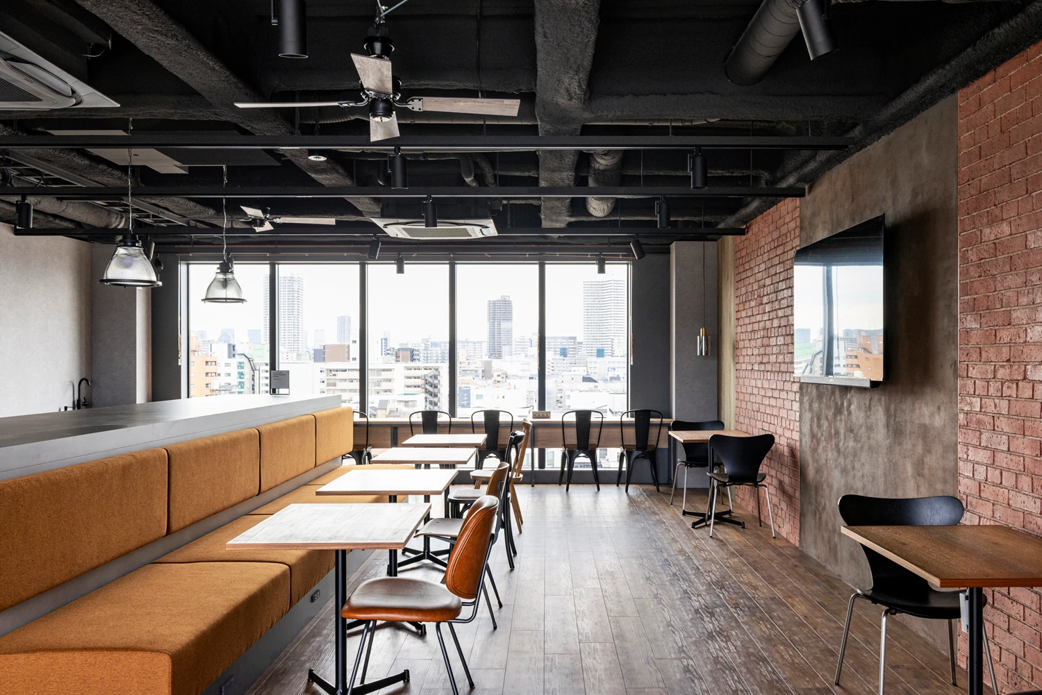 計6階あるフロアは、ブリックスタイルの素材感をベースに構成。各階の色や素材のエイジングなどに変化を加えながら、フロアで分かれていながらもつながりを感じられるよう、全体に統一感をもたせました。最上階はカフェスペースとして、イベントやリフレッシュエリアなどの機能をもち、屋外デッキスペースでは植栽を囲みながら、内と外が自然につながる、開かれた空間体験を創出しています。ブリックスタイルの素材感をベースとした構成であるため、特殊塗装を採用し、細かなエイジングの表情や色使いなどにこだわりました。窓周りの納まりをすっきりさせることで、空間を構成しているマテリアルが際立つよう、デザインをコントロールしています。