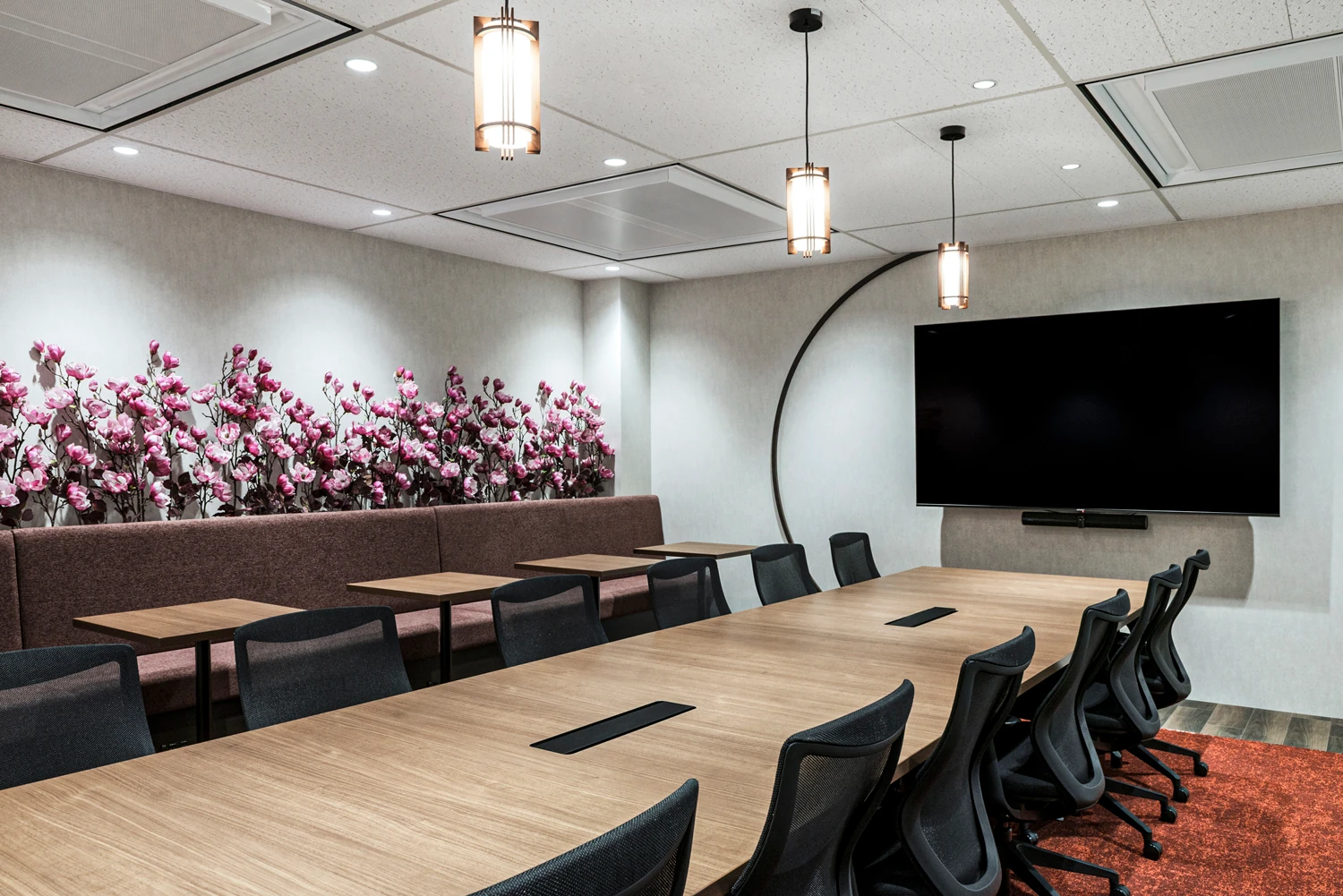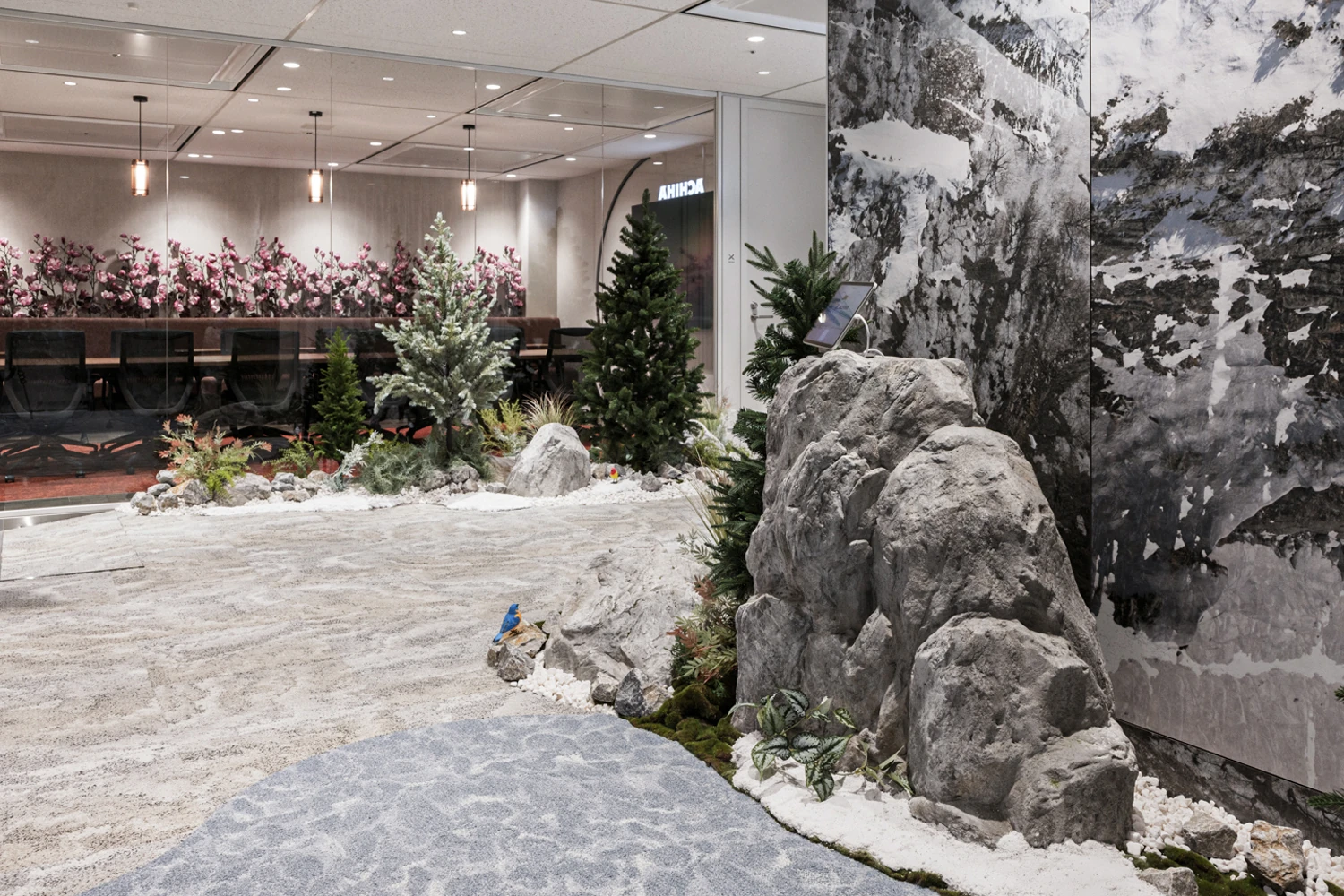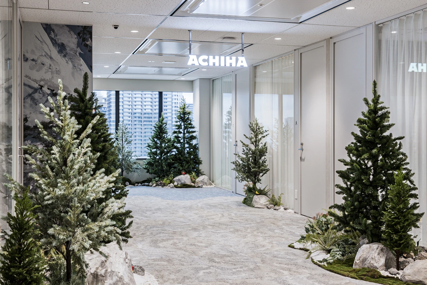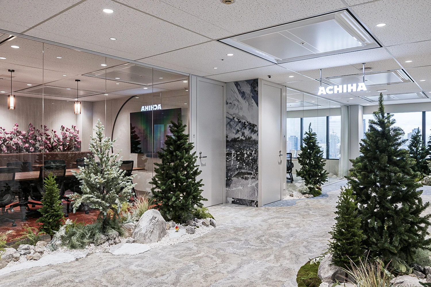 コンセプトは『アルパイン(Alpine)』。ヨーロッパのアルプス地方に広がる雄大な山々や雪に覆われた峰、湖畔の村といった高山風景をモチーフにオフィスをデザインしました。自然の力強さと静けさが共存する世界観をオフィス空間に取り込み、訪れる人が非日常の物語へと誘われるような体験価値を目指しています。働く環境としては会議室・ワークスペース・フリーエリアを明確にゾーン分けし、働き方やシーンに応じて最適な場所を選べる構成に。集中作業、打ち合わせ、リフレッシュなど、多様な業務スタイルに対応することで柔軟で快適な働き方を支援しています。エントランスには「高山」を象徴する山・木・湖といった自然要素を随所に散りばめ、ブランドの世界観を強く印象づける空間を演出。さらに、会議室ごとに異なるストーリー性を持たせ、ファンタジー、冒険、知恵、未来など多彩なテーマで構成しました。利用するたびに新たな発想や対話が生まれるよう、空間ごとに世界観を変え、創造性を刺激するデザインとしています。