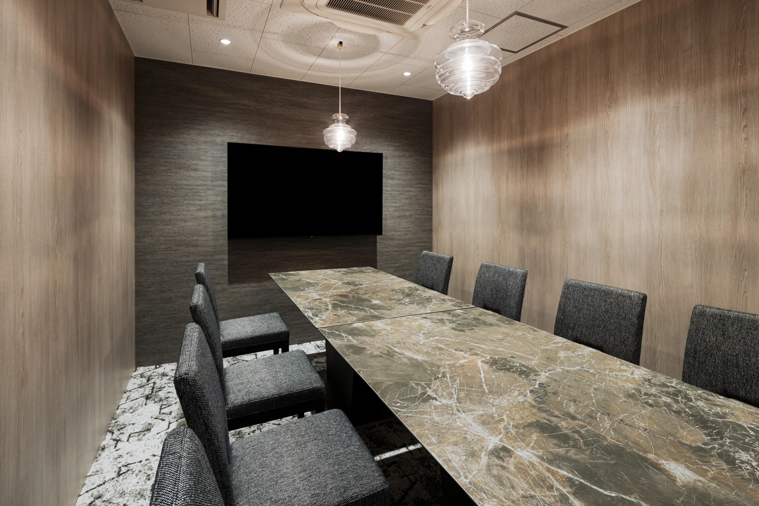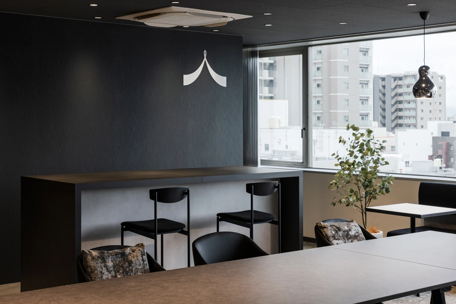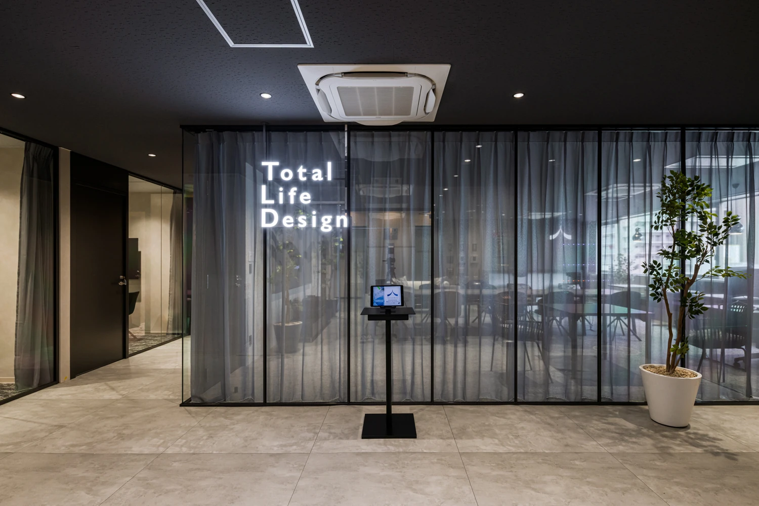 家具や内装素材はデザイン性と機能性を両立するものを選定し、来訪者には安心感と信頼感を、働く人には快適さと誇りを感じられる空間を実現。また、エントランスと執務室の間をガラスとシアーカーテンで構成することで、社内の雰囲気がやわらかく伝わり、心地よい働く環境とともに“透明性のある企業姿勢”を印象づけるデザインとしました。