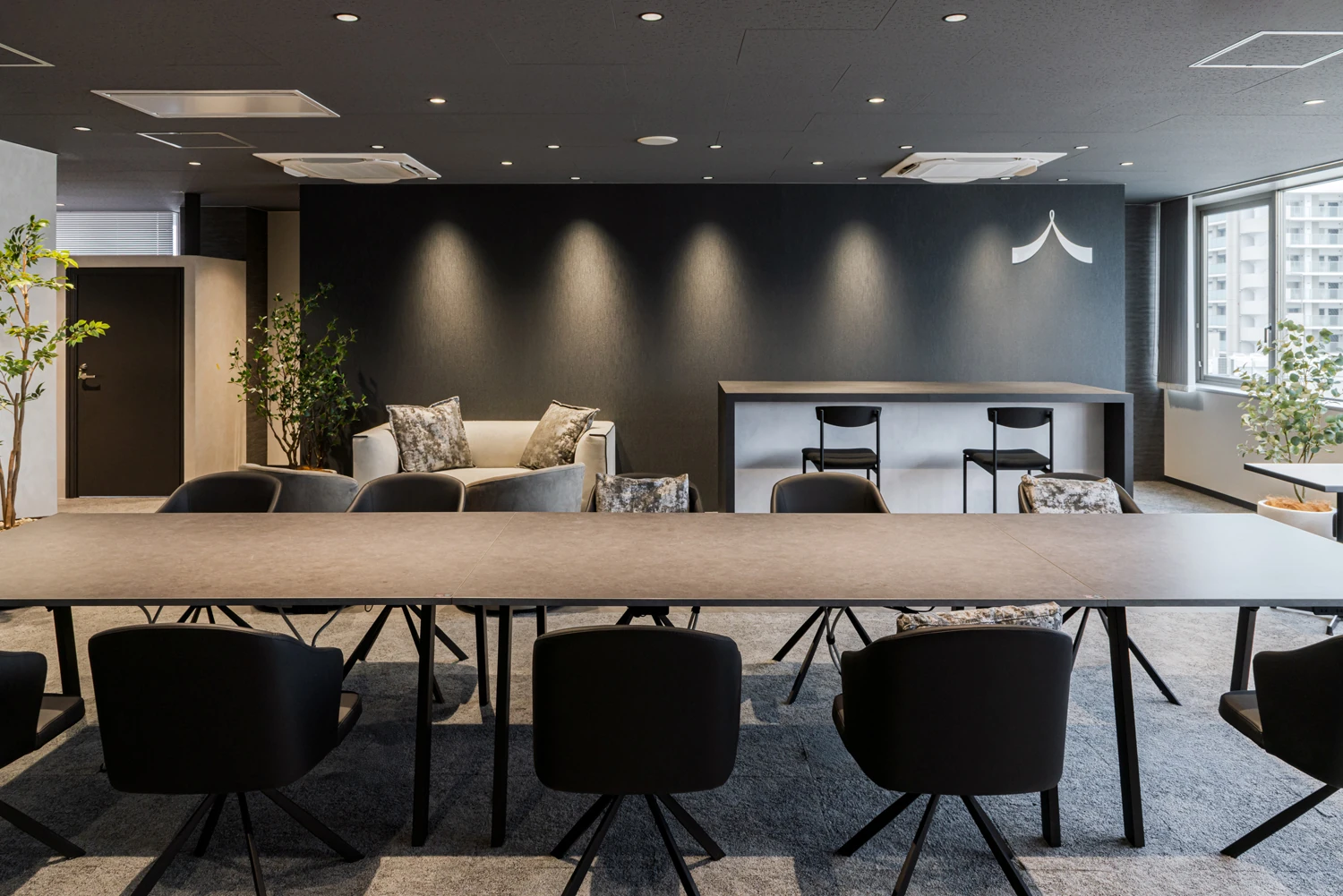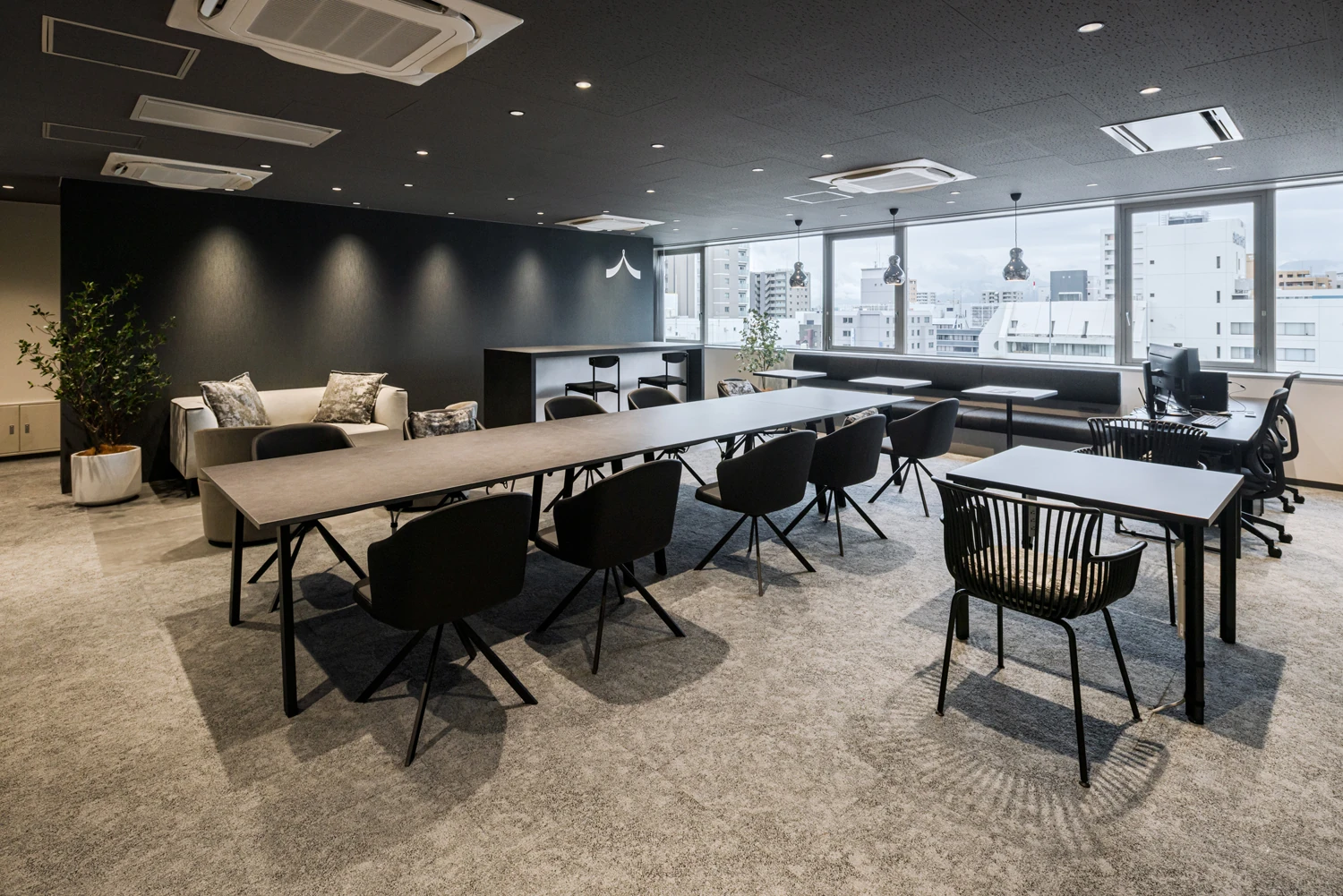 ビッグテーブルやソファスペースを中心に、フリーアドレスに対応した多様な働き方を受け止める構成とし、オフィスらしさが強く出る什器は視界に入りにくい位置へ。さらに意匠性の高い商材へ見直すことで、落ち着きのあるホテルラウンジのような空気感を整えました。