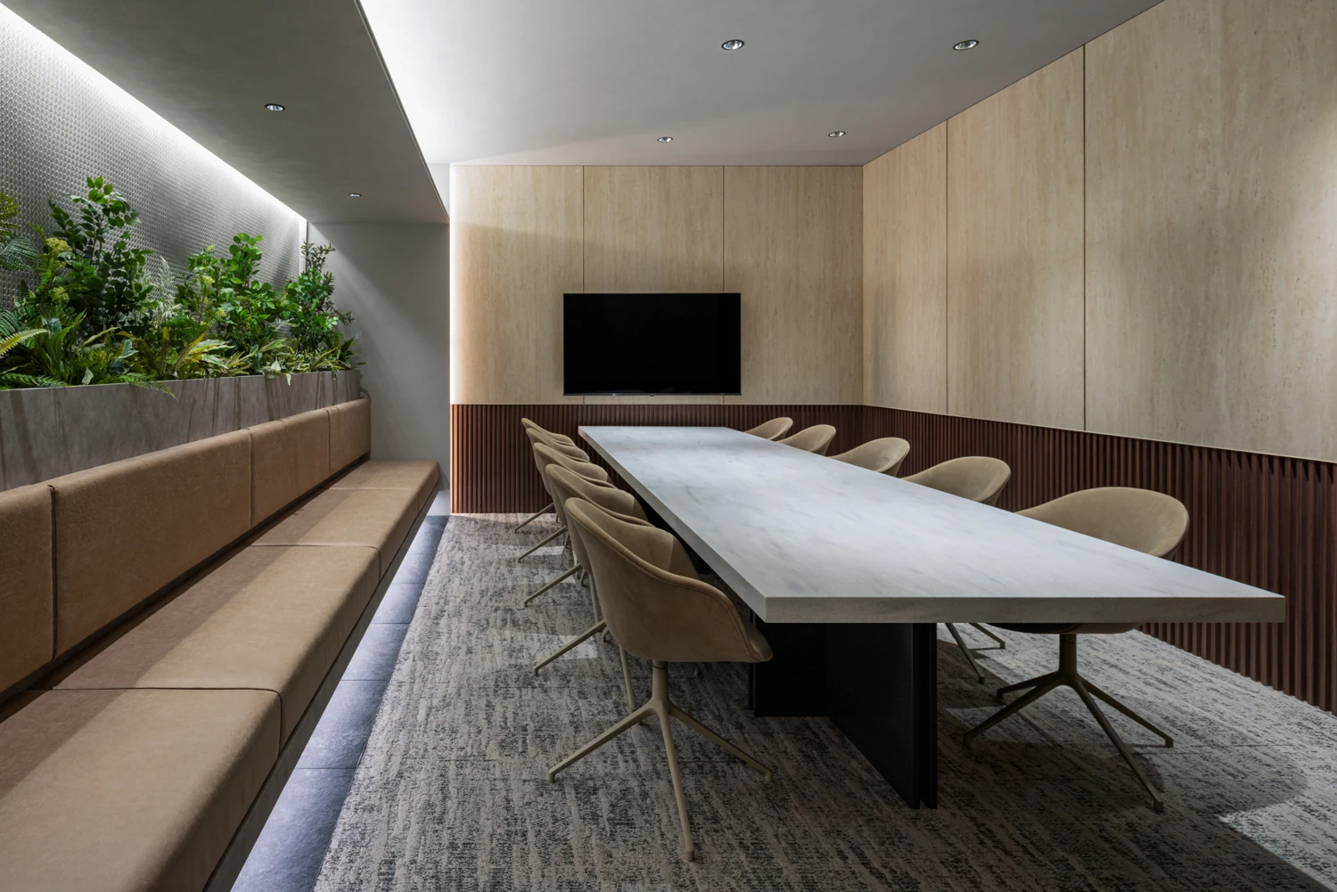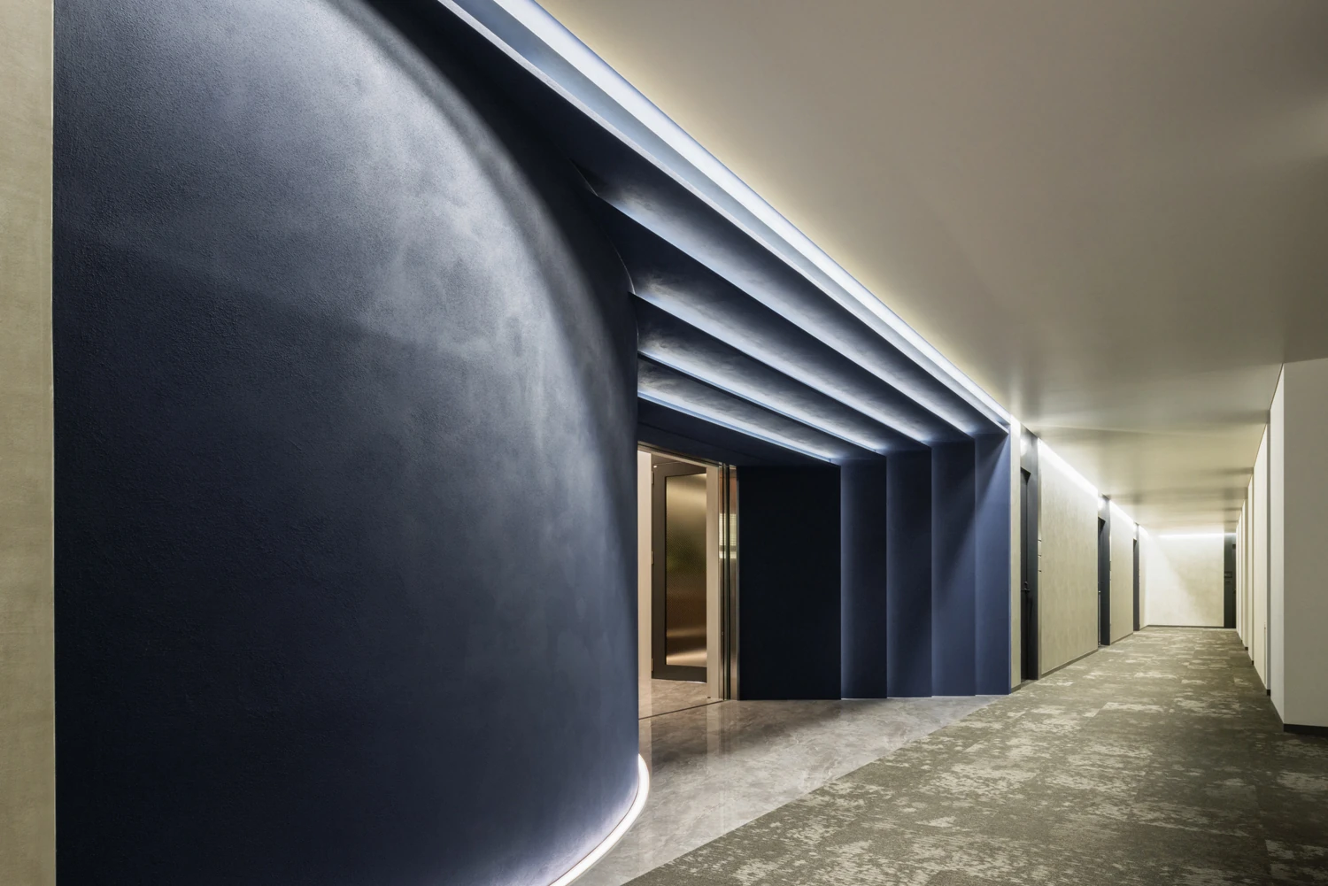 天井高を段階的に変化させることで、空間へ引き込まれるような視覚的・体感的な演出を実現。素材の質感にこだわり、余計な要素を削ぎ落としながらも、品格ある佇まいを追求しています。
