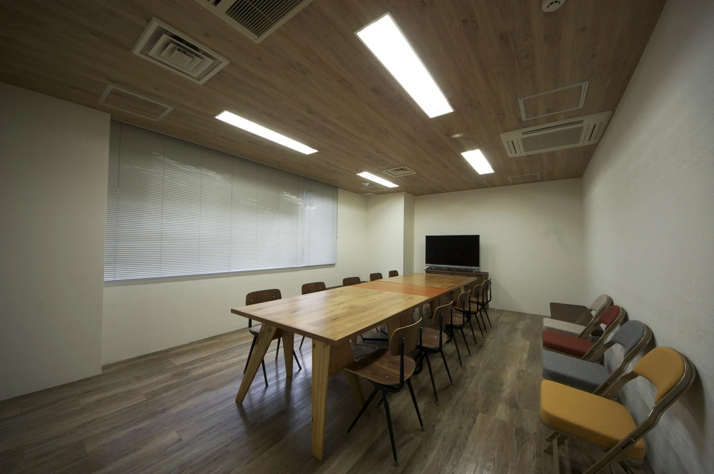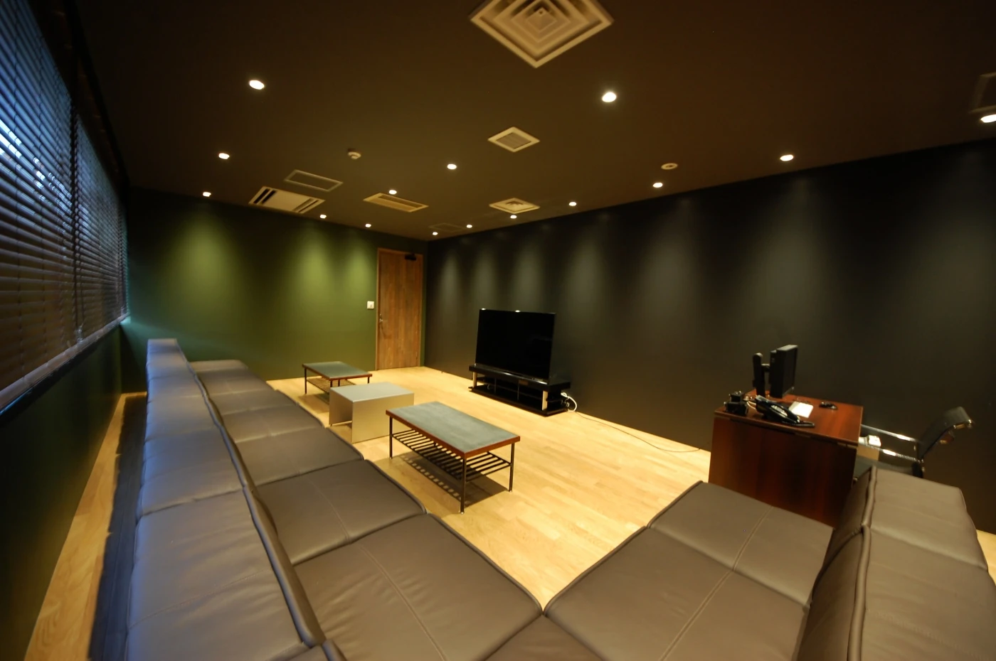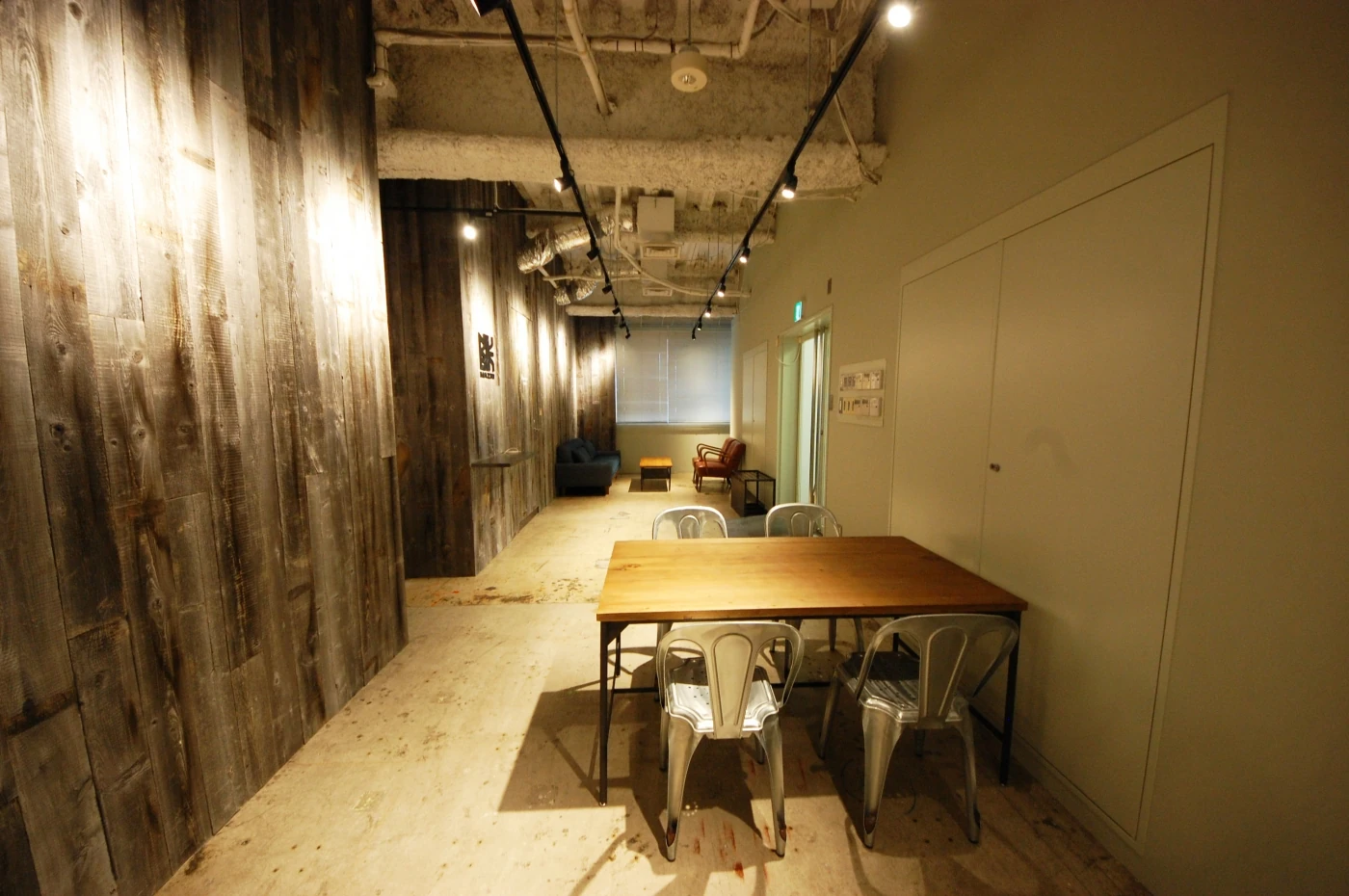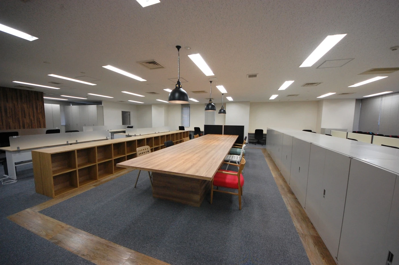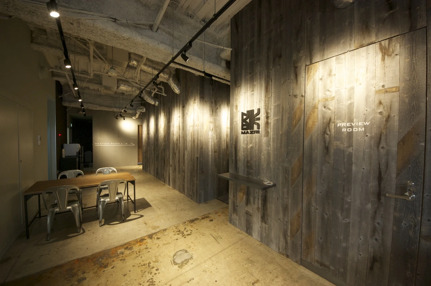 圧倒的な存在感を放つエントランス壁には、アメリカで防風フェンスとして使用されていた古材を使用。また既存天井は解体しスケルトン天井に、床もOAフロアを撤去しコンクリート剥き出しとするなど、オフィスであることを忘れさせるヴィンテージ感のある空間デザインを行いました。製作された映像の試写やお打合せに使う映像試写室は、壁面のタイルや特注のレザーソファ、床のフローリングなどラウンジのような雰囲気に。またワークスペースの中央には大型のテーブルを設置、社内打ち合わせや外部パートナーの方の作業など多目的にお使いいただけるオフィスデザインとなっております。