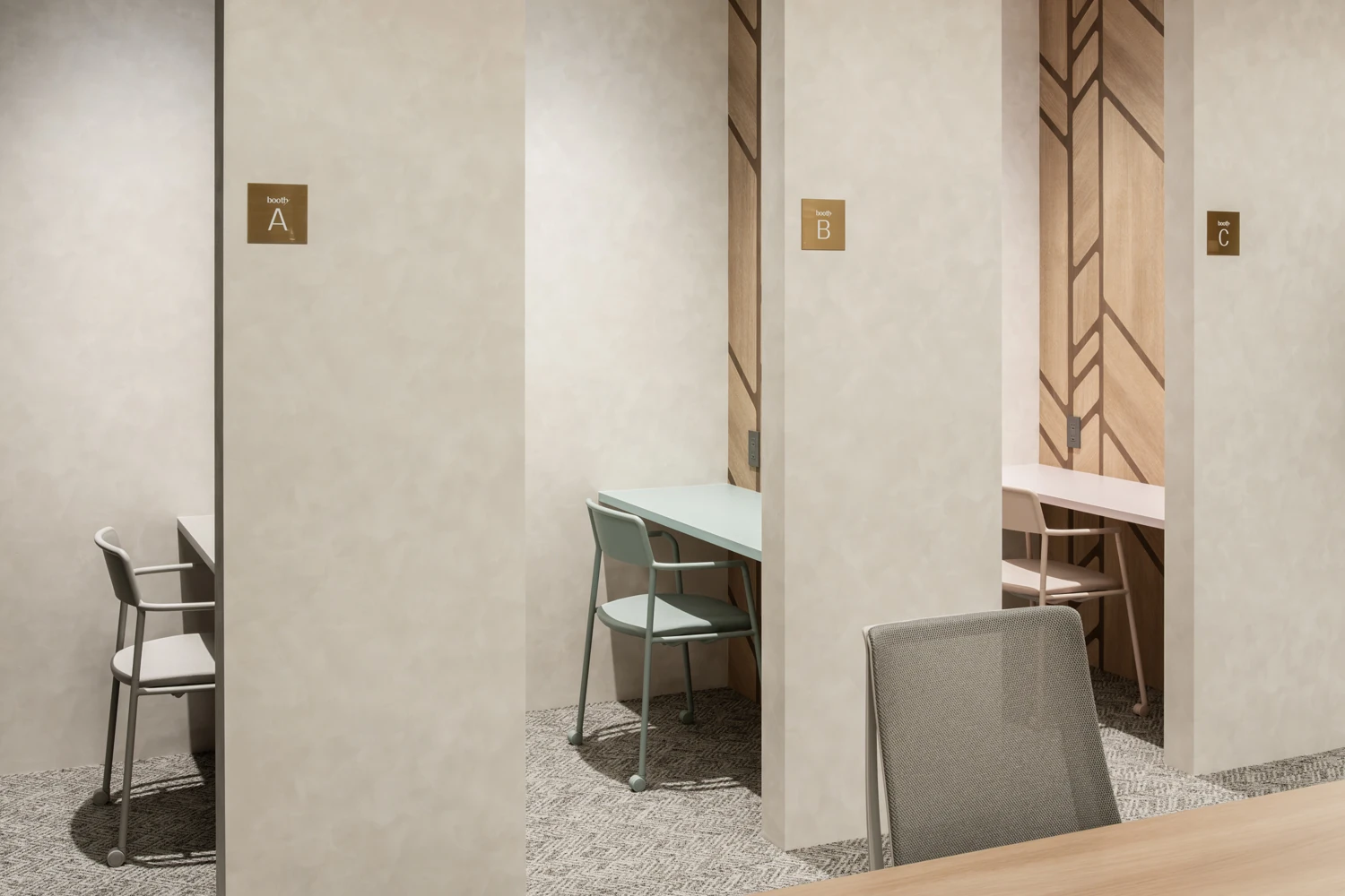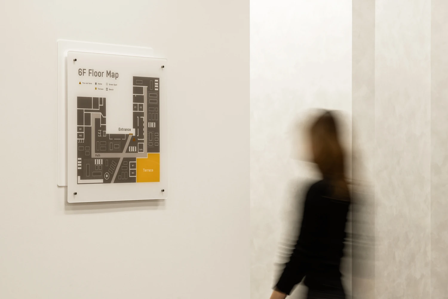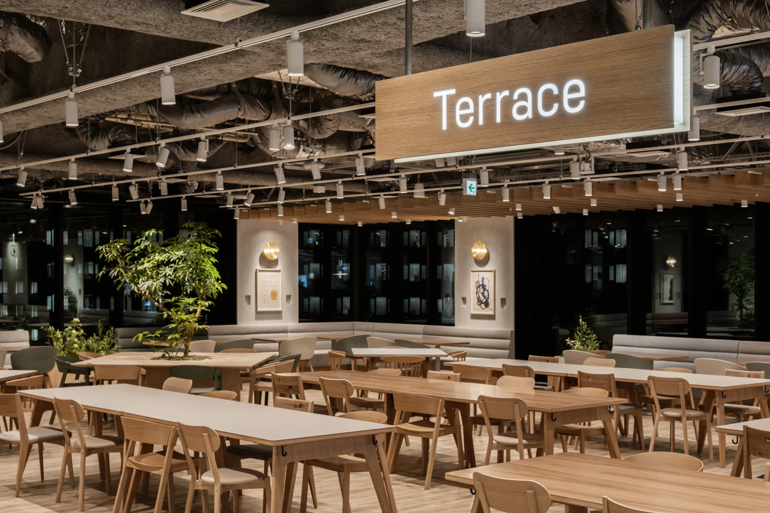 テラスやガーデンのような外の心地よさを感じられる素材や色調を取り入れ、部署間や個人の交流が自然に生まれるエリアを計画。サイン計画も「交流」と「外を感じる」を軸に、規律性を保ちながら自然のリズムを感じる図柄でまとめ、『Social Terrace』の世界観を空間全体に反映しました。