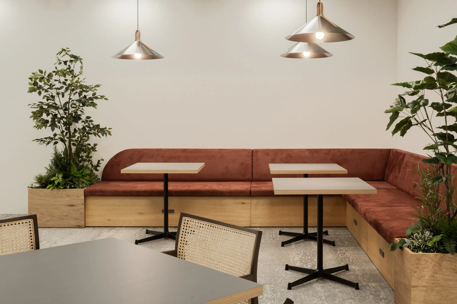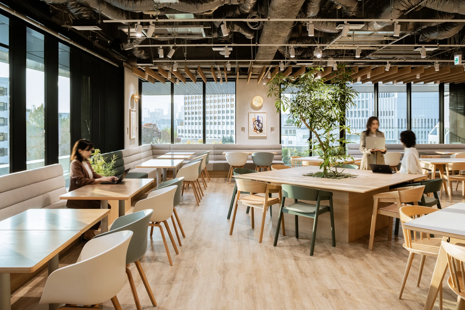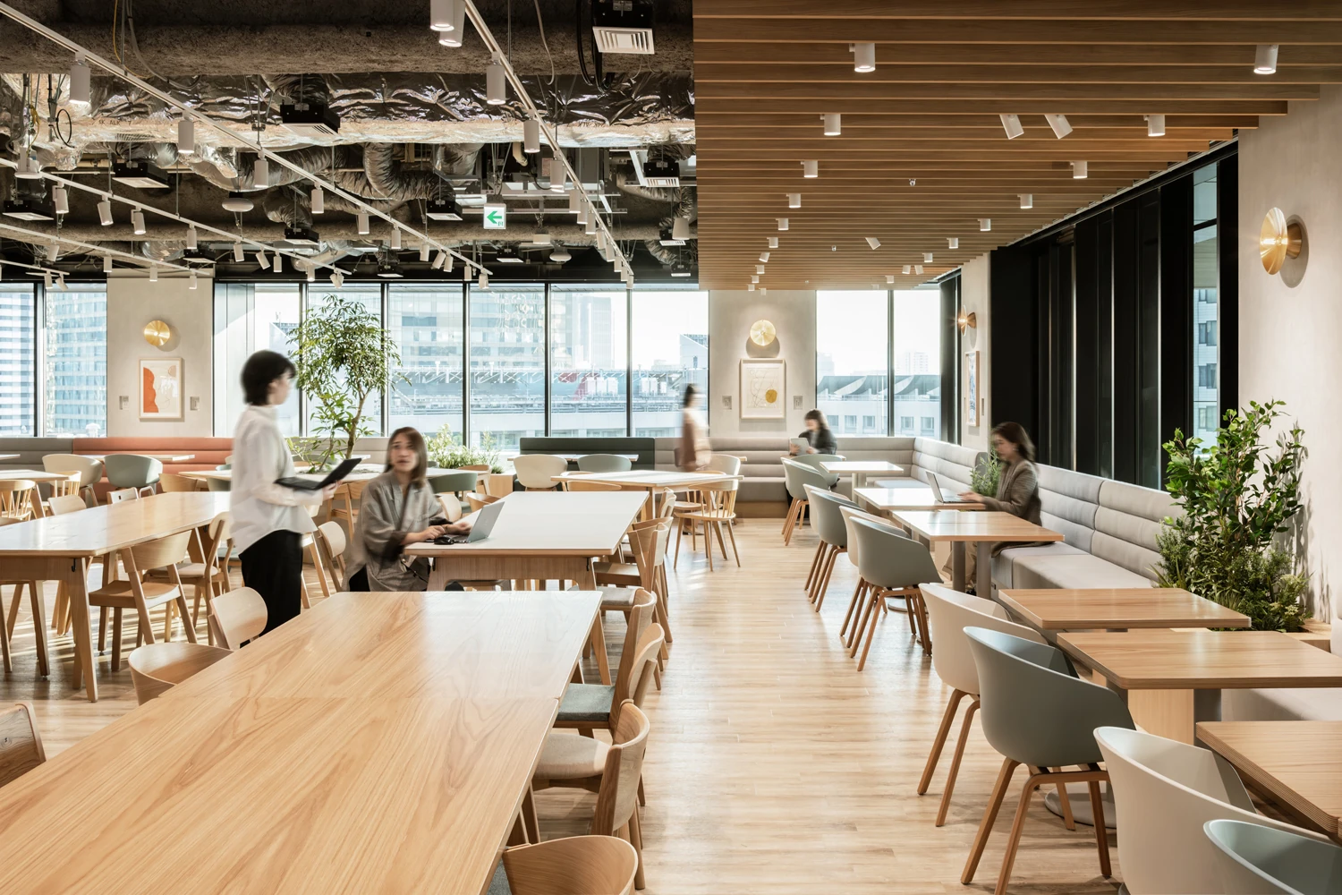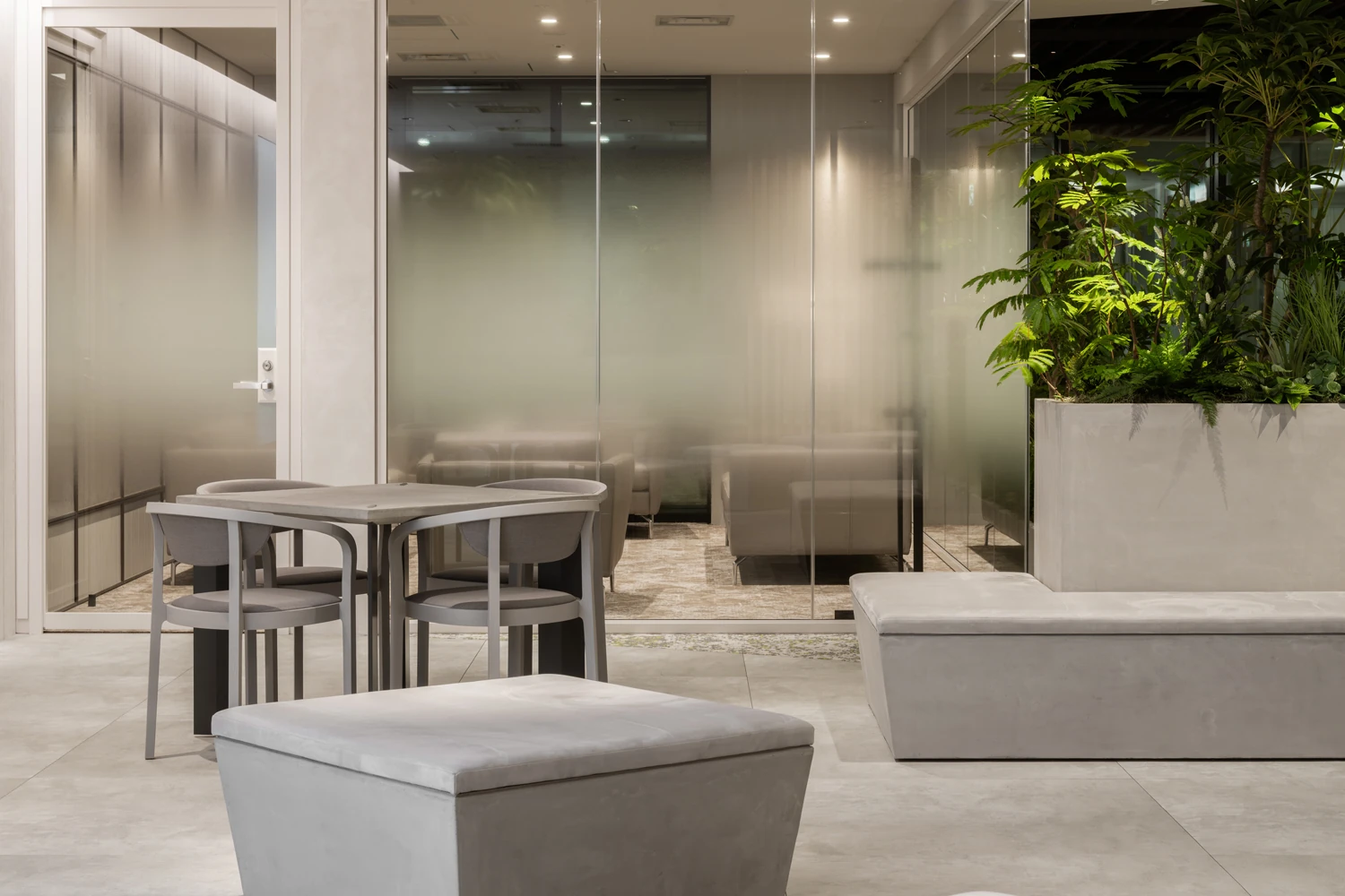 テラスやガーデンのような外の心地よさを感じられる素材や色調を取り入れ、部署間や個人の交流が自然に生まれるエリアを計画。サイン計画も「交流」と「外を感じる」を軸に、規律性を保ちながら自然のリズムを感じる図柄でまとめ、『Social Terrace』の世界観を空間全体に反映しました。