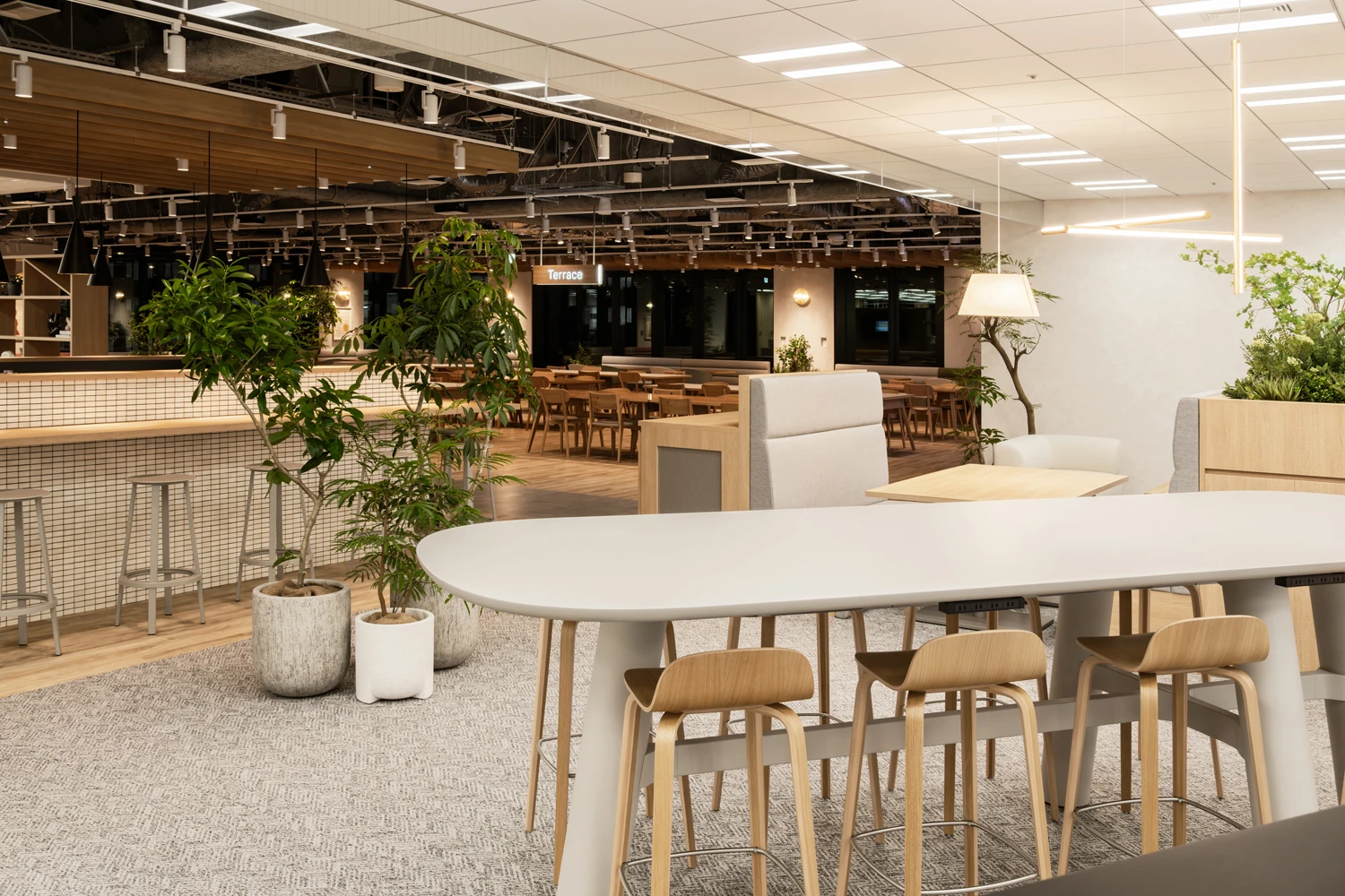 『WORK DESIGN PLATFORM』を活用し、現状を定量・定性的に可視化。さらに、トップインタビュー、ワークショップを通じて得た「部署や年齢を越えて交流したい」「気分転換しながら前向きに働きたい」という声を起点に、『Social Terrace』というコンセプトを設定しました。自分の部署という“家”から外へ開き、テラスを介して隣のチームや社外、未来へとつながっていく新しい働き方を象徴する場を目指しました。