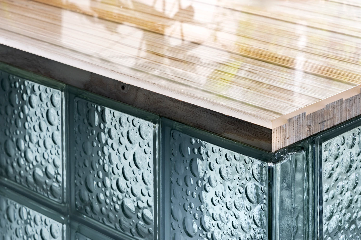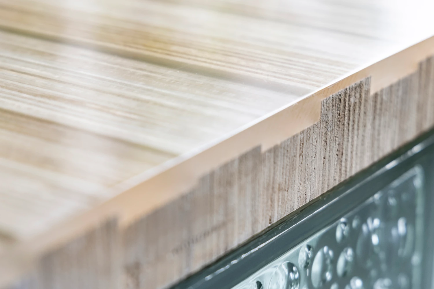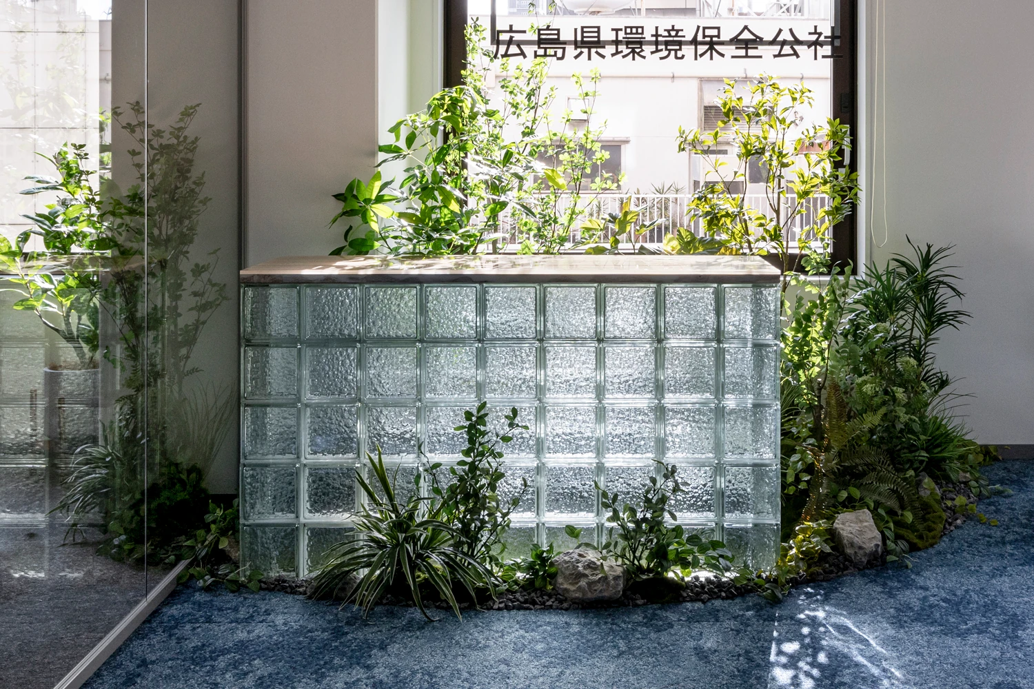 広島・瀬戸内の地域性と、環境保全に取り組む公益法人としてのブランドイメージを空間に体現するため、素材選定ではサステナビリティを重視。来訪者に語れるストーリーと長く愛着を持てる価値をもたせています。なかでも、エントランスで強い印象を放つ受付台は廃材となったLVL材を加工し、天板として再利用。新たな価値を持つ家具として生まれ変わらせています。