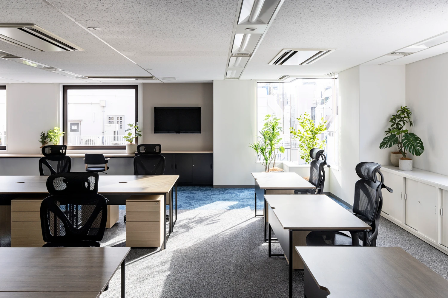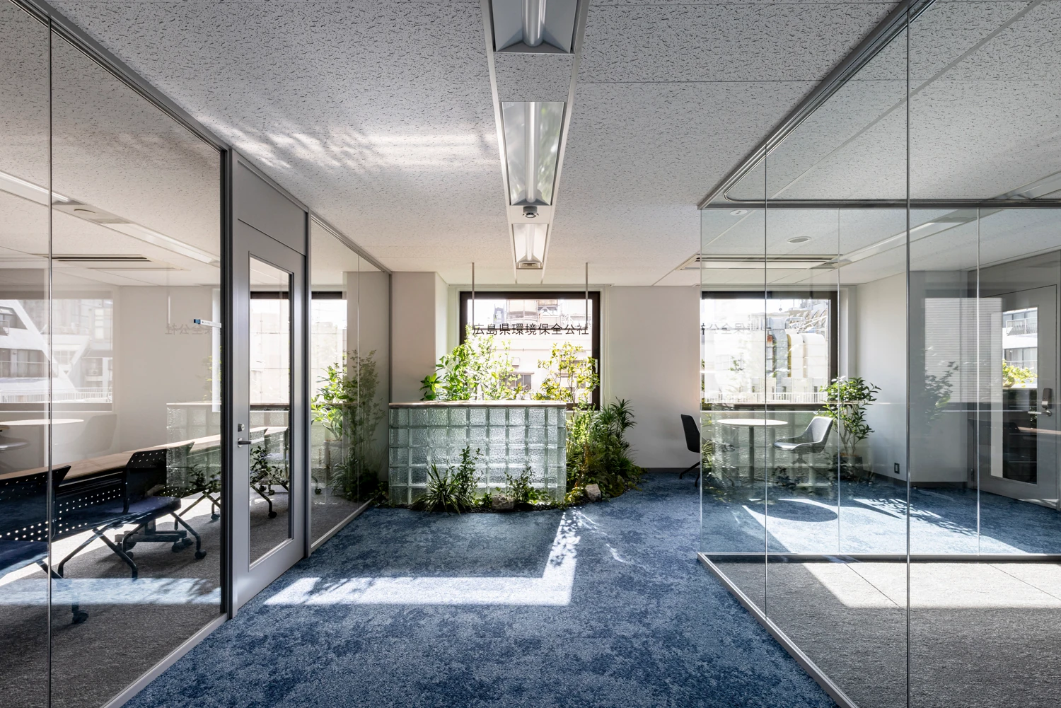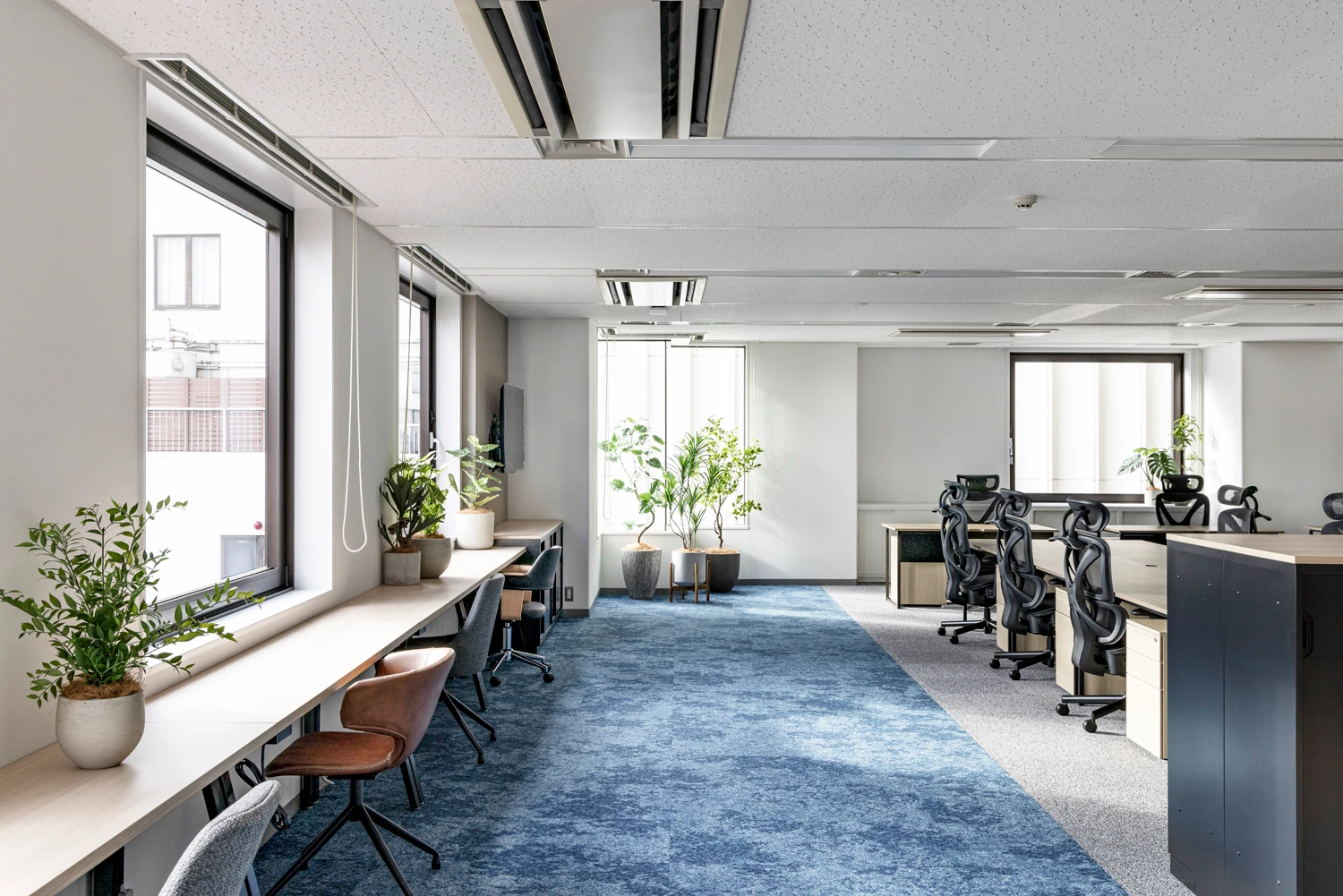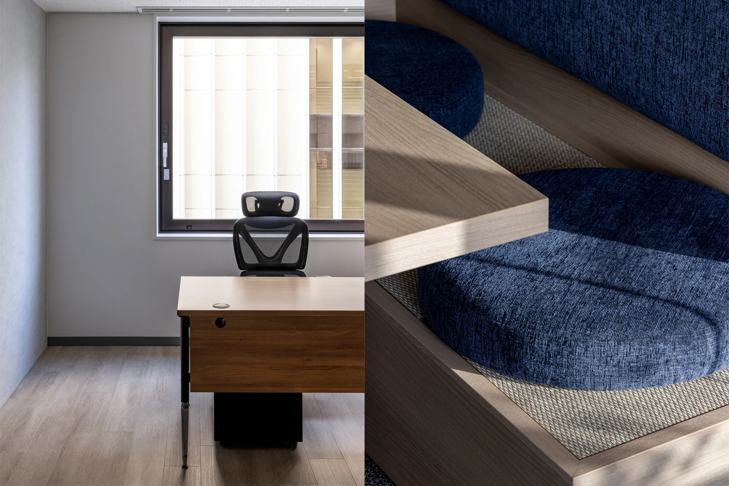 レイアウトは、ゆとりある寸法計画と十分な余白を確保し、将来の運用変更にも柔軟に対応できる構成を採用。窓面側にはリフレッシュスペースを集約し、受付から奥までガラス越しに視線が抜けることで、空間全体に広がりを演出しています。ワークエリアは広めに確保し、デスク間の幅を大きくとることでゆとりを持ちながら働くことができるだけでなく、将来の増員にも対応できる設計に。エントランス周りに会議室をまとめることで、ワークエリアとの距離を保ち、遮音性にも配慮しています。 また、瀬戸内海を想起させるブルーの床材やカーテンをアクセントに、少ない要素で豊かさを感じられるデザインとしています。