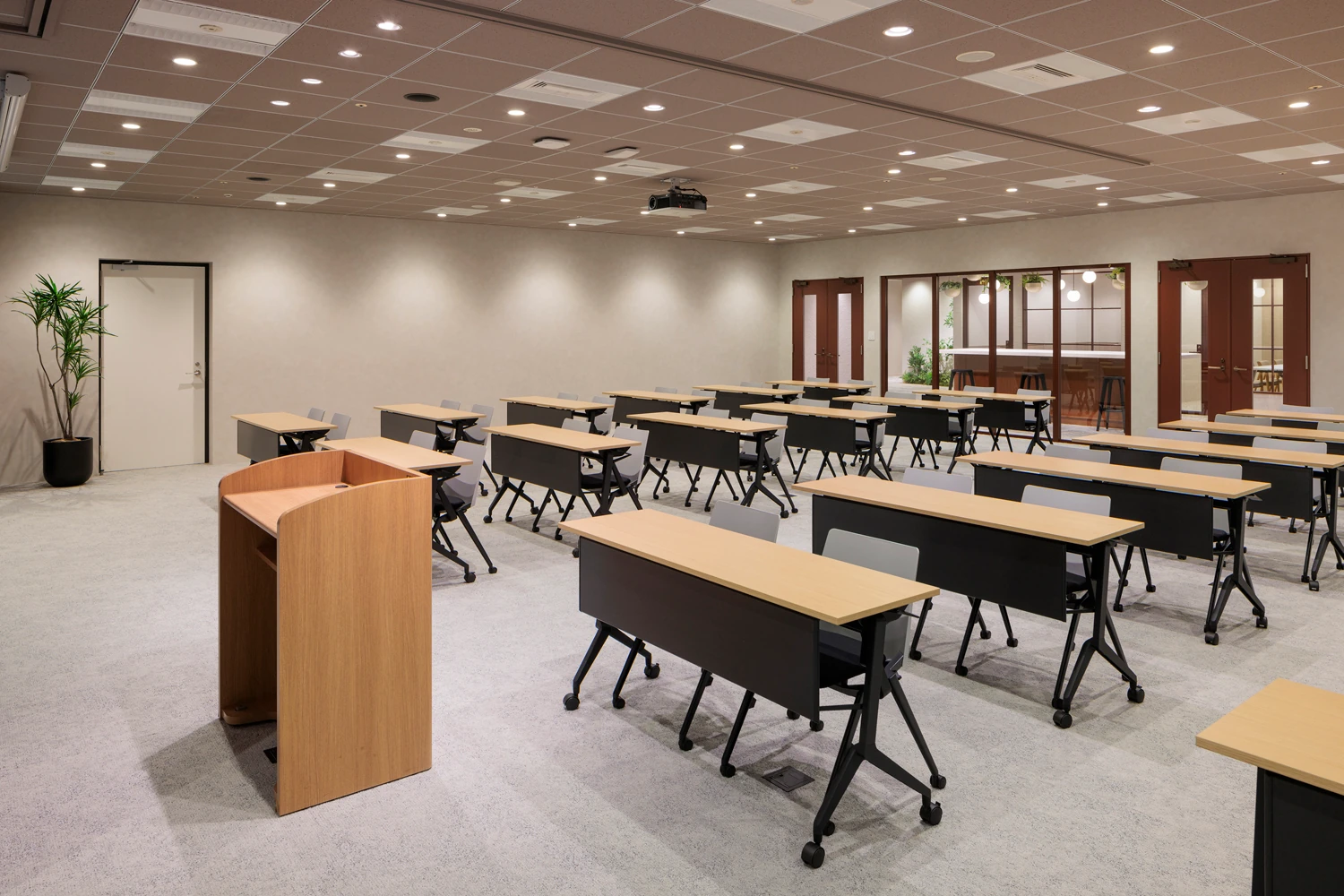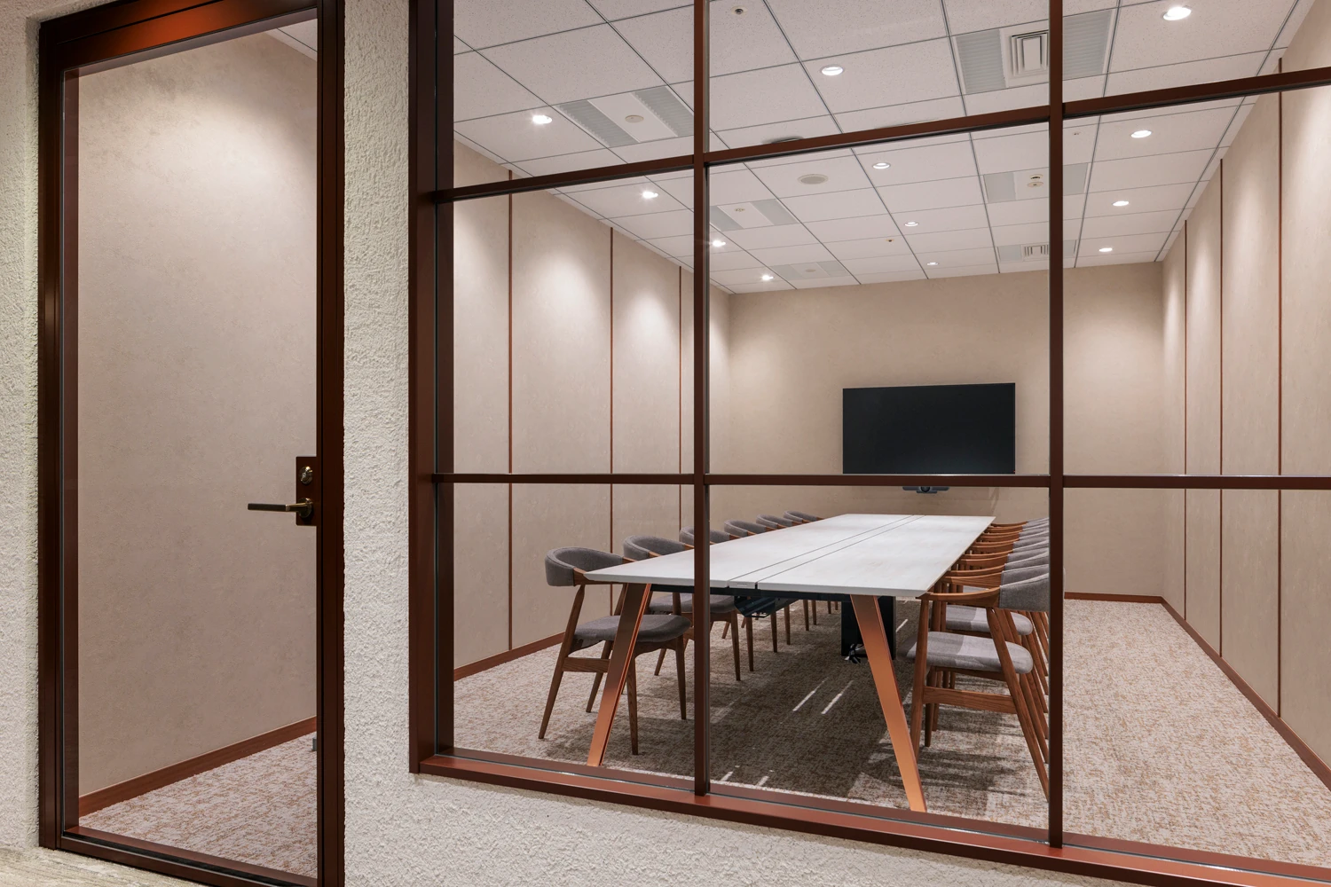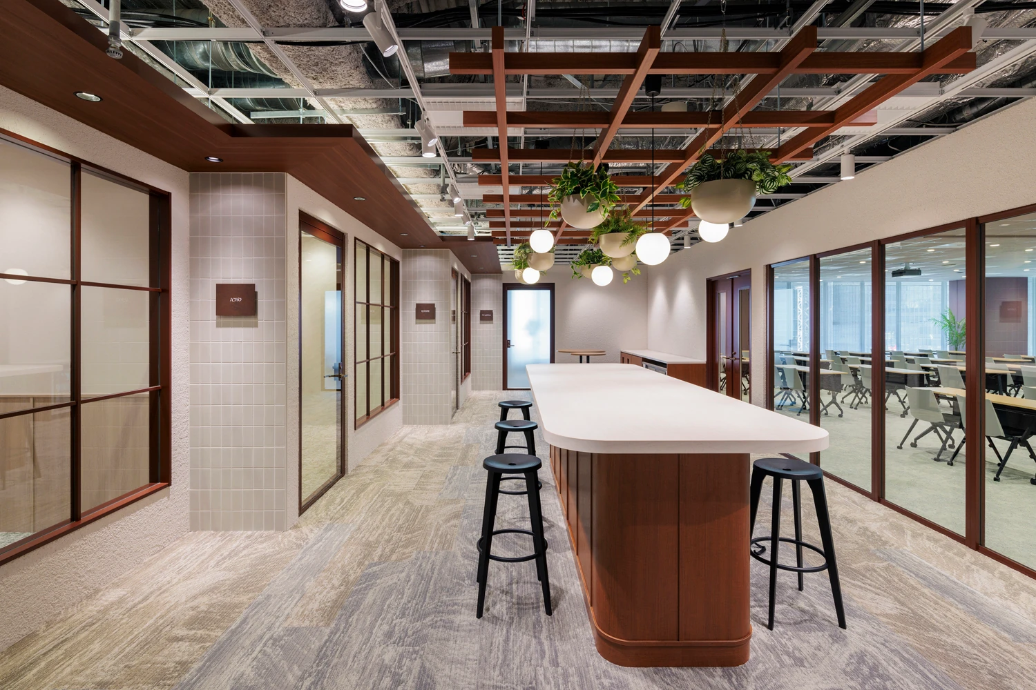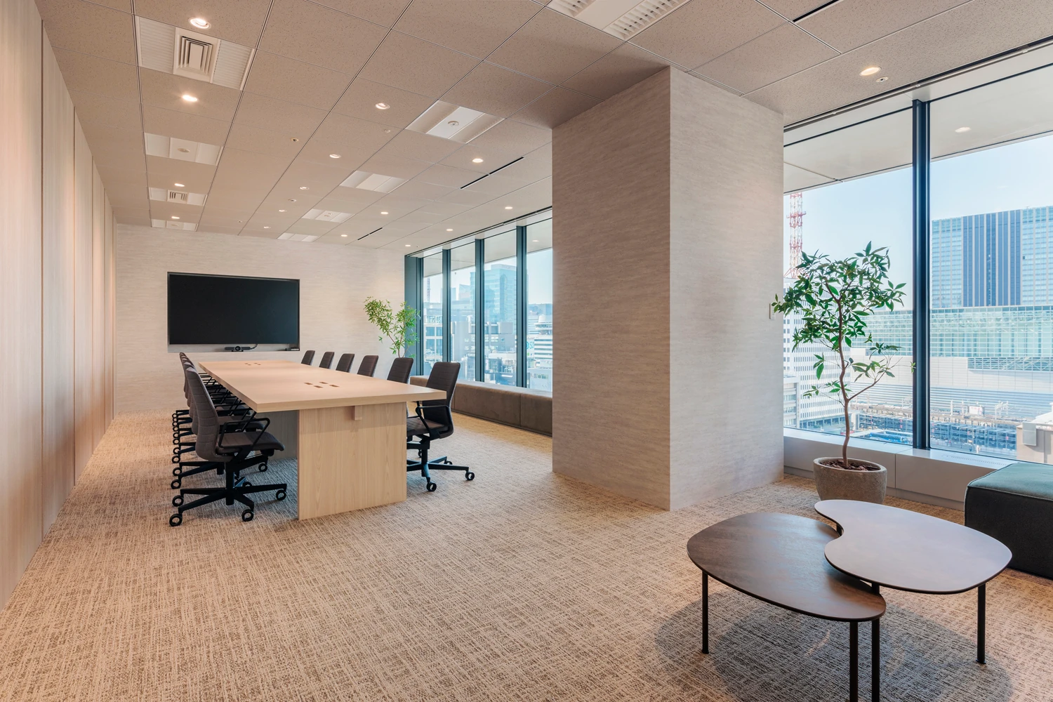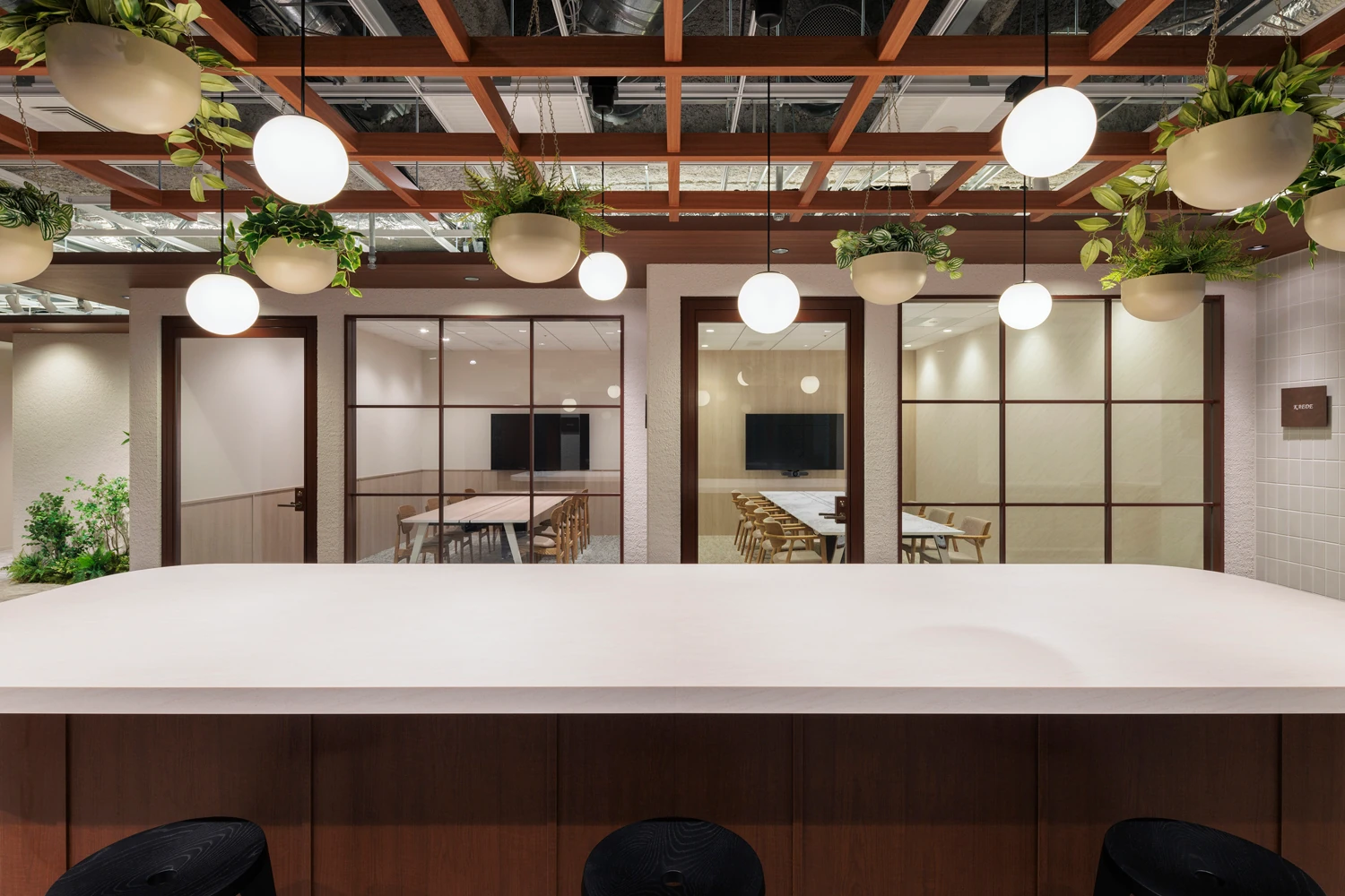 会議室エリアは、単なる機能空間ではなく「交流と発信の拠点」として再構築することで、このコンセプトを最も象徴的に体現する場に。人々が憩うパーゴラや家々が連なる街並みの風景をモチーフに、各会議室にはそれぞれ異なる個性をもたせ、大小の会議室をリズムよく配置することで視線や動きに変化を生み、エリア全体に奥行きと広がりをもたらしています。