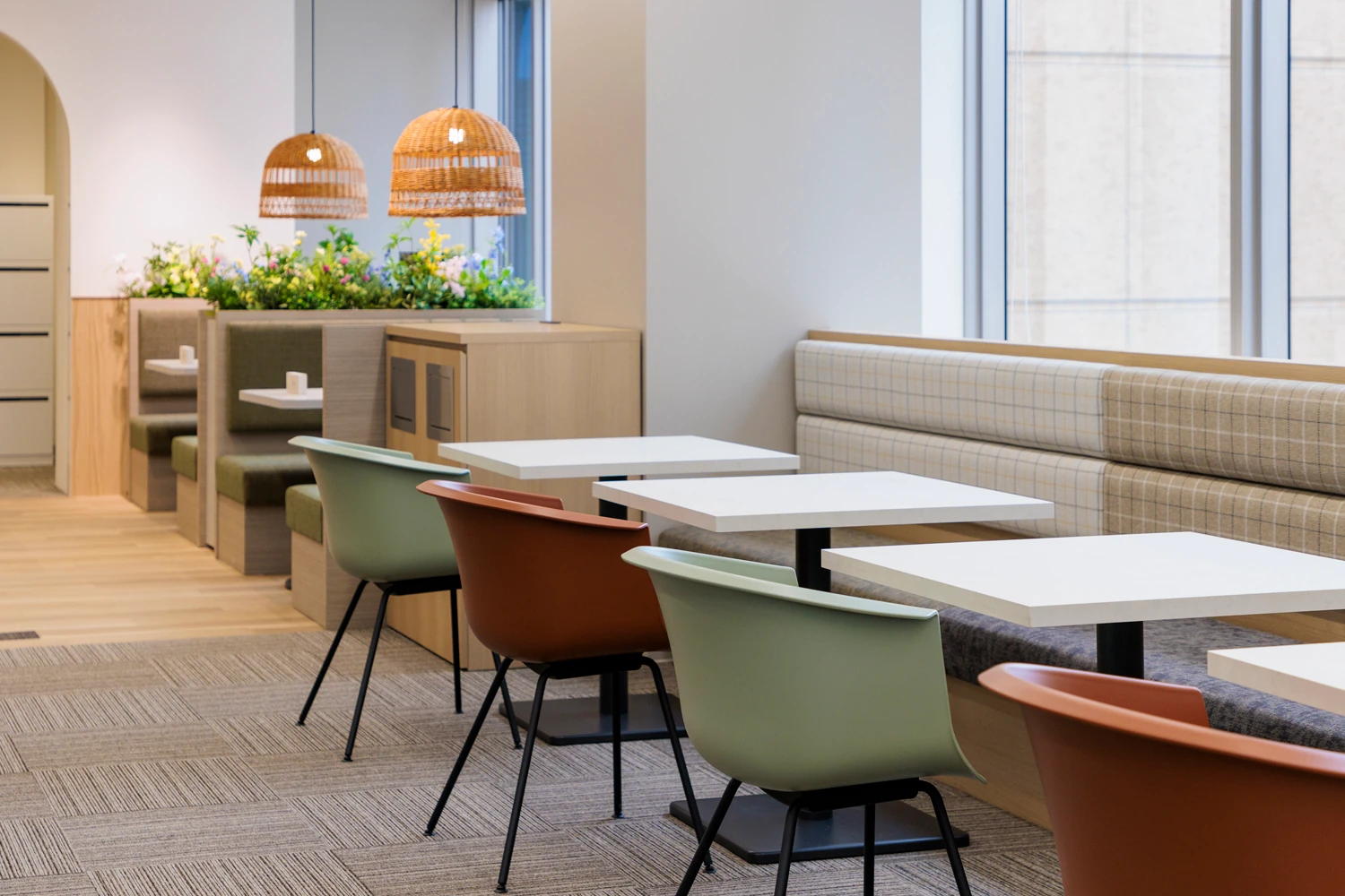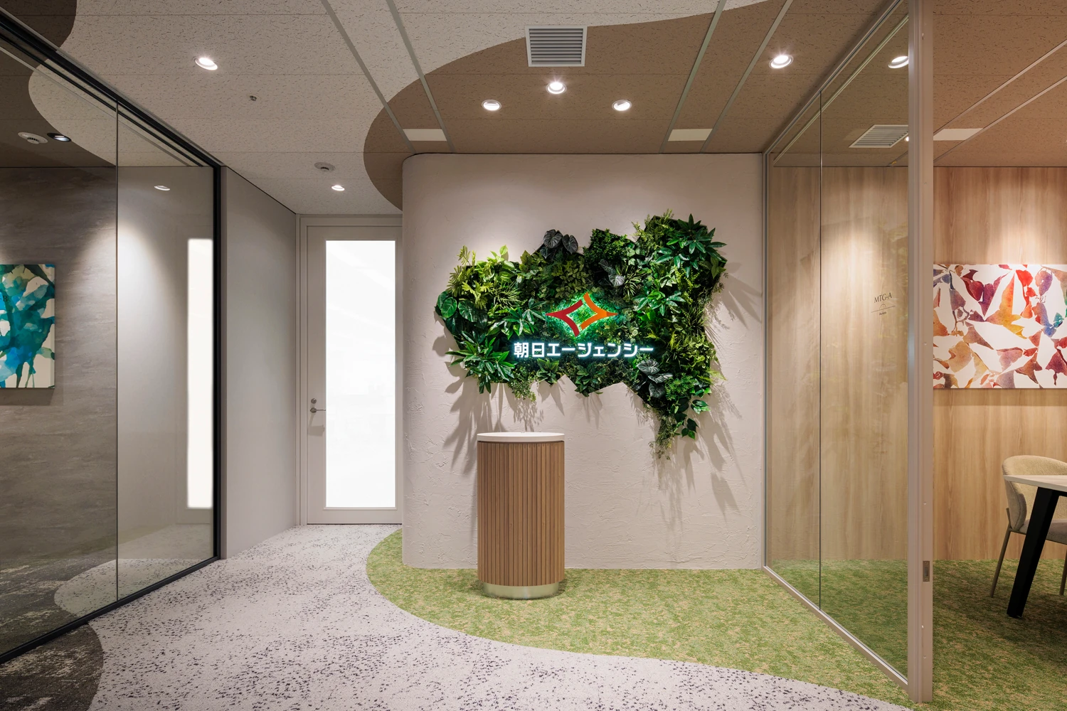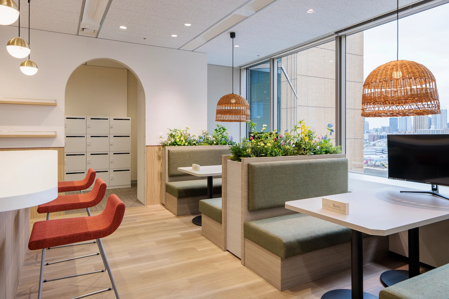 明るく開放的で、風が通り抜けるような空間を実現するため、間仕切りが必要なエリアはオフィスの中央に集約。これにより、どこにいても外光が届くレイアウトとしています。あわせて主動線を明確に設計し、その流れに沿ってファミレス席や集中席など多様なワークポイントを配置。目的や気分に応じて、自然に働く場所を選べる環境を整えました。エントランス正面には、生命力を感じさせるグリーンを大胆に配置し、会議室には「葉」や「土」をモチーフにしたデザインやアートを取り入れるなど、コンセプトである『Bloom』を視覚的に表現しました。働く時間の中に小さな発見や楽しさが生まれる、そんな空間を構築しています。