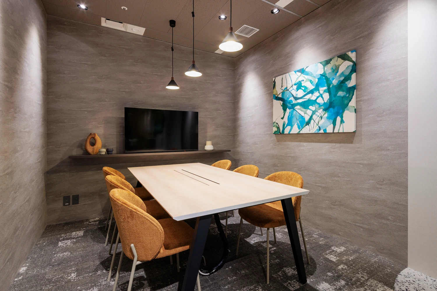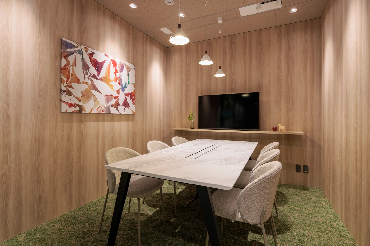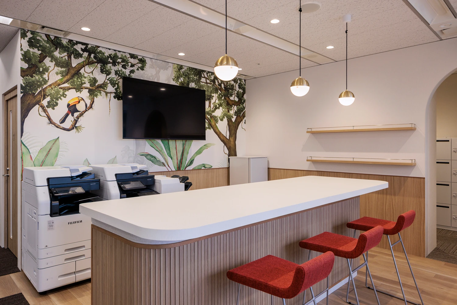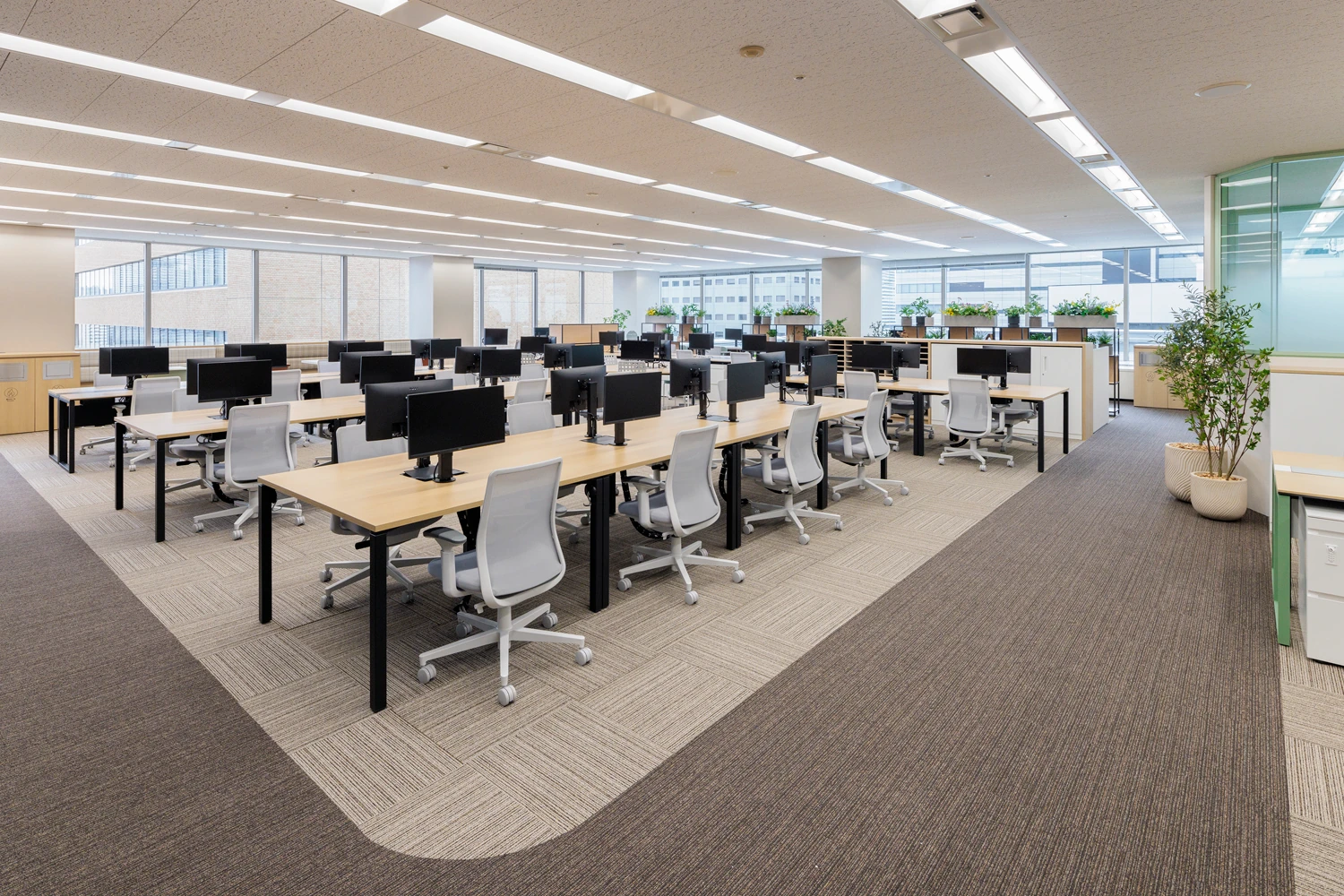 明るく開放的で、風が通り抜けるような空間を実現するため、間仕切りが必要なエリアはオフィスの中央に集約。これにより、どこにいても外光が届くレイアウトとしています。あわせて主動線を明確に設計し、その流れに沿ってファミレス席や集中席など多様なワークポイントを配置。目的や気分に応じて、自然に働く場所を選べる環境を整えました。エントランス正面には、生命力を感じさせるグリーンを大胆に配置し、会議室には「葉」や「土」をモチーフにしたデザインやアートを取り入れるなど、コンセプトである『Bloom』を視覚的に表現しました。働く時間の中に小さな発見や楽しさが生まれる、そんな空間を構築しています。