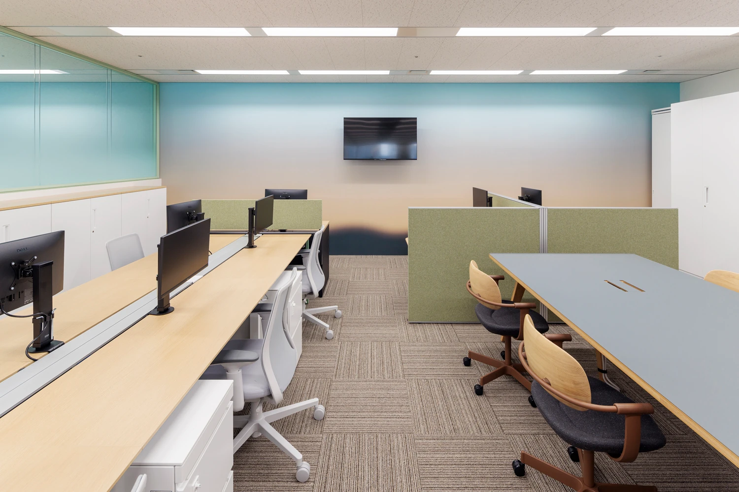 もともと部門を越えて支え合う風土が根づいていた朝日エージェンシー様。新オフィスでは、その文化をより豊かに育てるため、働くリズムに自然とメリハリが生まれる空間を整えました。社員一人ひとりが自分の可能性を広げられる場であると同時に、会社の未来を示す“発信拠点”としての役割も担うオフィスを目指しました。 -