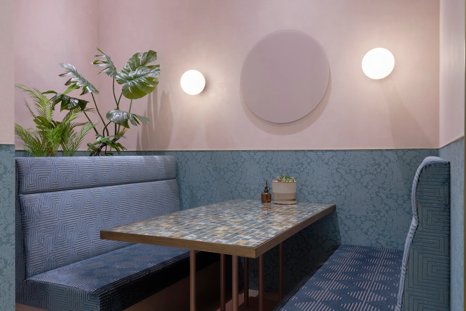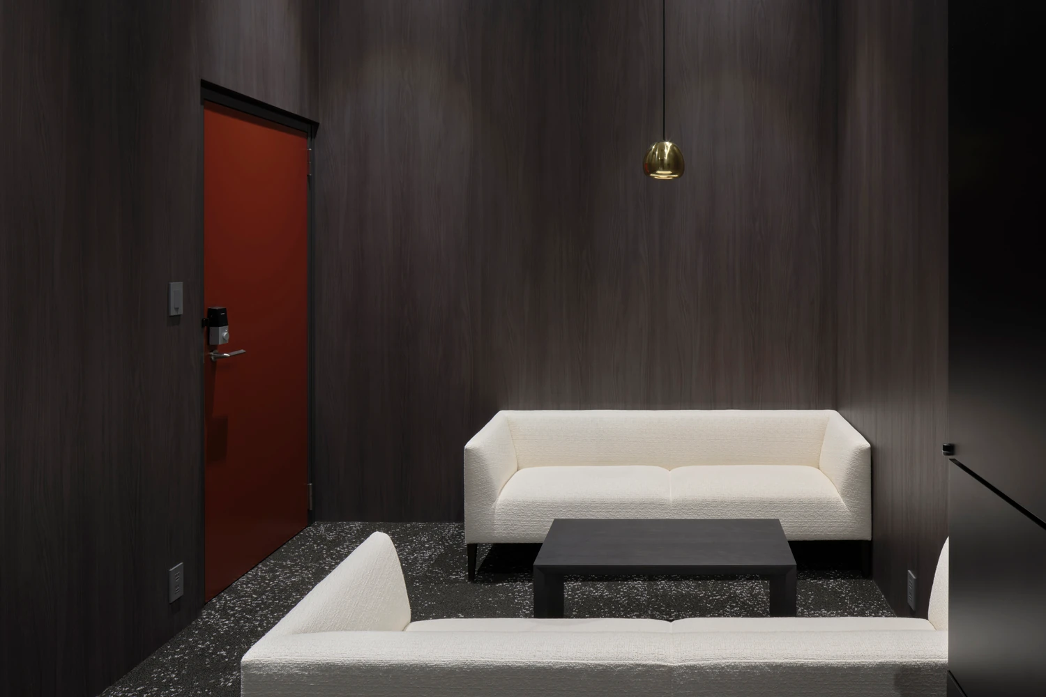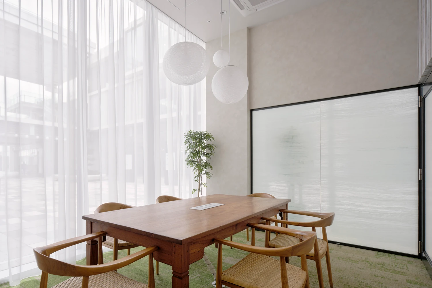 営業、エンジニア、バックオフィスなど、部署ごとに異なる業務特性に合わせて、最適な執務環境を丁寧にデザイン。スペースにゆとりを持たせることで、部署間の距離感を心地よく保ちながら、集中と交流のどちらも自然に生まれる構成としています。また、景観への配慮が求められる立地特性を活かし、外部に対しても企業の姿勢が伝わるレイアウトを意識しました。グローバルに活動する企業であることから、世界各地の空気感をまとったエキゾチックさを随所に取り入れました。ビビッドで大胆なマテリアルが映える南米風の部屋、風と緑を感じる東南アジア風の会議室、凛とした和の趣をもつ社長室など、エリアごとに異なる世界観を表現することで、オフィス全体が遊び心に満ちた場所となっています。